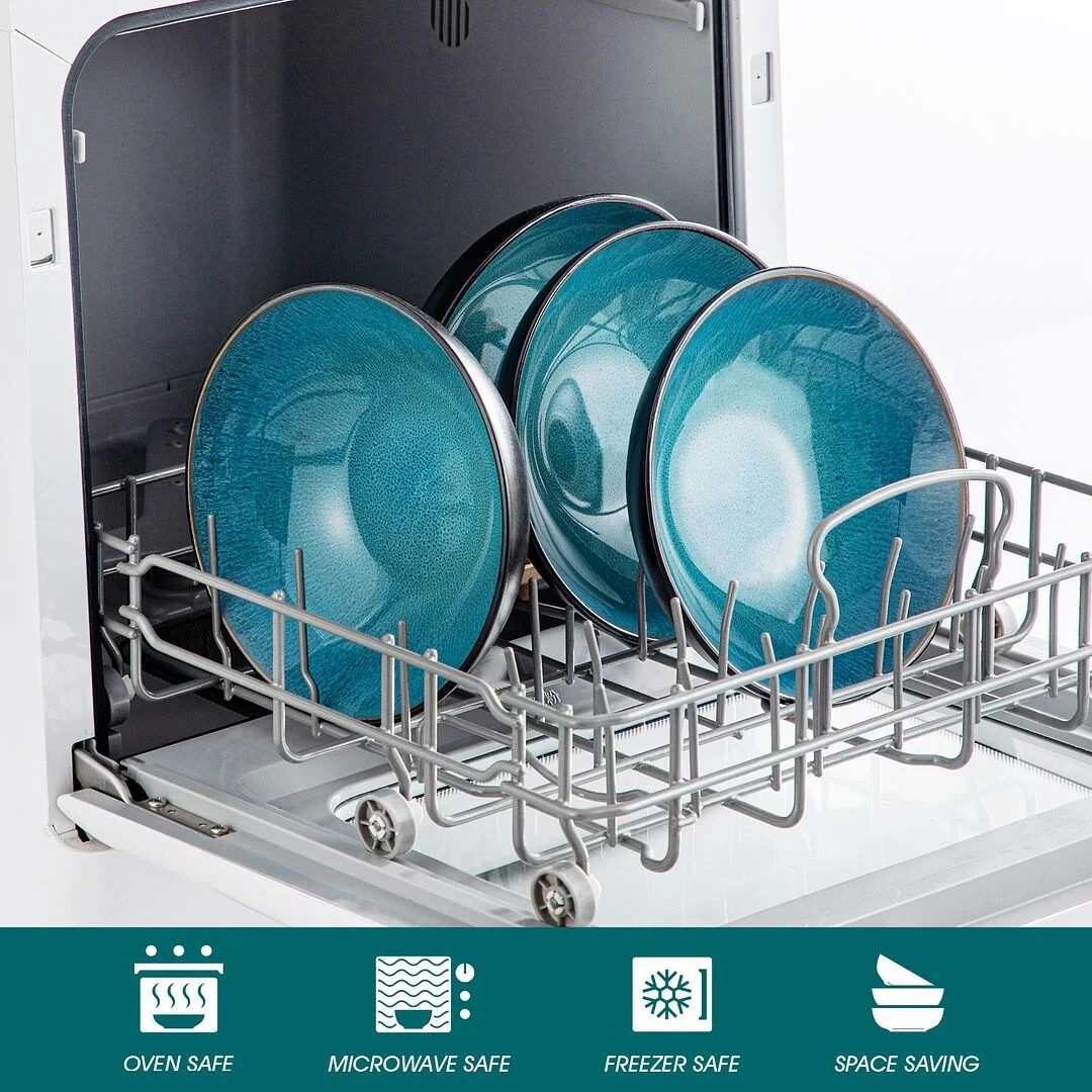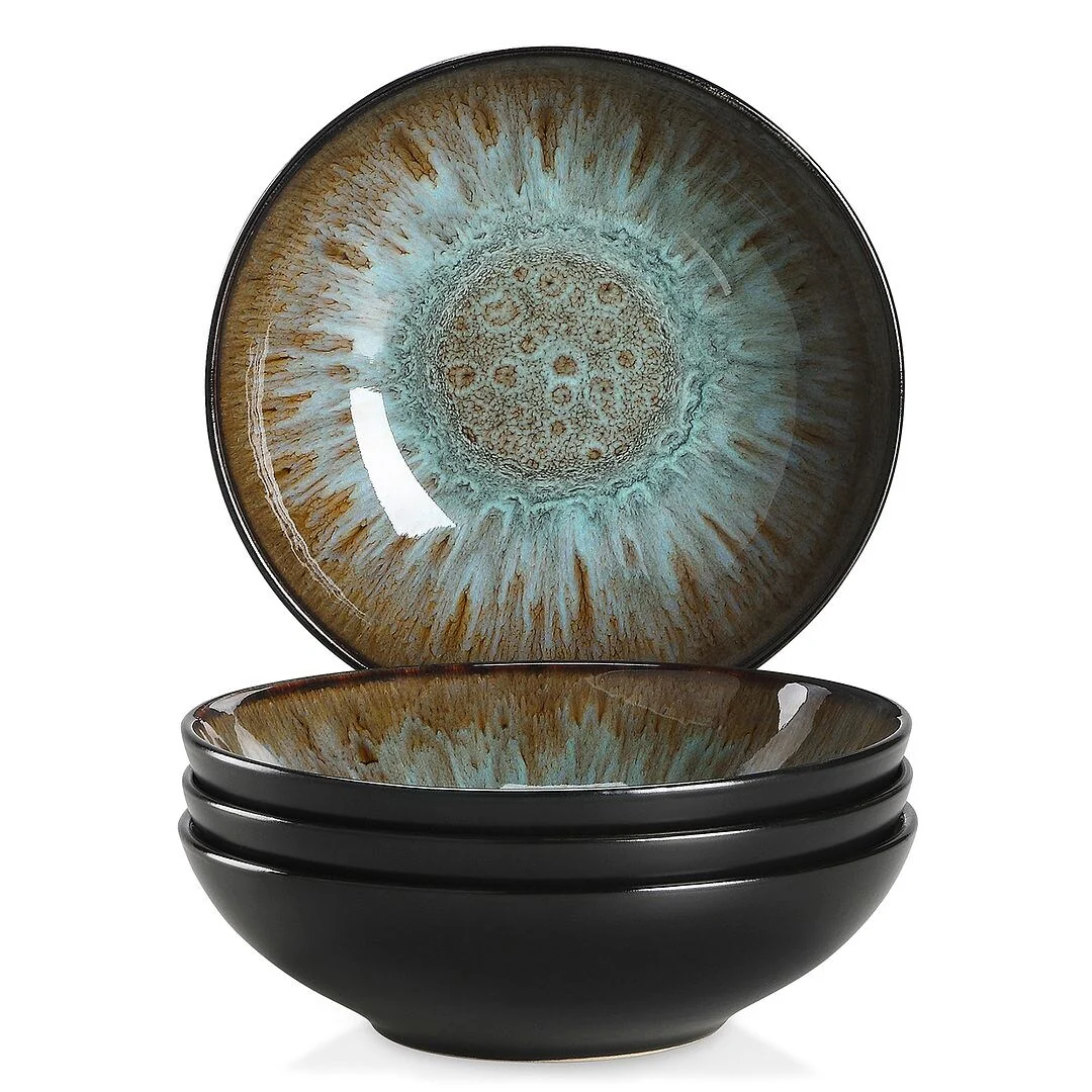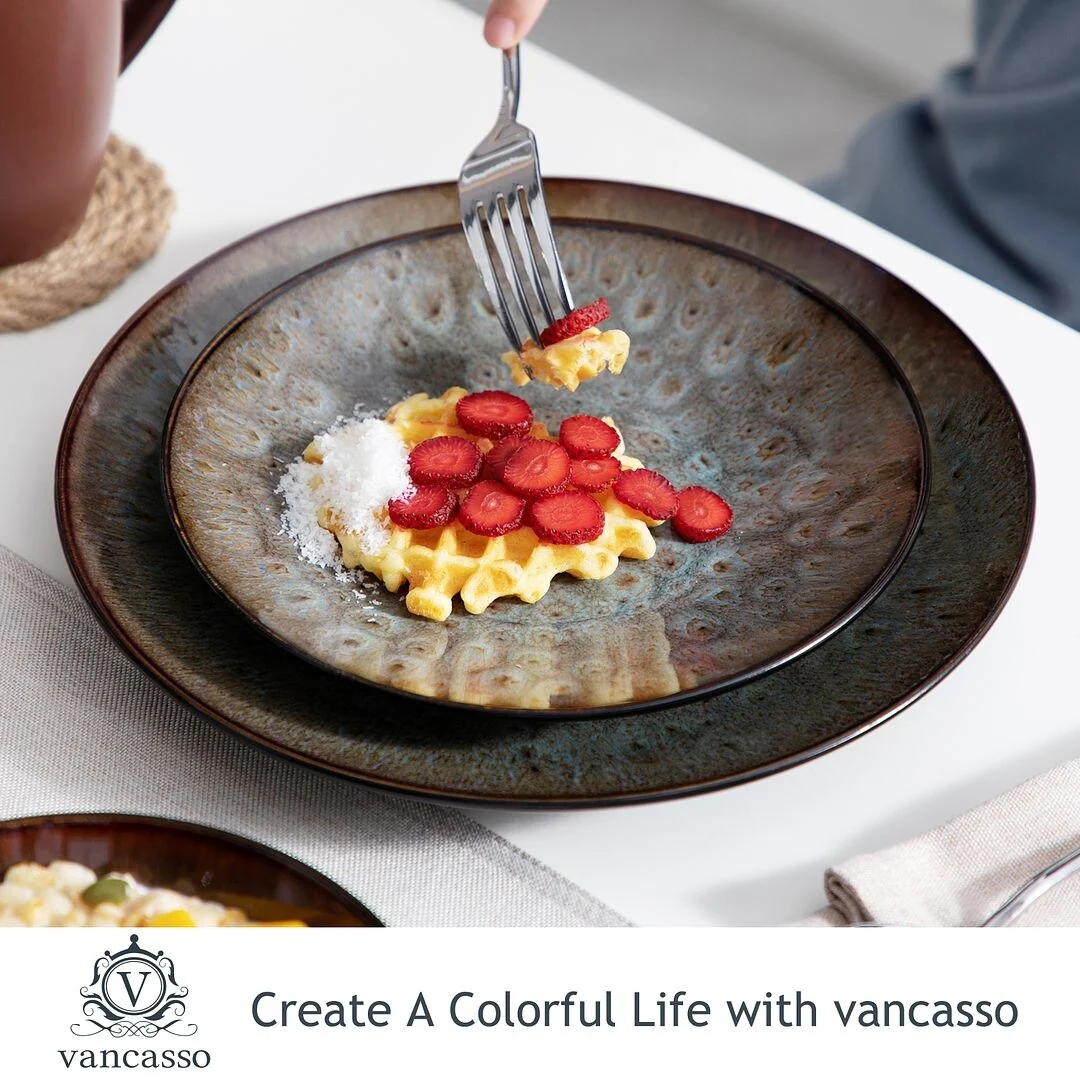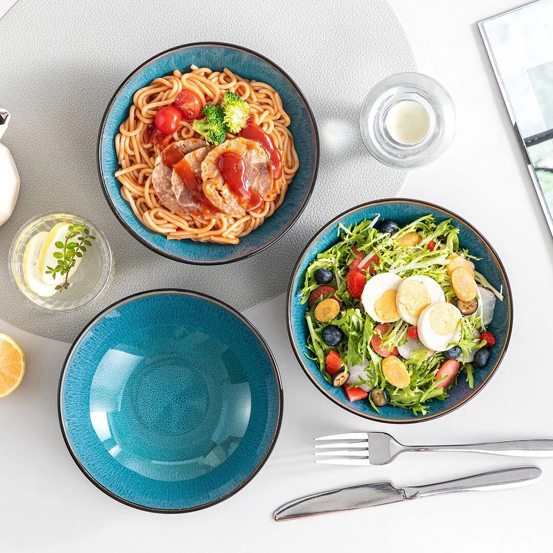 The matte black surface of the plates and bowls with black glazed edges exudes a simple and luxurious design, making every meal a special occasion. Crafted by hand, each piece has its own distinct shape and texture, adding to the set's charm. This set is made of sturdy stoneware and is available in green, brown, and blue. It is dishwasher, freezer, and microwave safe, and the non-glazed bottom provides durability and prevents slipping.