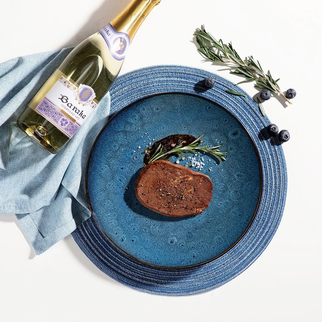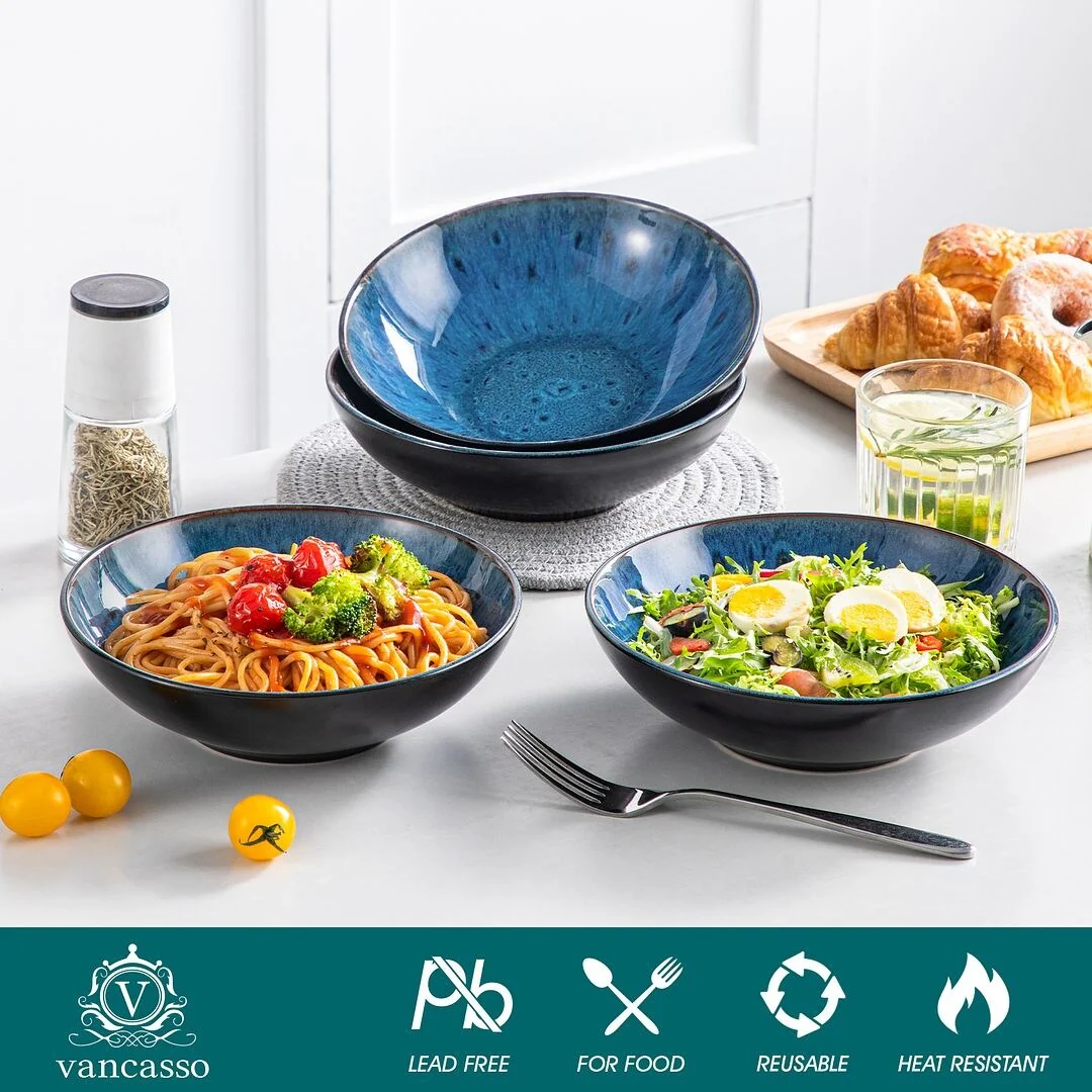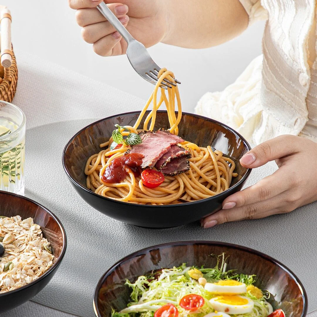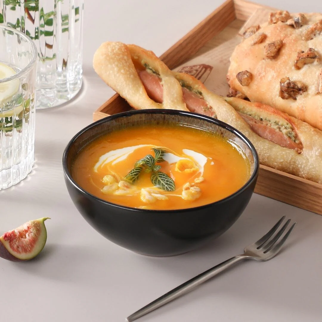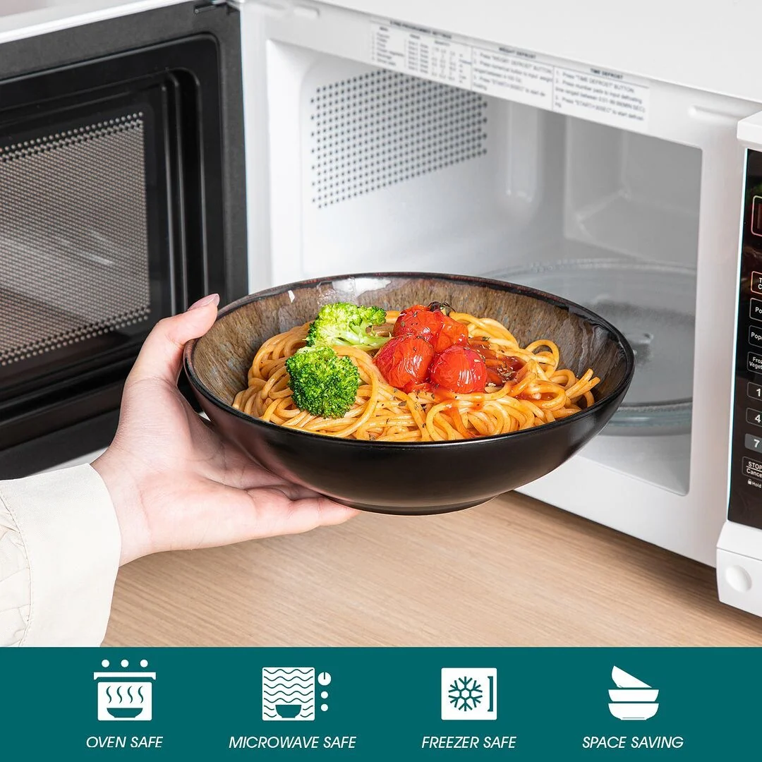 The matte black surface of the plates and bowls with black glazed edges exudes a simple and luxurious design, making every meal a special occasion. Crafted by hand, each piece has its own distinct shape and texture, adding to the set's charm. This set is made of sturdy stoneware and is available in green, brown, and blue. It is dishwasher, freezer, and microwave safe, and the non-glazed bottom provides durability and prevents slipping.
