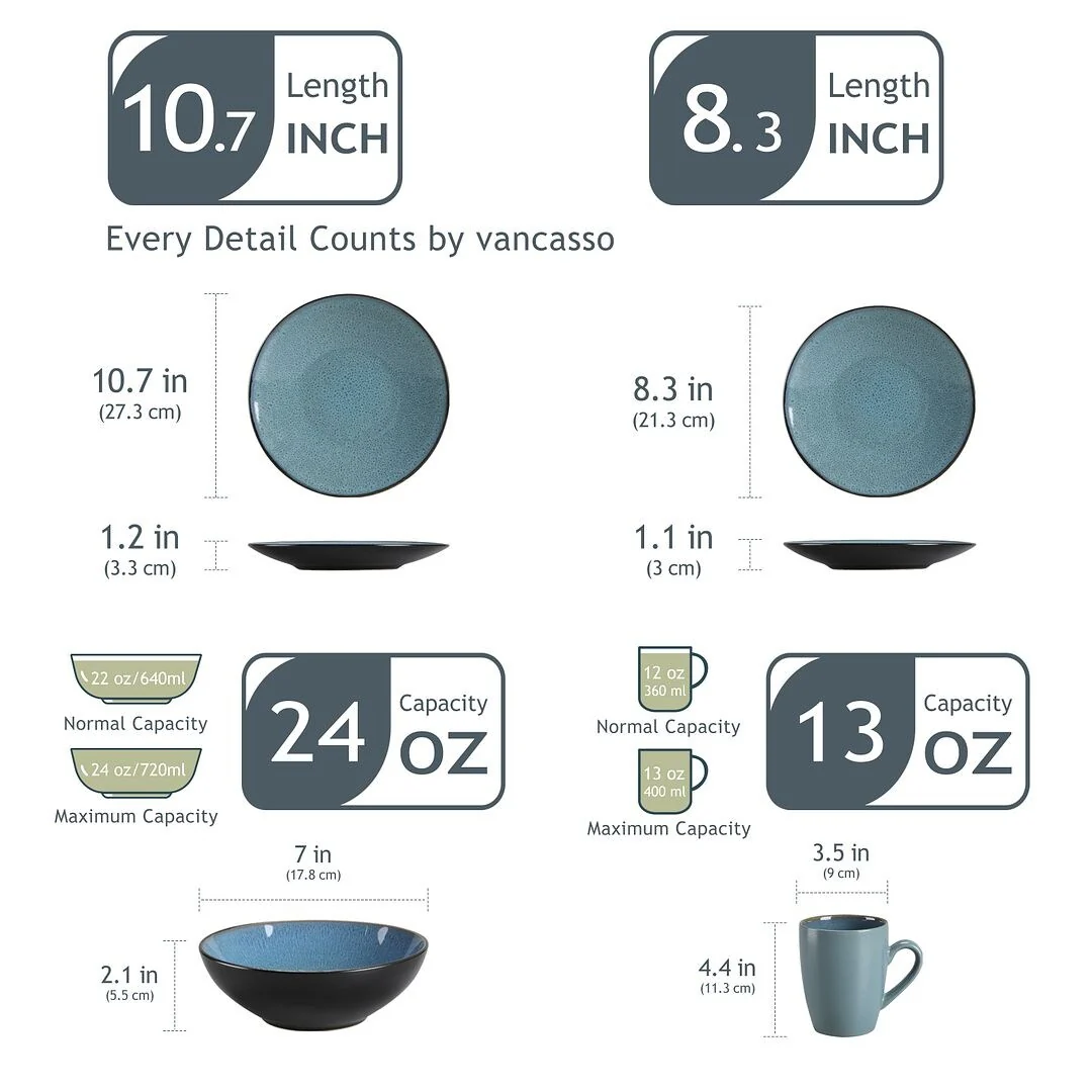 - 16pcs Dinnerware Set: 4pcs 10..5' Dinner plates,4pcs 8.3' Dessert plates,4pcs 7' bowls, 24 Oz.,4pcs coffee mugs, 13 Oz.