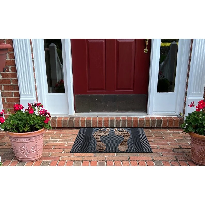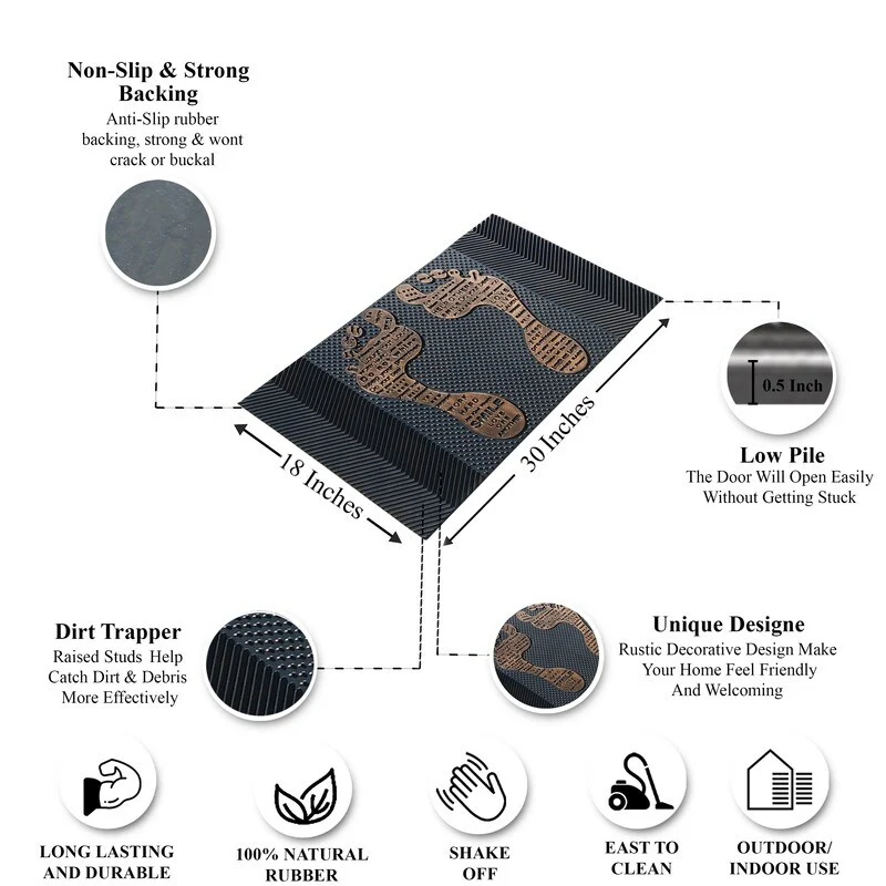 - MATERIAL AND LOW-PROFILE DESIGN: Our home doormat have large number of rubber pin on the surface. it is designed to be durable and sturdy, yet soft.The Low profile doormat measures 18x30' and is 1/2' thick,the door will open easily so forget about curling or getting stuck.