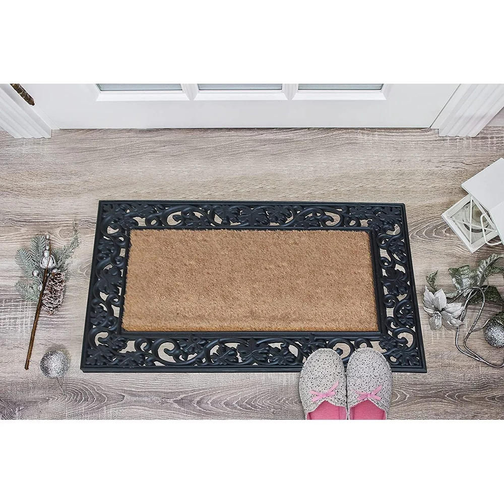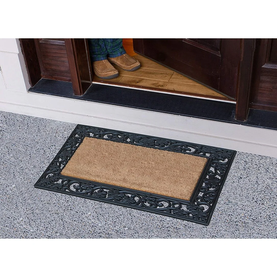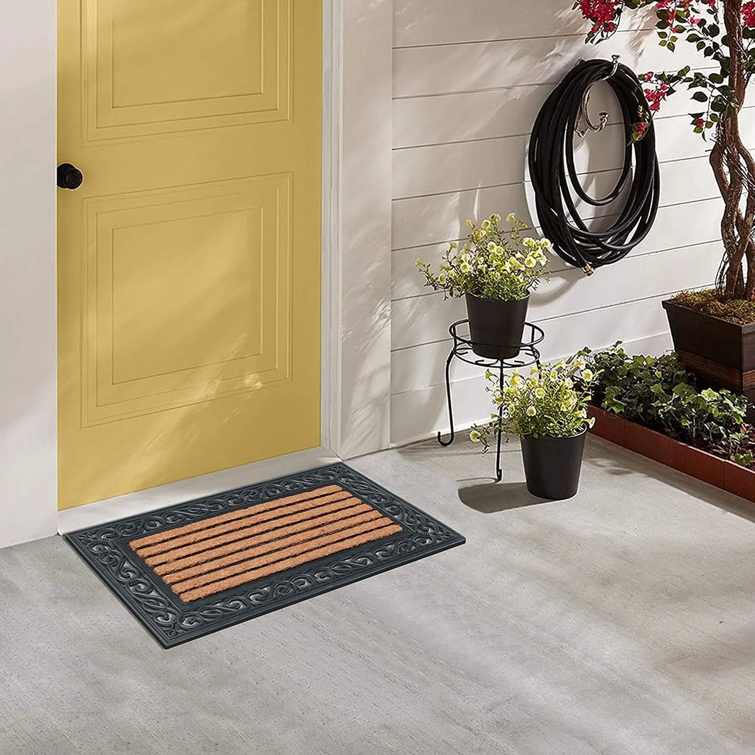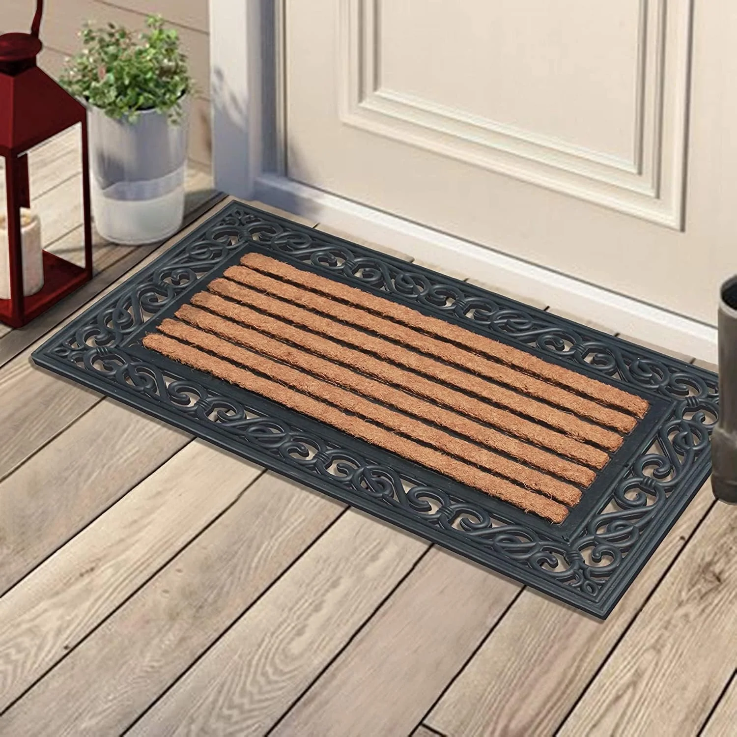 More than a decorative enhancement this rubber & coir molded doormat is made With a heavy rubber backing that anchors it in place while you brush dirt & debris from shoes & boots. The tufted coco-fiber facilitates scrubbing soles clean.