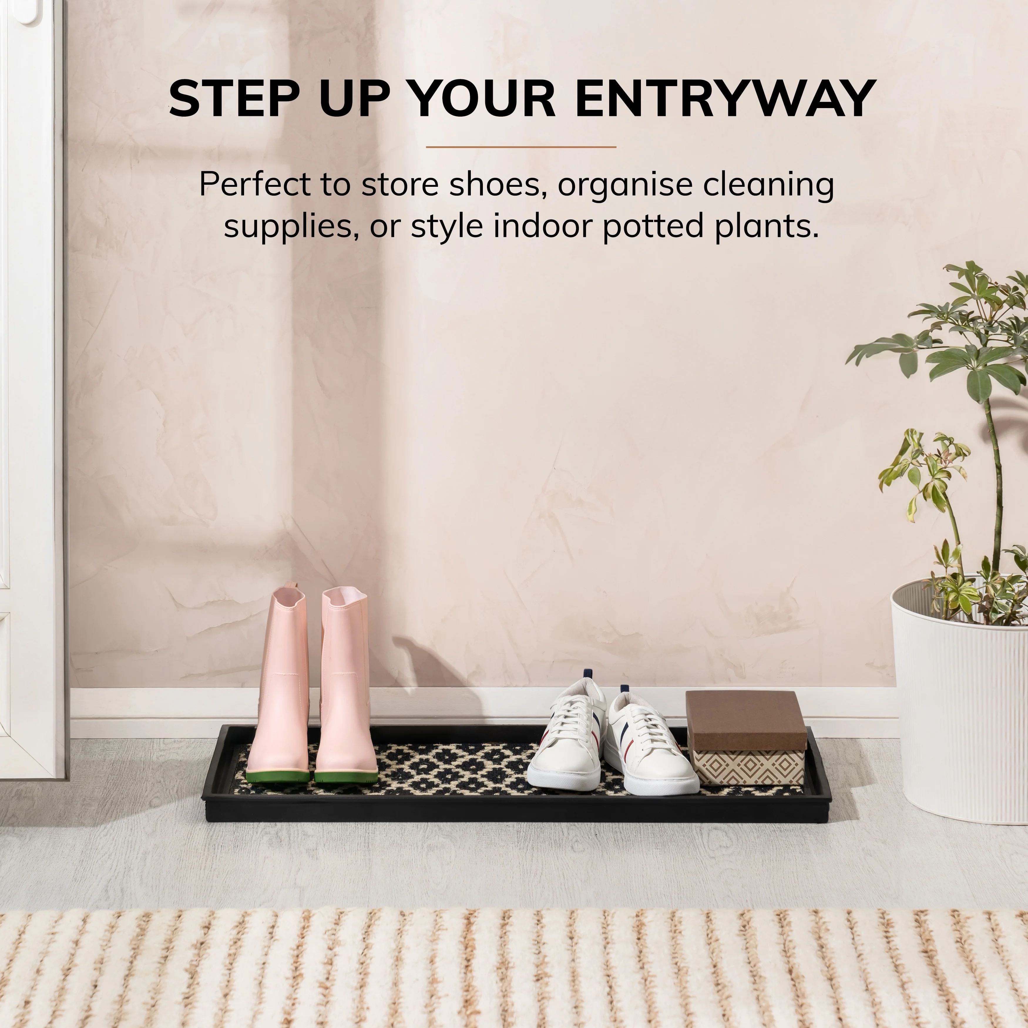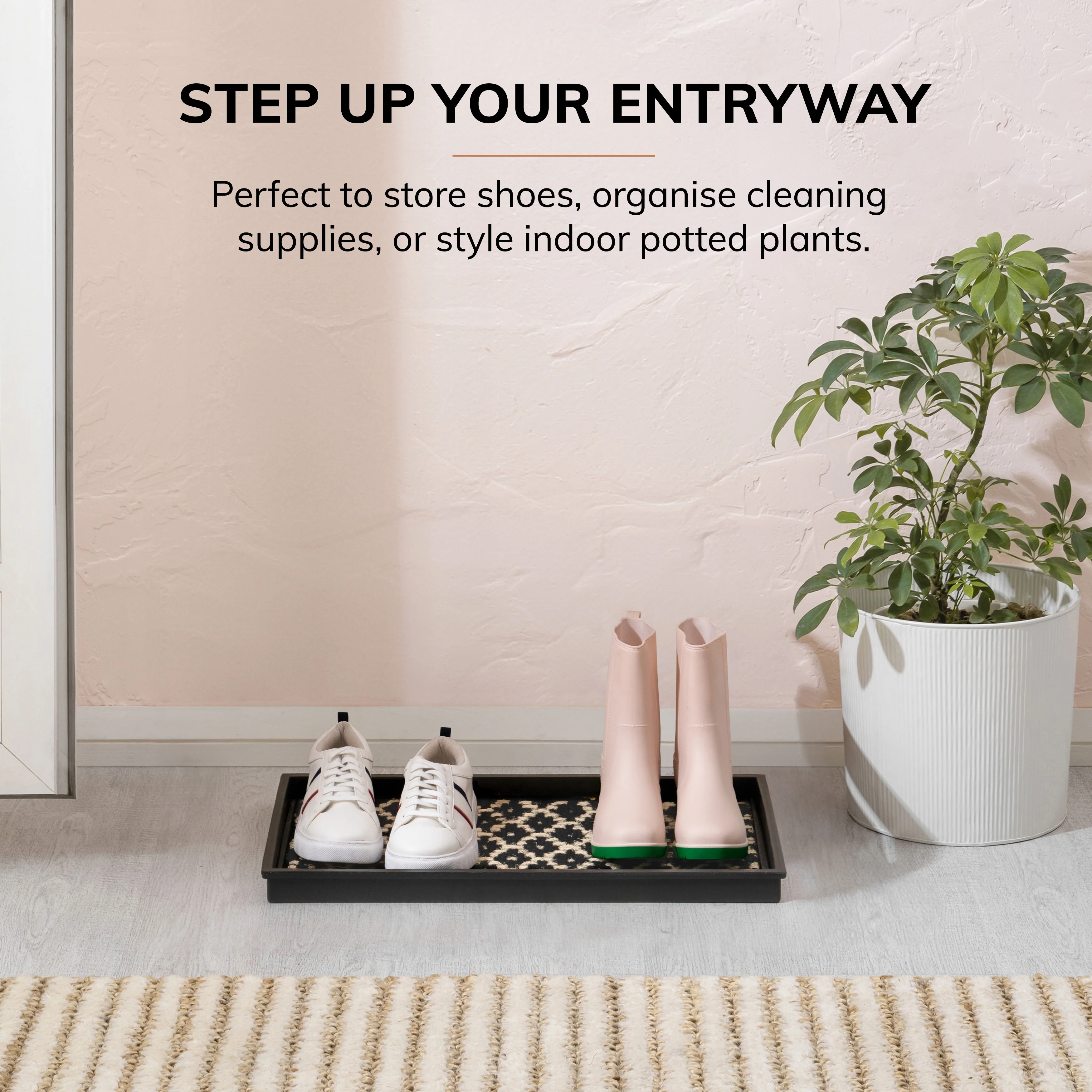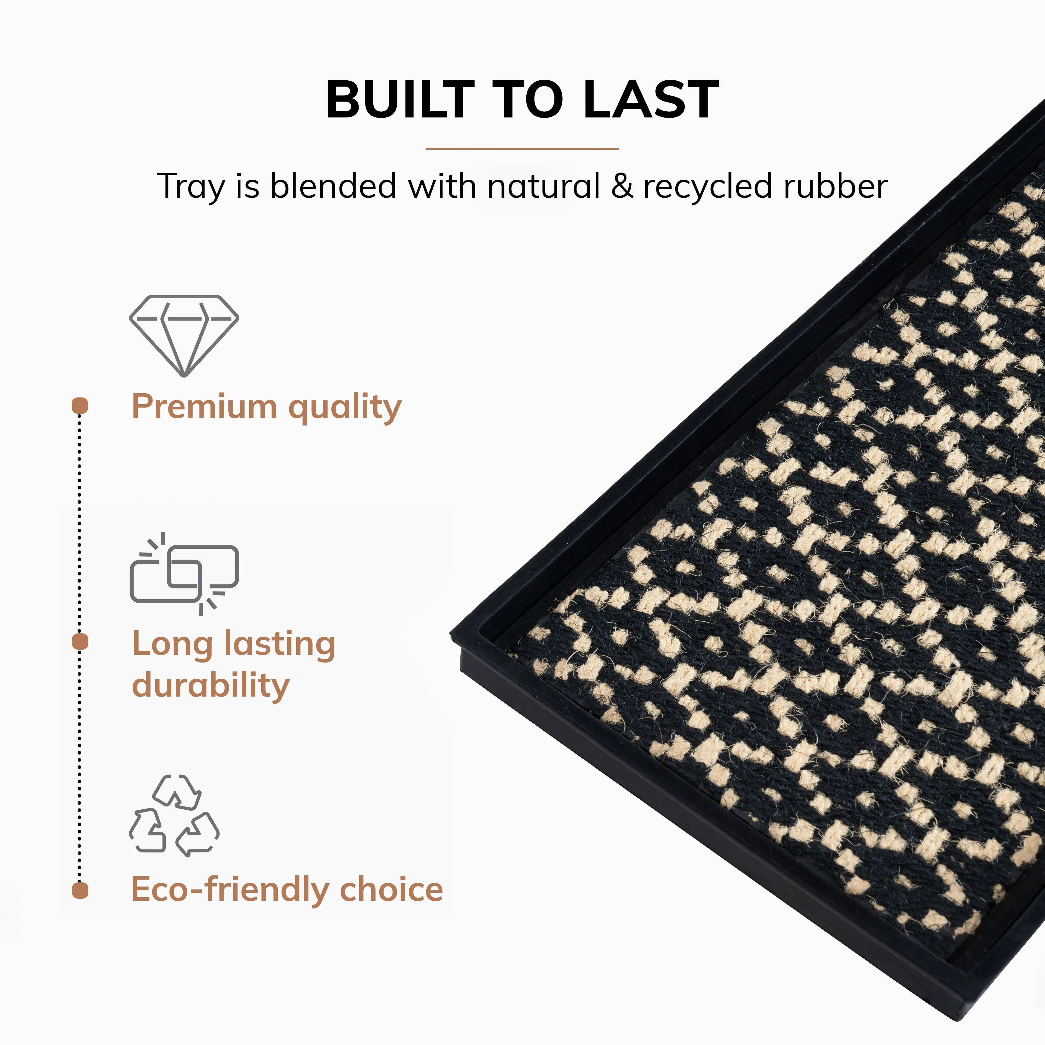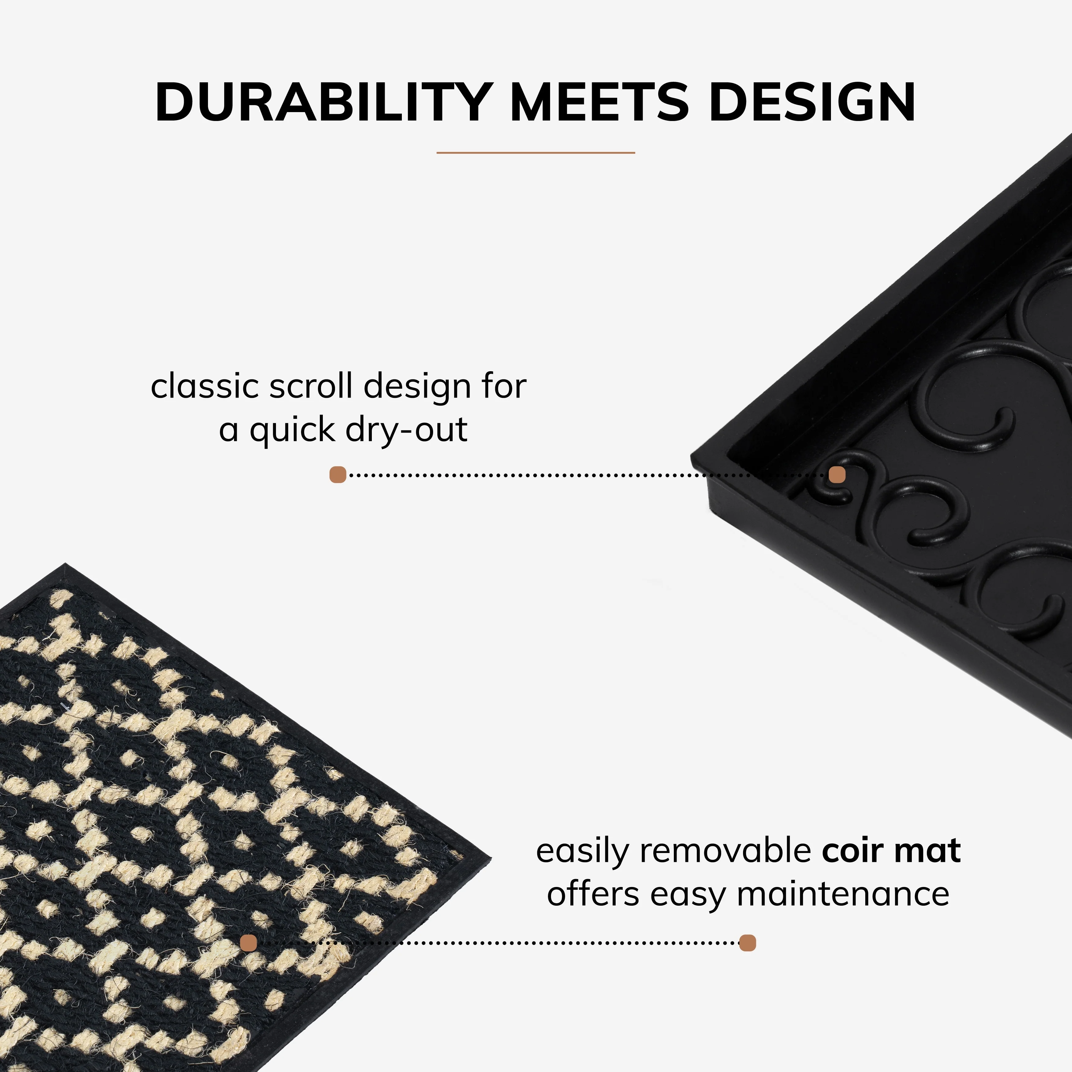 Mindfully designed to be durable and easy to care for, our Natural and Recycled Rubber Boot Tray with Black and Ivory Coir Insert is an ideal choice for your clutter-free entryways. Crafted from recycled rubber, this heavy-duty tray features a classic scroll design for quick drying. Interlaced with coir strands, its easily removable insert comes in a zig-zag pattern and allows for easy maintenance; just shake, hose, and air dry. With raised edges to contain spills, you can keep your entryway clean and organized.