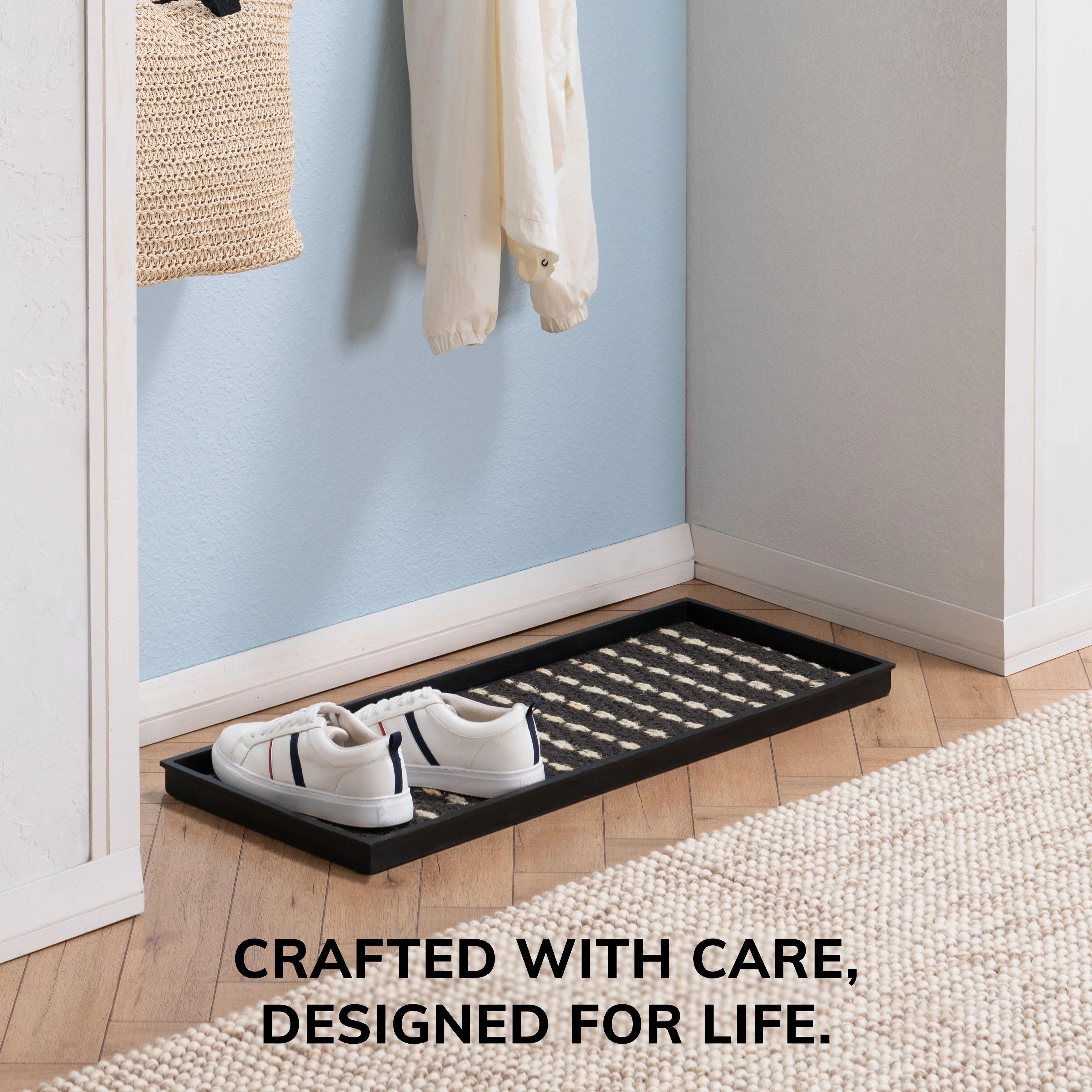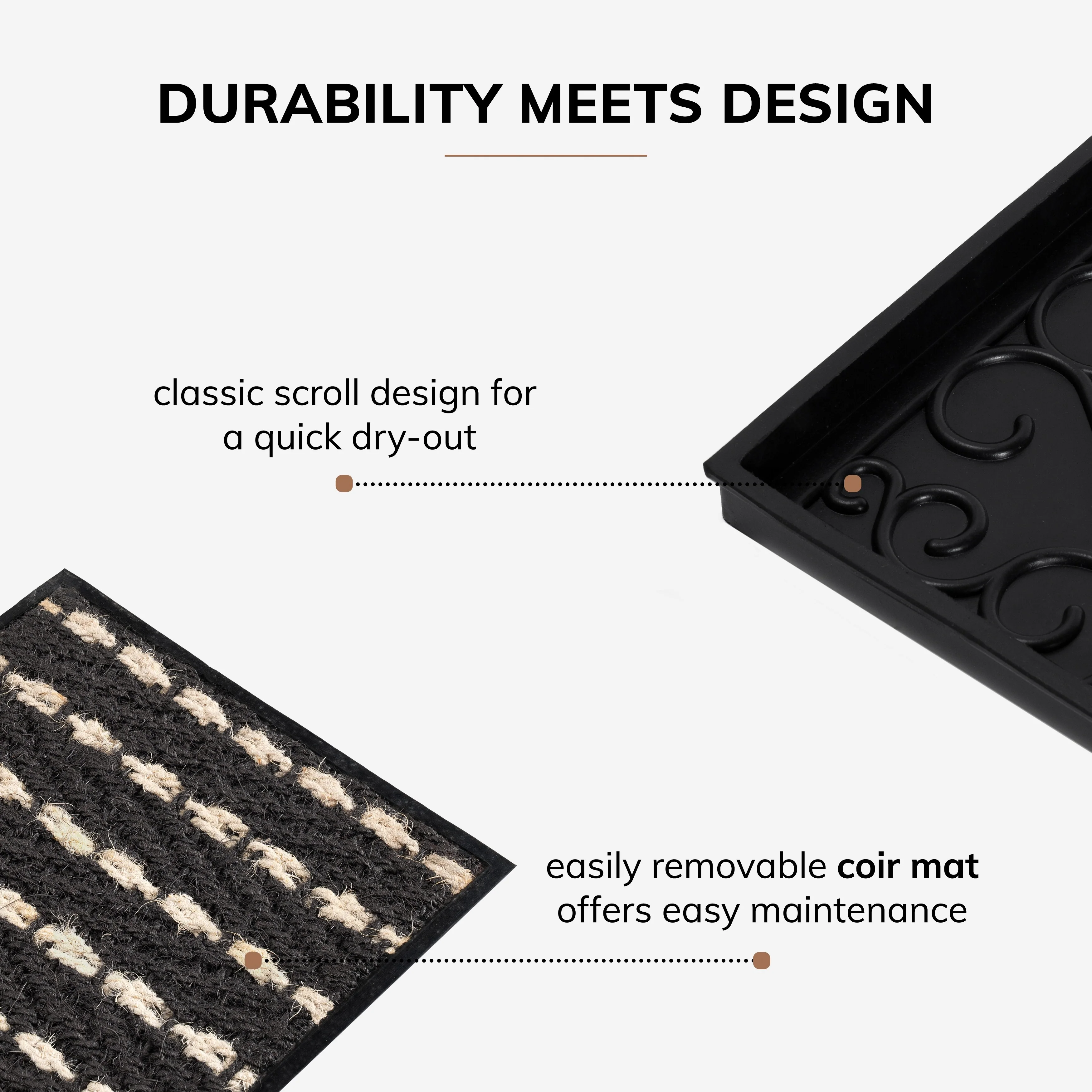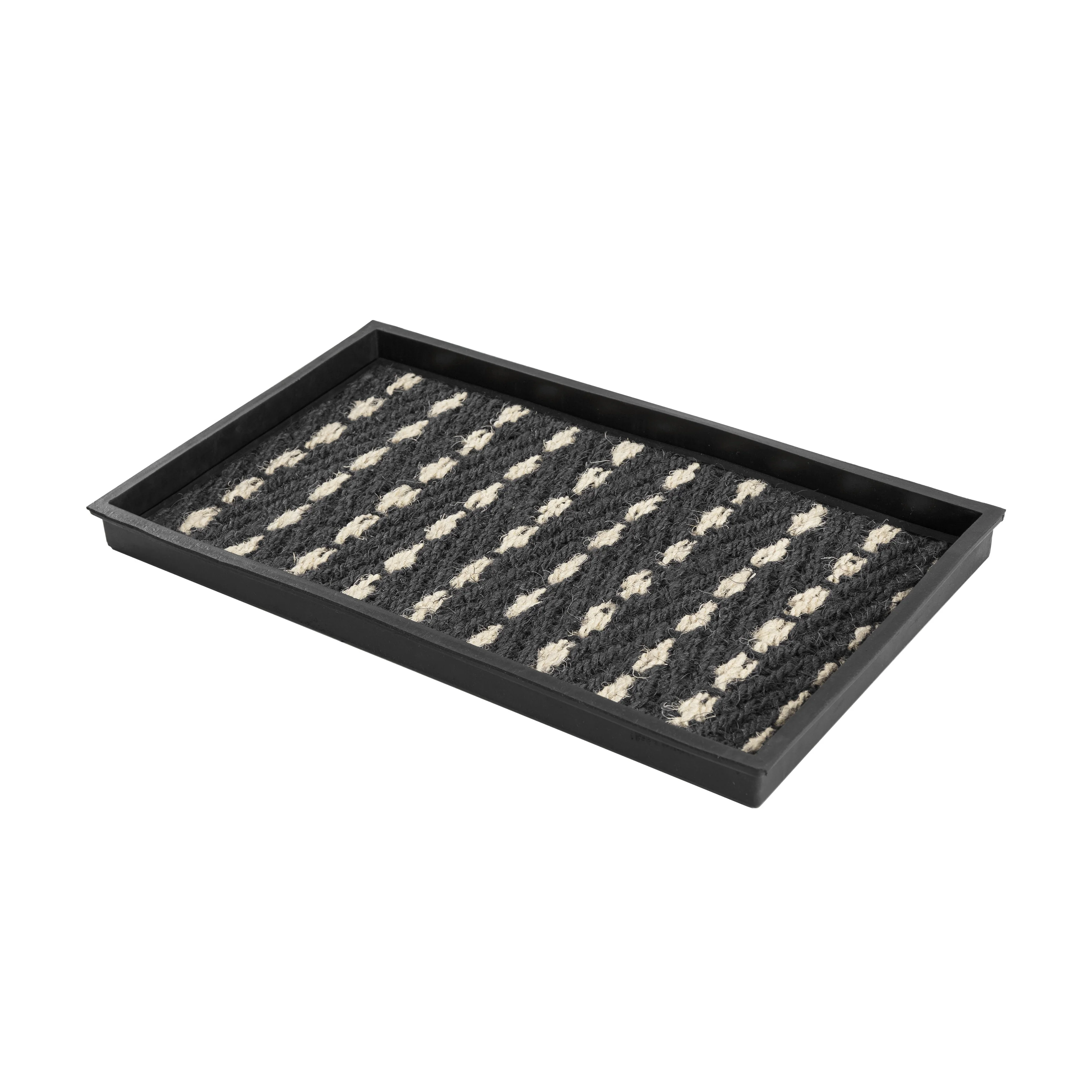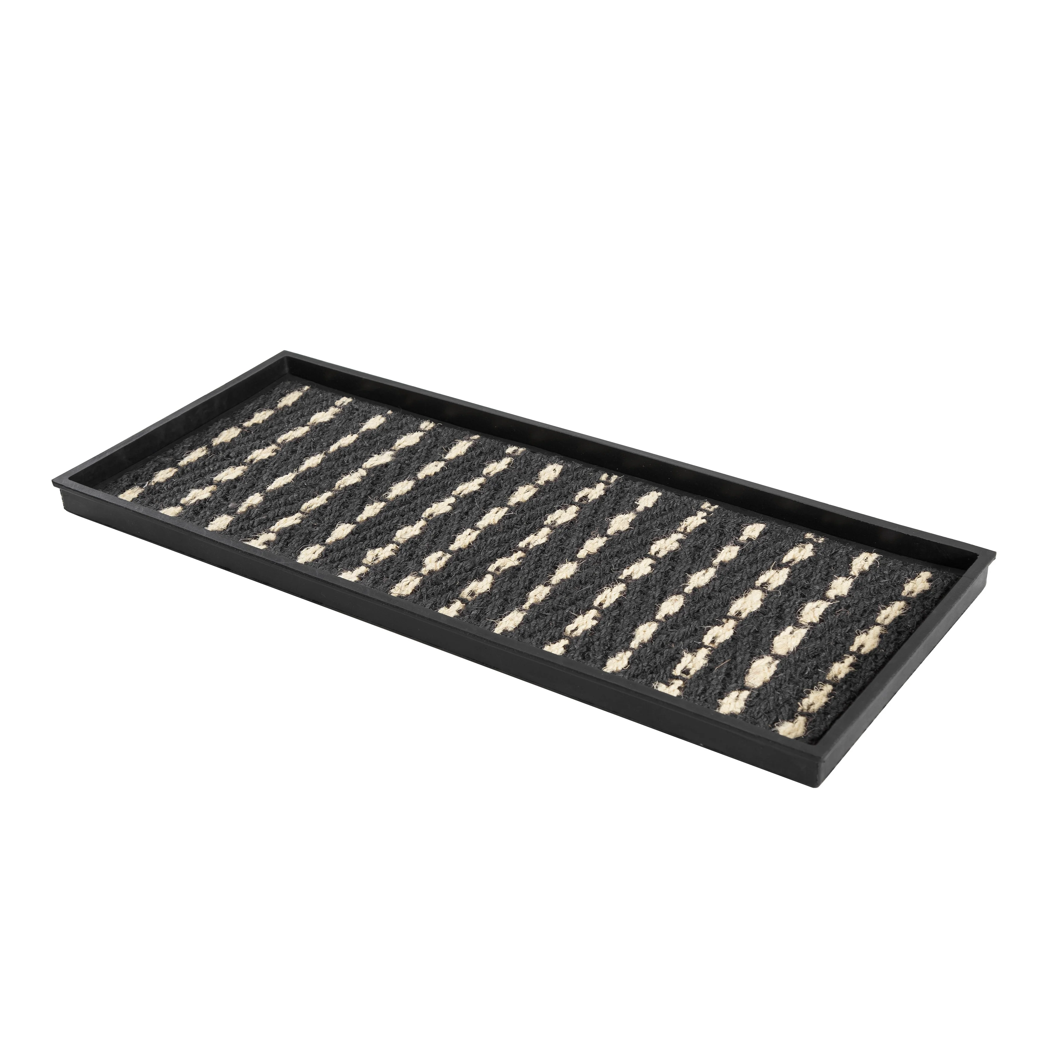 Mindfully designed to be durable and easy to care for, our Natural and Recycled Rubber Boot Tray with Gray and Ivory Coir Insert is an ideal choice for your clutter-free entryways. Crafted from recycled rubber, this heavy-duty tray features a classic scroll design for quick drying. Interlaced with coir strands, its easily removable insert comes in a zig-zag pattern and allows for easy maintenance; just shake, hose, and air dry. With raised edges to contain spills, you can keep your entryway clean and organized.