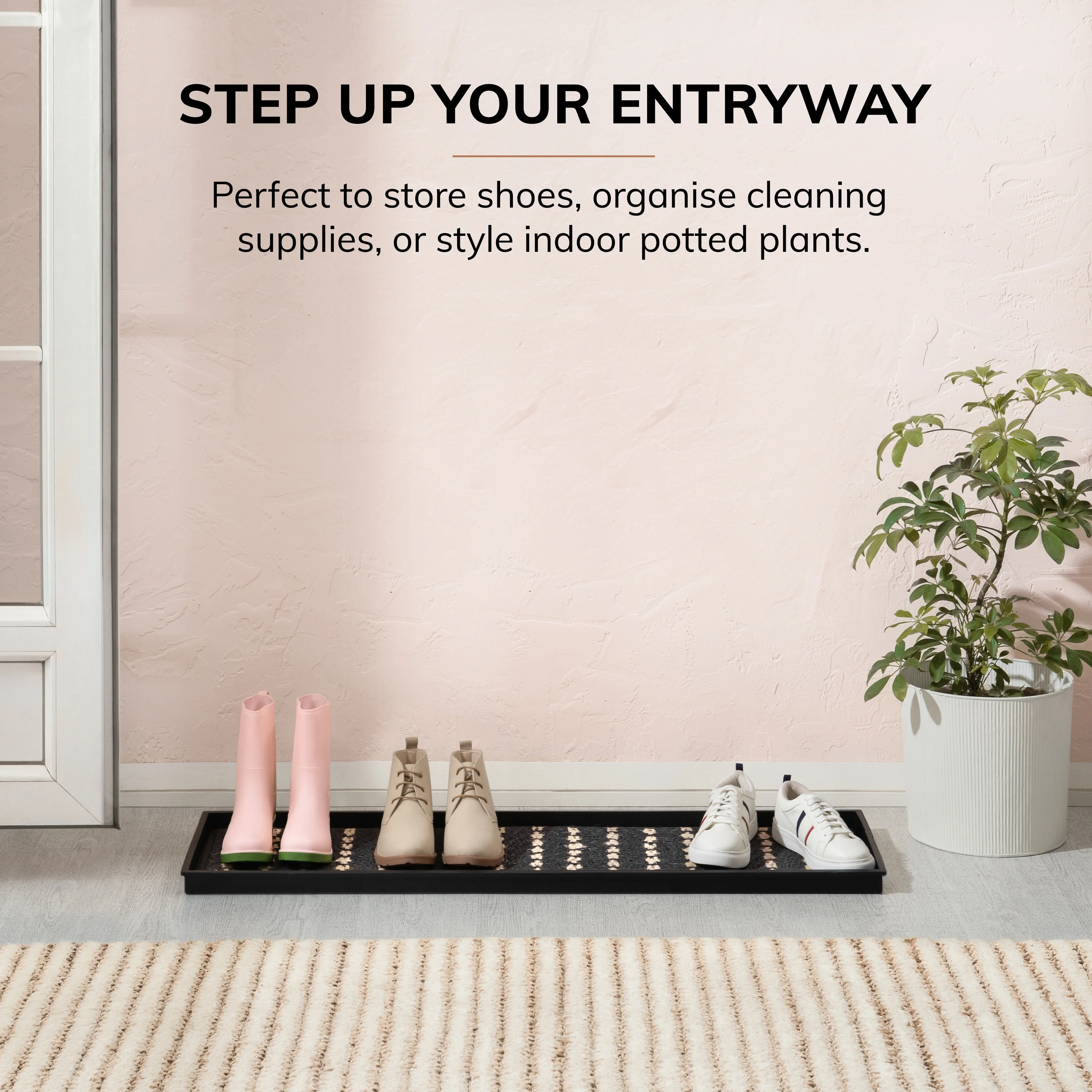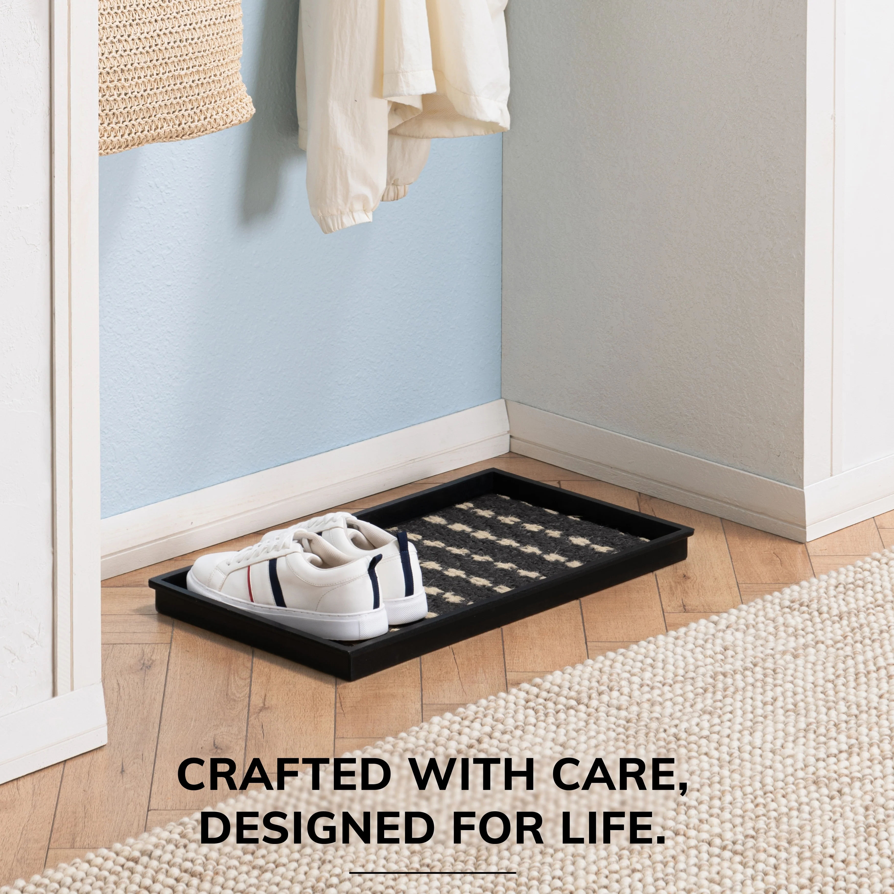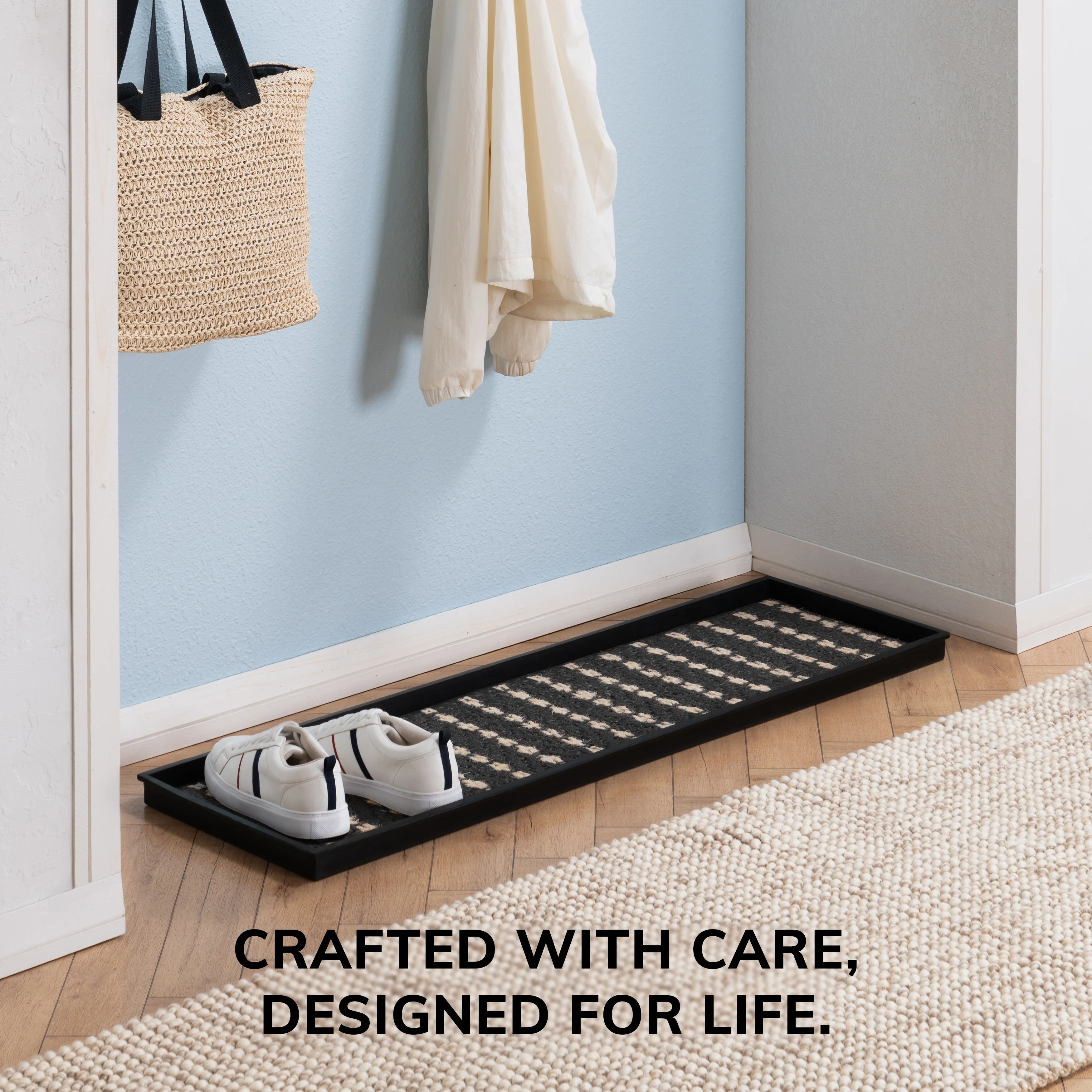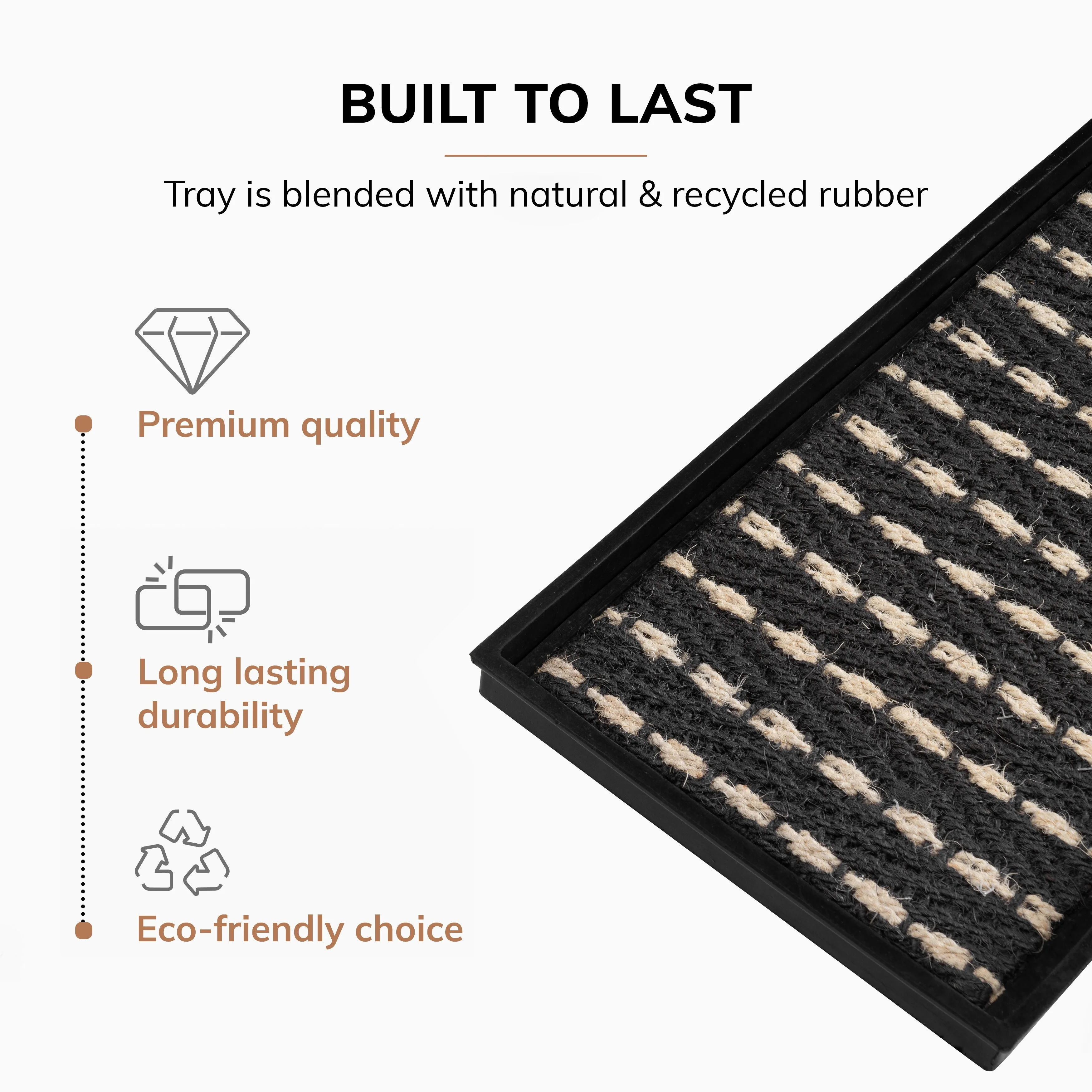 Mindfully designed to be durable and easy to care for, our Natural and Recycled Rubber Boot Tray with Gray and Ivory Coir Insert is an ideal choice for your clutter-free entryways. Crafted from recycled rubber, this heavy-duty tray features a classic scroll design for quick drying. Interlaced with coir strands, its easily removable insert comes in a zig-zag pattern and allows for easy maintenance; just shake, hose, and air dry. With raised edges to contain spills, you can keep your entryway clean and organized.