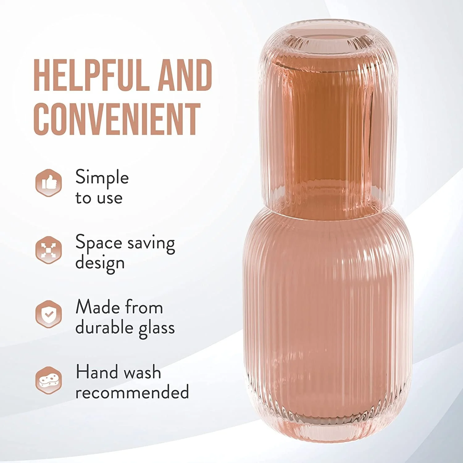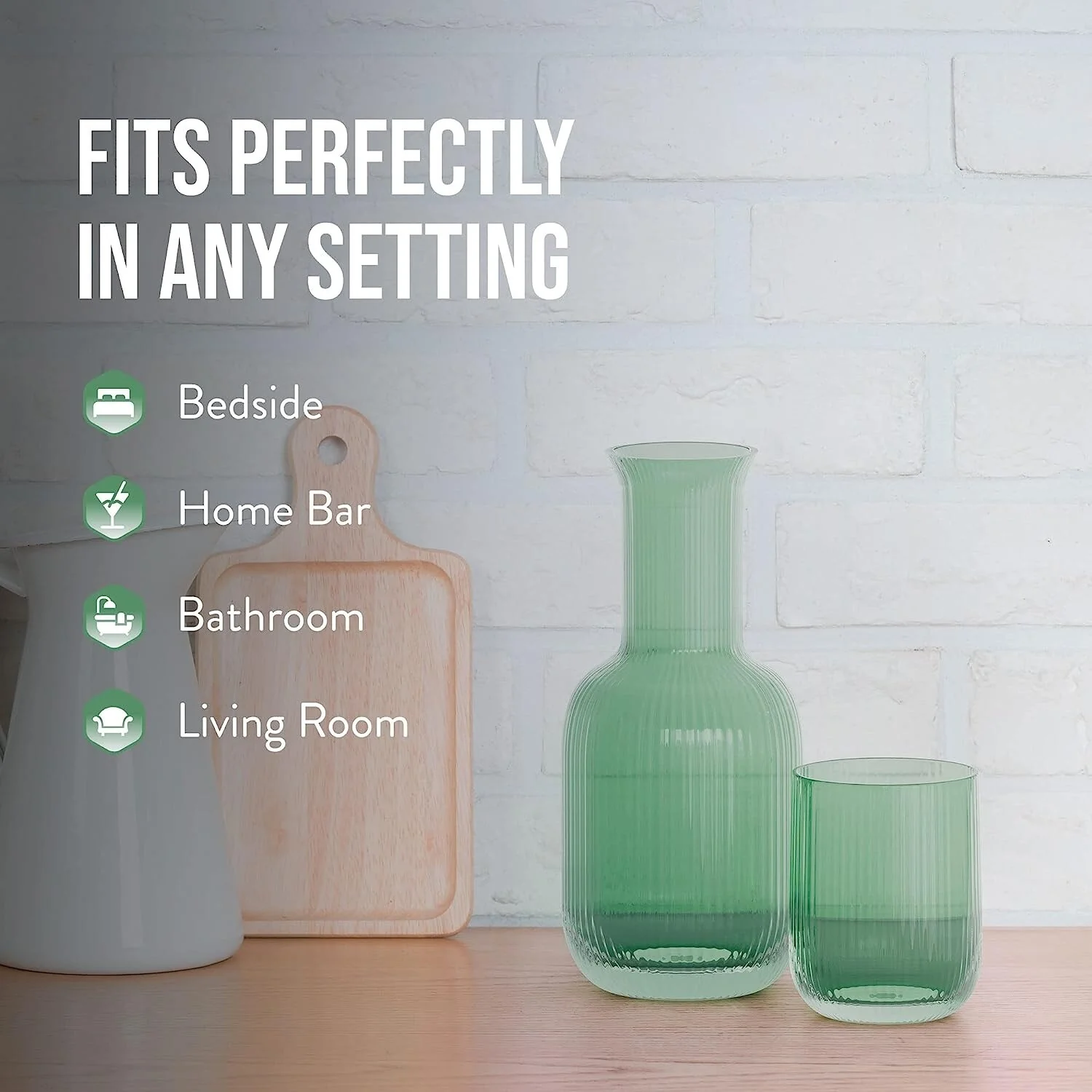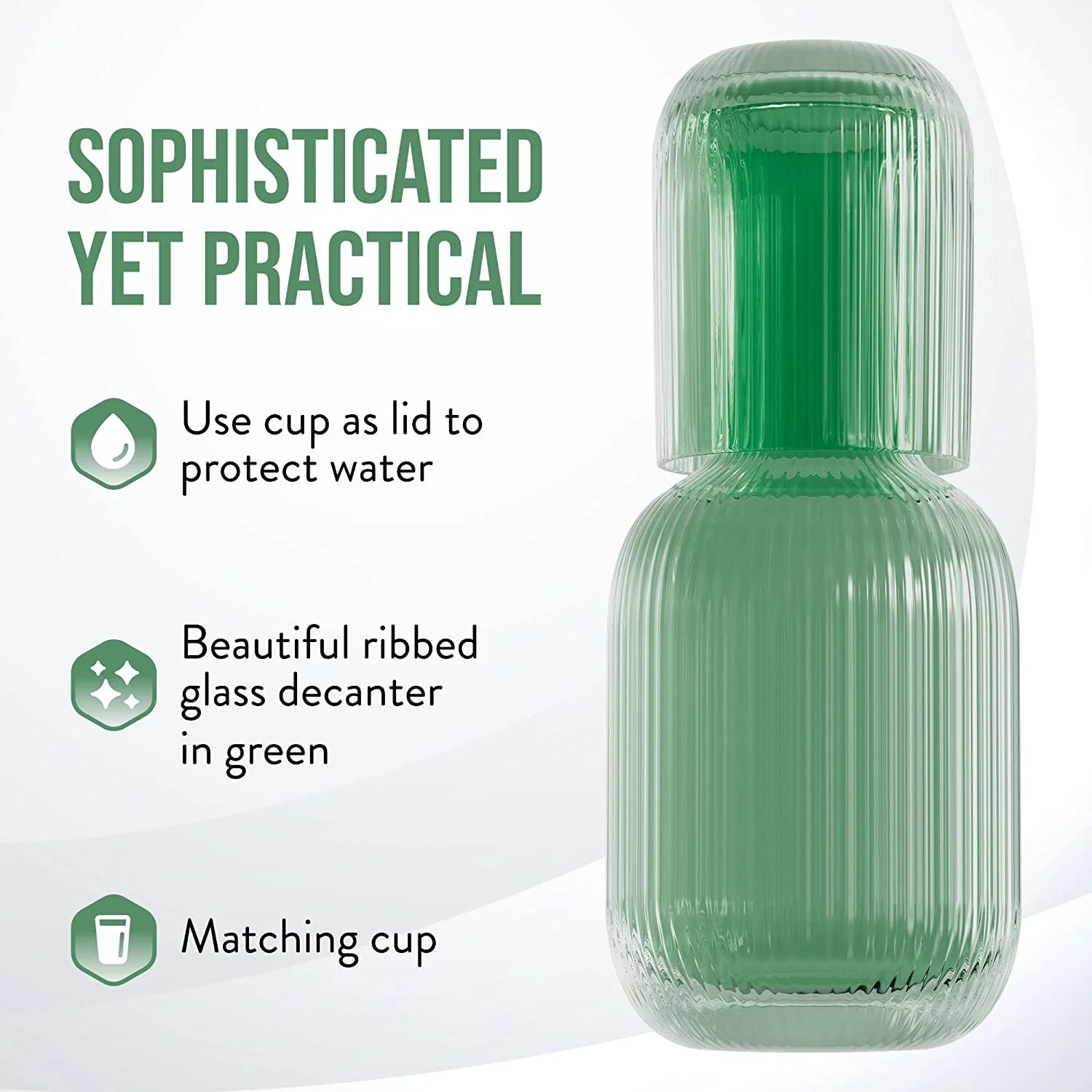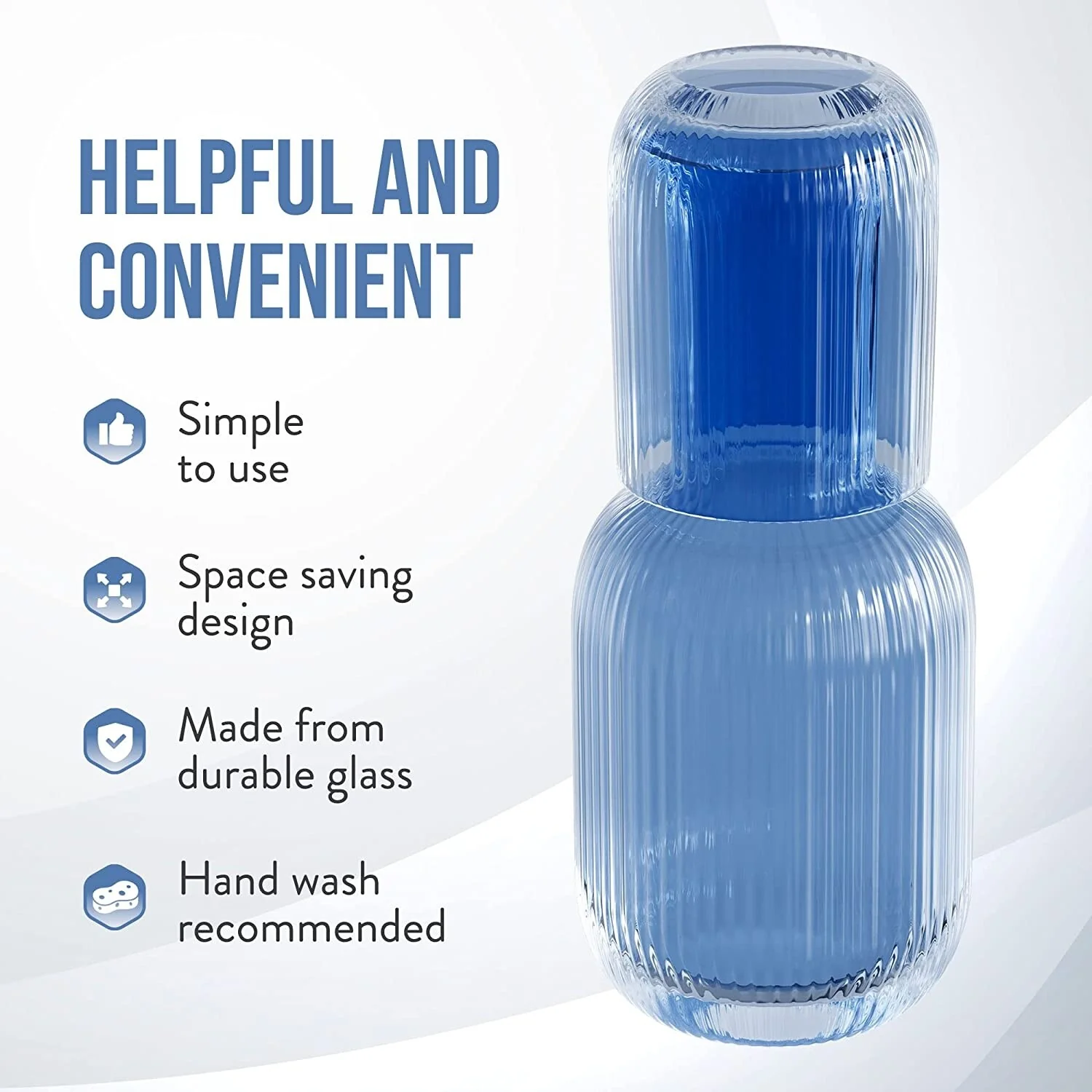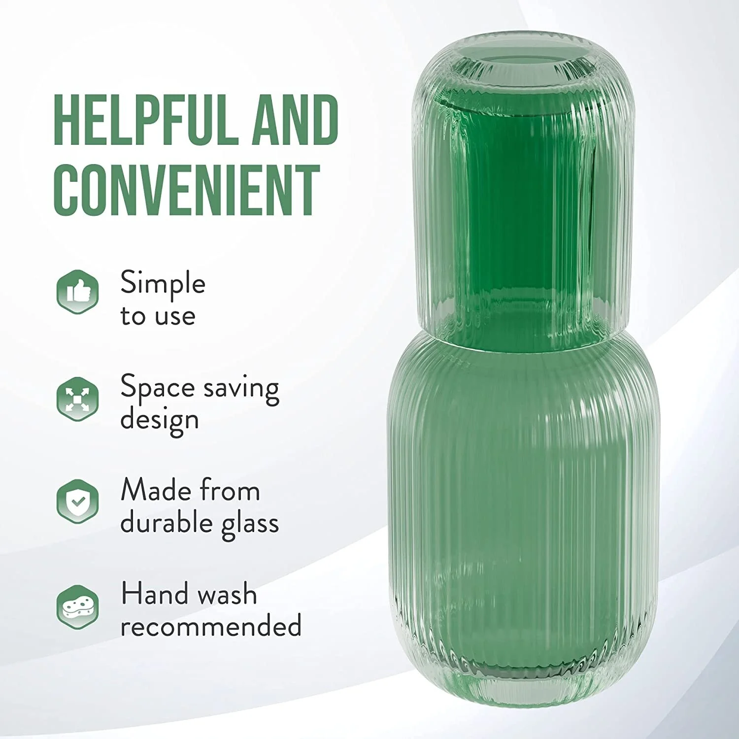 - 2-Piece Set. Expertly crafted of glass, this set includes a carafe with a tumbler that doubles as a lid to keep water or another liquid clean for drinking. It makes a great addition to a bedside table for quenching thirst in the middle of the night