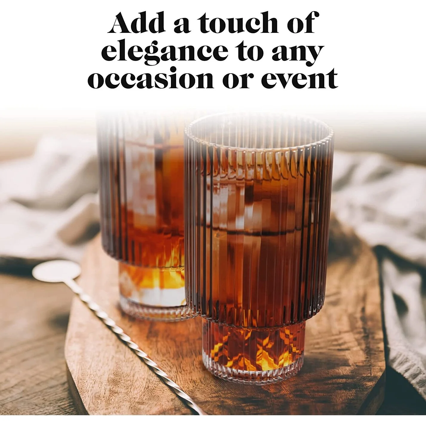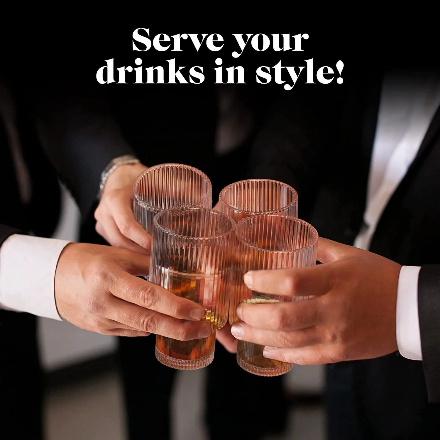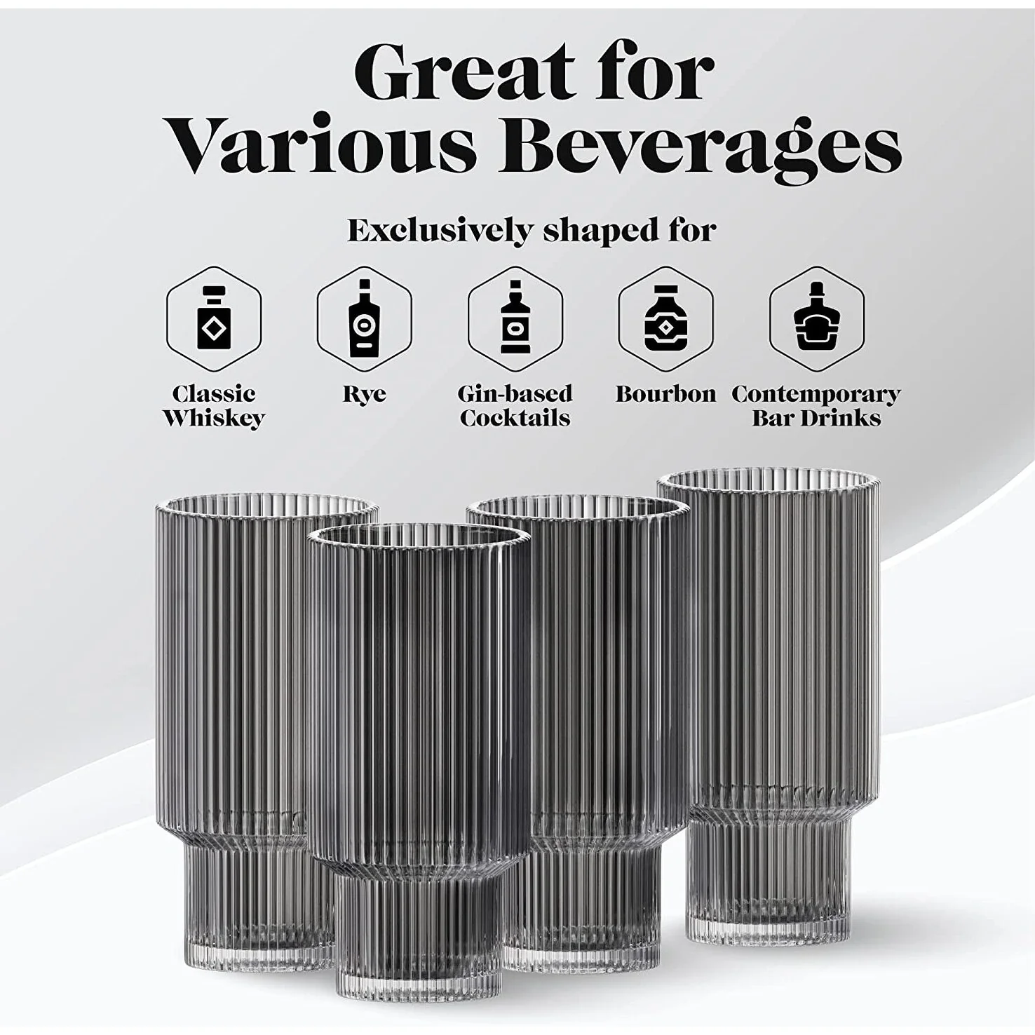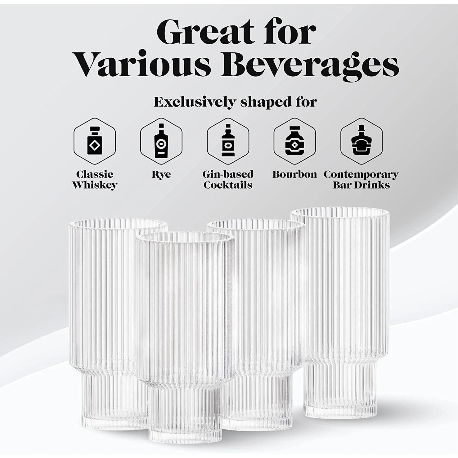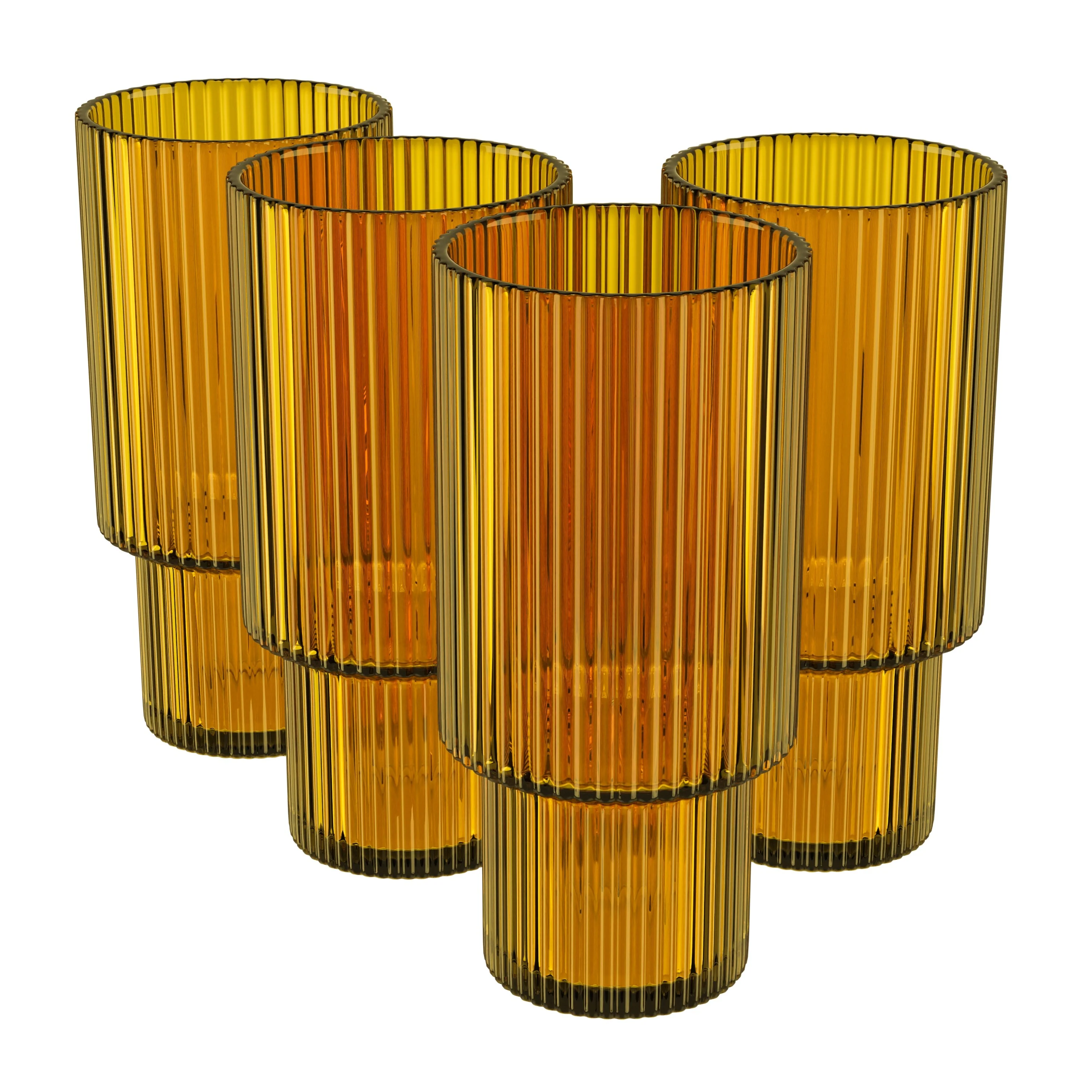 - Use these glasses drinking with friends or have the glassware set ready for mealtimes. The ribbed glassware is even suitable for party cocktails. This drinkware set is so versatile that the possibilities are endless