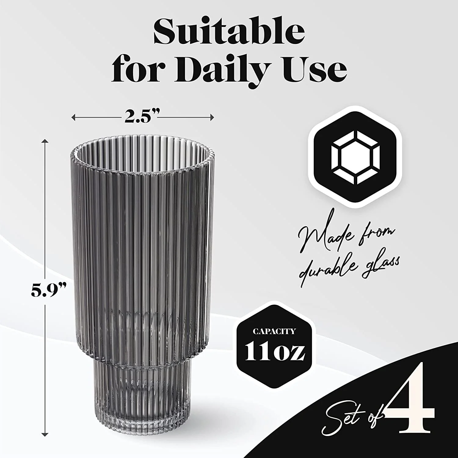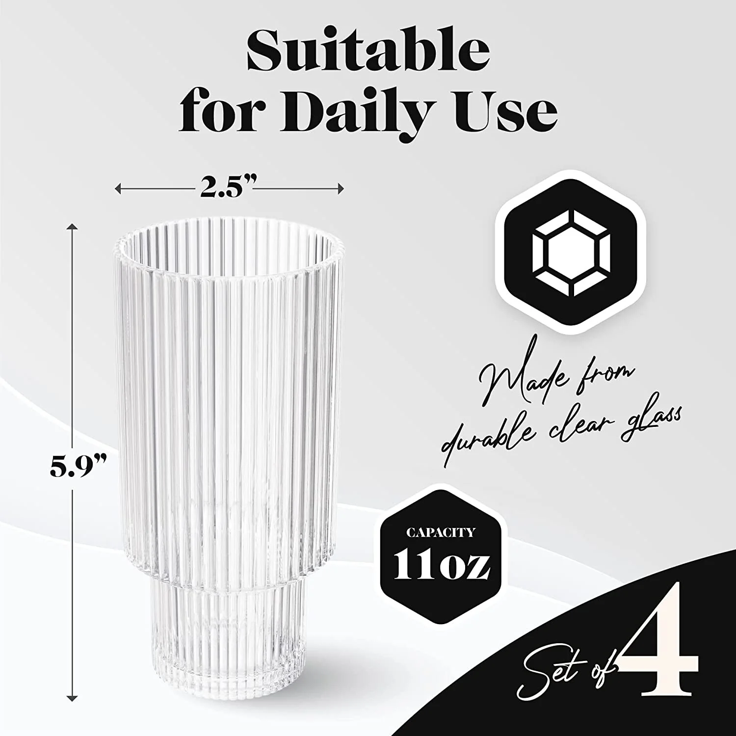 - The set of 11 ounce clean-lined highball glass is made of premium glass and engraved with vertical stripes. Their gently profiled silhouette lends a sleek and modern touch to your tabletop. The exceptional clarity of the glass allows a variety of beverage and juice to be admired properly
