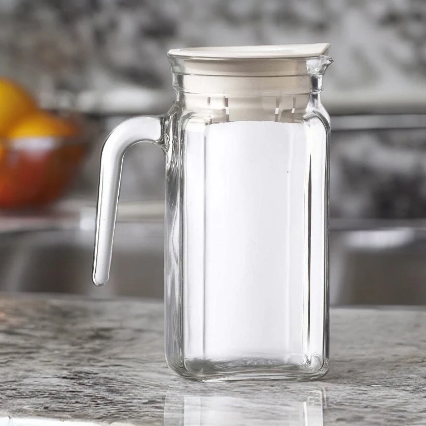 - PERFECT POUR - The white plastic lid provides a controlled pour rate, and the opened handle allows for easy carrying and pouring. The clear glass body allows you to clearly see what beverage is inside the pitcher.