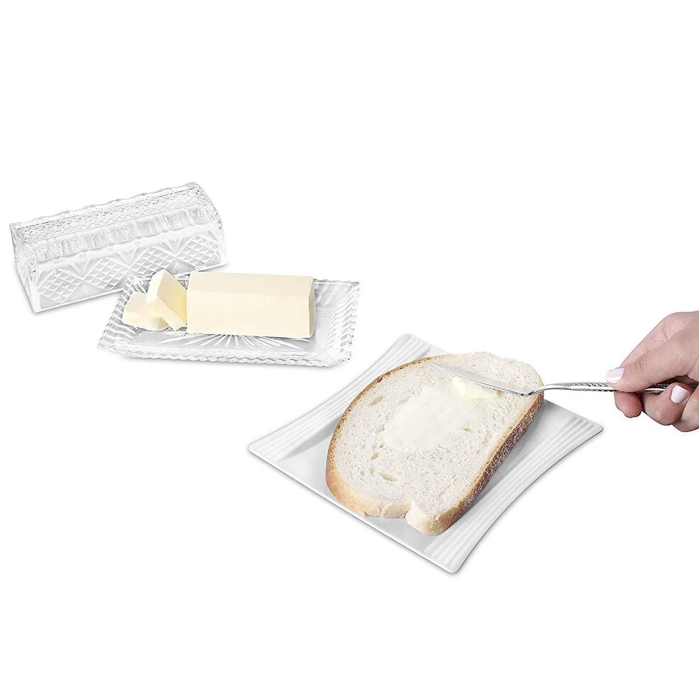 Covered Butter Dish- Comes with a perfectly fitted lid. Enjoy soft, spreadable butter anytime, without refrigeration! Beautiful and Best Designed Glass Butter Dish- Butter has never looked better than when neatly displayed in this antique butter dish with a tidy cover. The rectangular butter dish is designed to hold rectangular shaped butter. Extra Large, Fits 1 American size Butter Stick. Dimensions: 7' x 3.75' x 2.75' Inside of Butter Dish: L: 5.75' W: 2.50' H: 1.75'Crystal Butter Dish- Preserves butter in the pantry or countertop for up to 7 days without spoilage or odor.