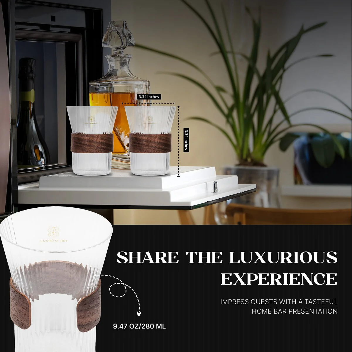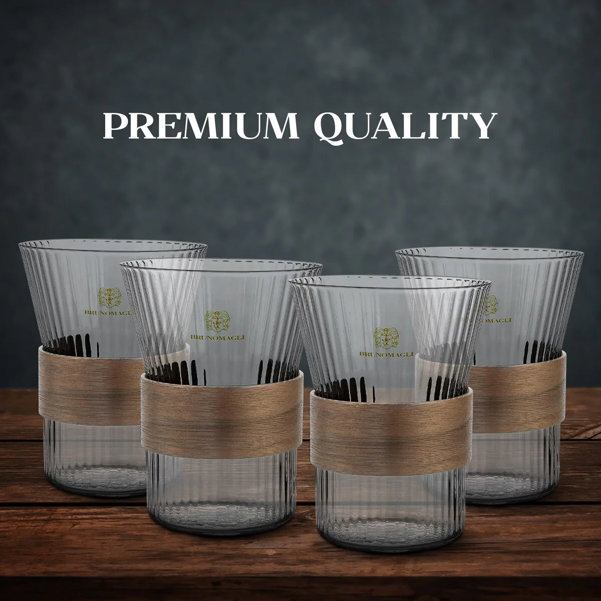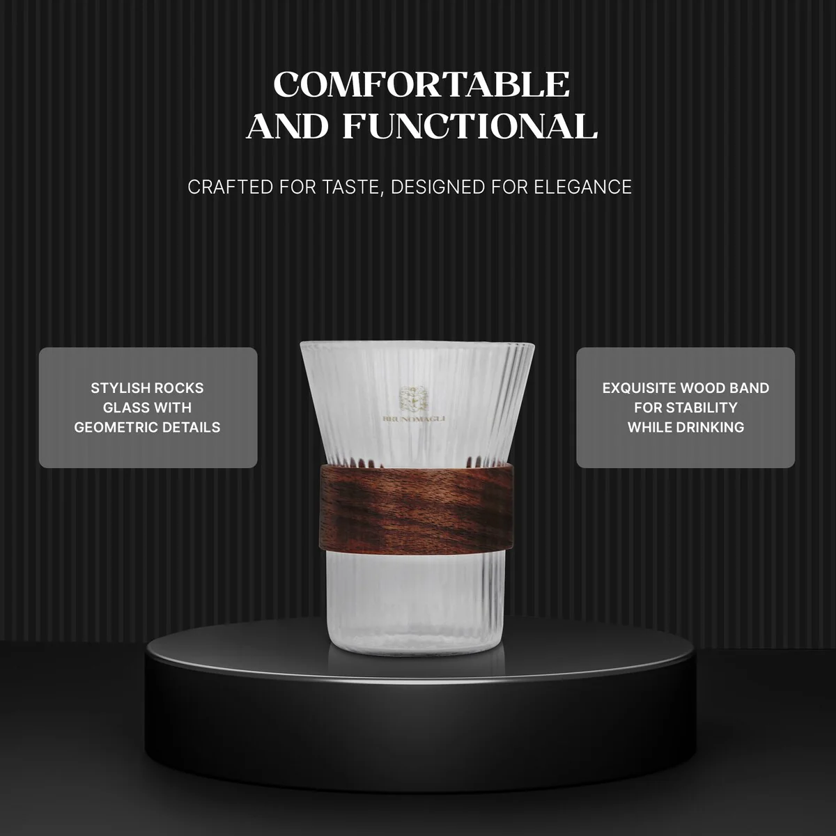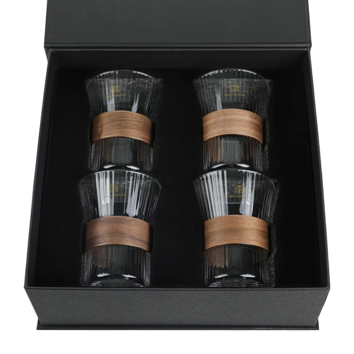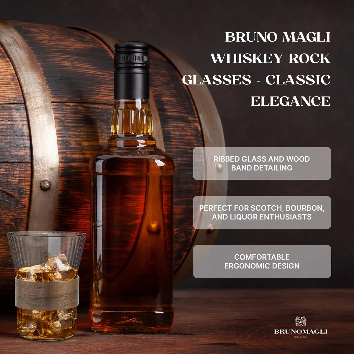 - Premium Quality: Bruno Magli Whiskey Rock Glasses with Wood Band are crafted from original high-quality glass, with ribbed glass designs. The wood band detailing adds a touch of texture and sophistication.