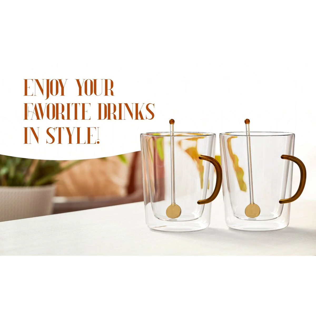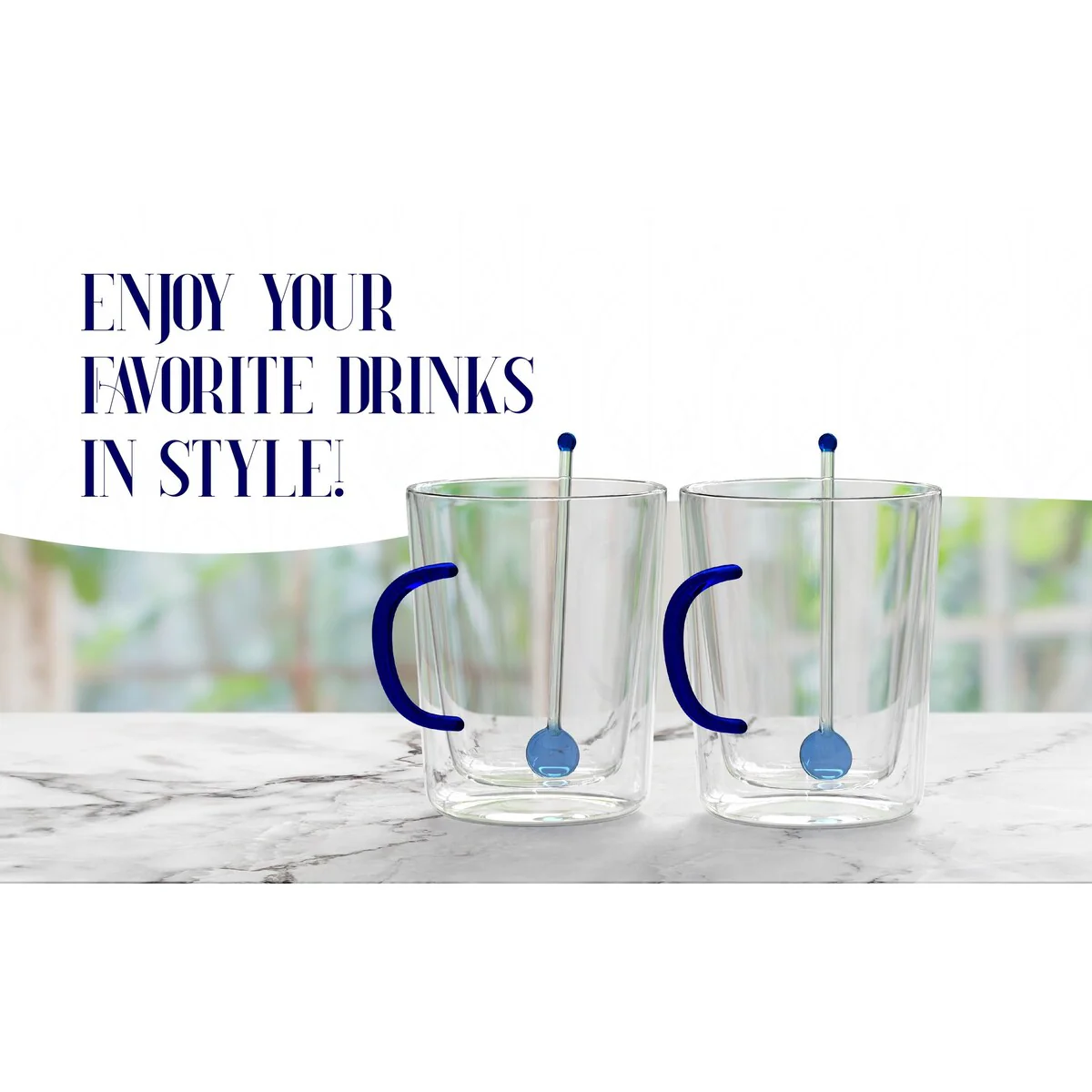 Introducing the Elle Décor Double Wall Glass Coffee Mugs with Colored Handle and Spoon, a must-have addition to your kitchen or coffee station. These clear glass mugs, available in a set of two, are designed to elevate your coffee-drinking experience with their stylish and functional features. Crafted from high-quality borosilicate glass, these coffee mugs boast exceptional clarity, allowing you to appreciate the mesmerizing colors of your coffee art while giving you a crystal-clear view of your favorite brew. With a generous 10.5-ounce capacity, they are perfect for serving tea, coffee, latte, cappuccino, or any other hot or cold beverage. One of the standout features of these mugs is their comfortable grip, thanks to the colored glass handles. You can choose from two attractive handle colors -blue, and amber - to add a pop of color and personality to your morning routine or match your kitchen decor. Durability is not compromised with these mugs. Constructed with a double wall design, they are made to withstand high temperatures while keeping the exterior cool to the touch. The high borosilicate glass material ensures their resistance to heat, making them safe and suitable for daily use. Cleaning is a breeze with these glass mugs. The smooth surface and wide mouth design make them easy to clean by hand or simply place them in the dishwasher for a hassle-free cleanup. Their sturdy construction guarantees long-lasting use, providing you with a stylish and functional coffee mug set that will stand the test of time. Upgrade your coffee-drinking experience with the elle décor Double Wall Glass Coffee Mugs with Colored Handle. Whether it's a quiet morning at home, an office meeting, or a social gathering, these mugs are sure to impress with their elegant design, versatility, and outstanding quality.