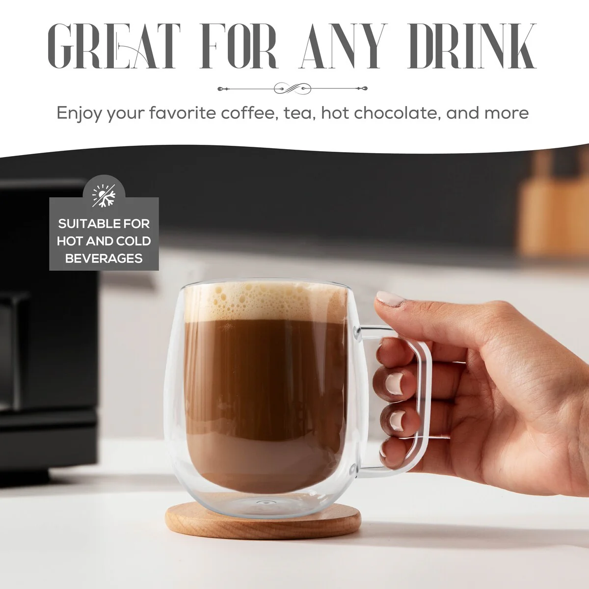 - Versatile Usage: These double wall glass mugs are not limited to just coffee or tea. They are perfect for various beverages, including cappuccinos, lattes, espressos, smoothies, and more. Whether you're at a cafe, restaurant, or enjoying a beverage at home, these mugs are an ideal choice.