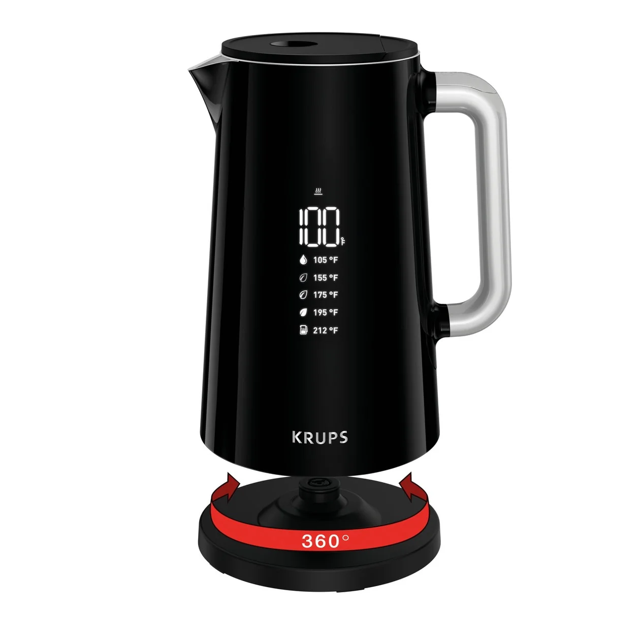 Want to enjoy a hot drink, but can't get the perfect temperature? The KRUPS Smart Temp Digital Kettle is the ideal solution. As the it heats water, the LED screen displays the current water temperature inside the kettle, so you can see when it reaches the optimal temperature. With five preset temperature settings from 105 degrees F up to 212 degrees F, you can get the best hot drinks at the touch of a button. The temperatures are designed to bring out the best flavor for different teas - white, green, oolong, black and herbal. The kettle has double-wall construction that keeps beverages hot inside, while the kettle is safe to touch on the outside. Such design provides natural insulation to keep water hot longer. It also has an automatic lid opening for easy filling. 360 degree rotational base and cordless body of the kettle make usage convenient. An automatic shut off feature helps to stay worry free and guarantees safety. The kettle holds 1.7 L that is equal to 12 cups. The KRUPS Smart Temp Digital Kettle is the answer to all your kettle needs!