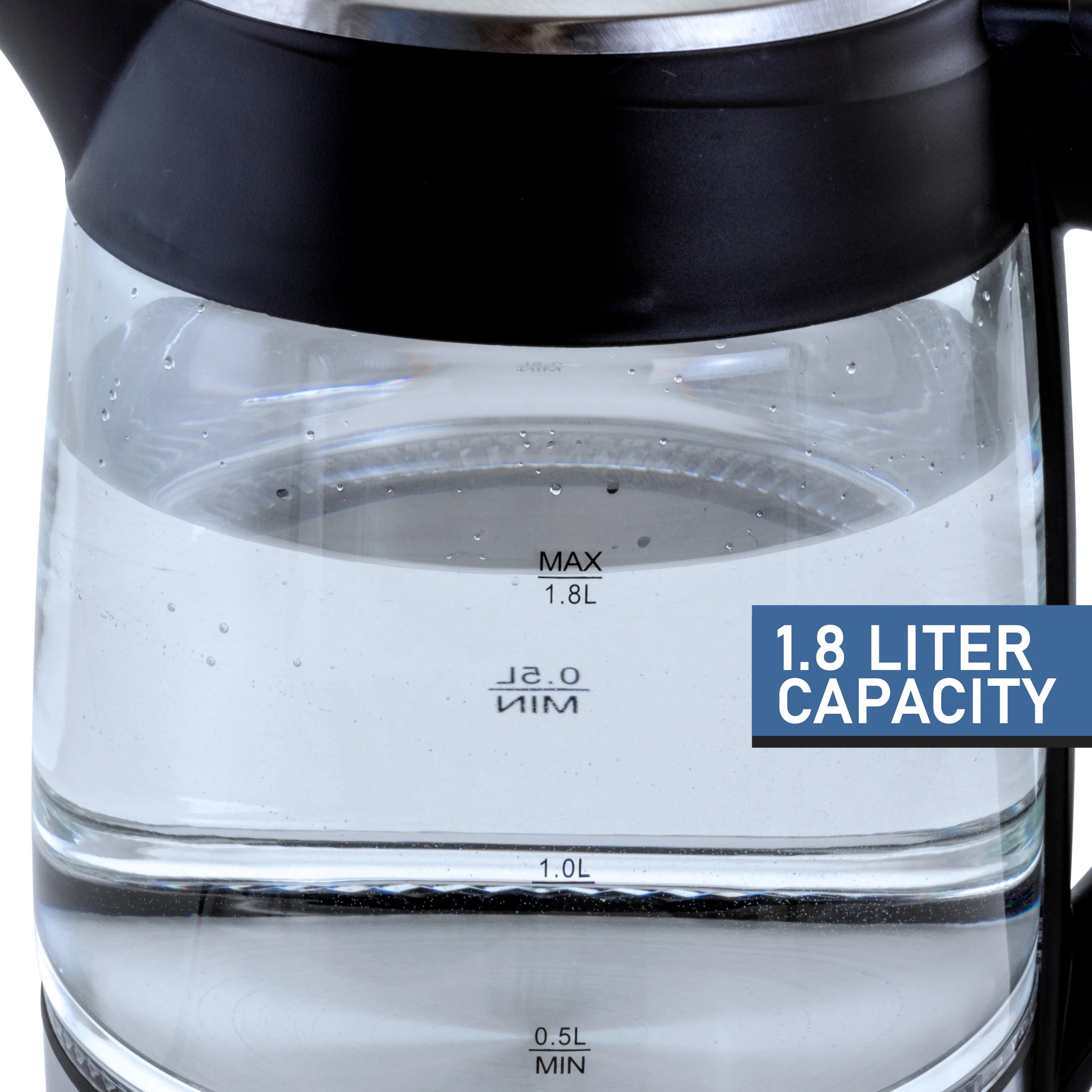Make all your favorite hot beverages and more with the Mega Chef 1.8Lt. Glass Stainless Steel Electric Tea Kettle. This kettle has a sleek design with a stainless steel finish that looks great in any kitchen. See when the water is boiling with the clear glass construction. Heat up water worry free with the auto shut off feature! Clean up is a breeze with the removable and washable filter, and worry less about messes with the drip-free spout.* Capacity :1.8L* 360°cordless jug-kettle* Boil -dry protection * With high borosilicate glass body,durable and stain resistant* Concealed stainless steel heating element* Automatically turns off when water boils* Nice bright LED light * Automatic one button cover starter* Cord-free serving* Drip-free spout