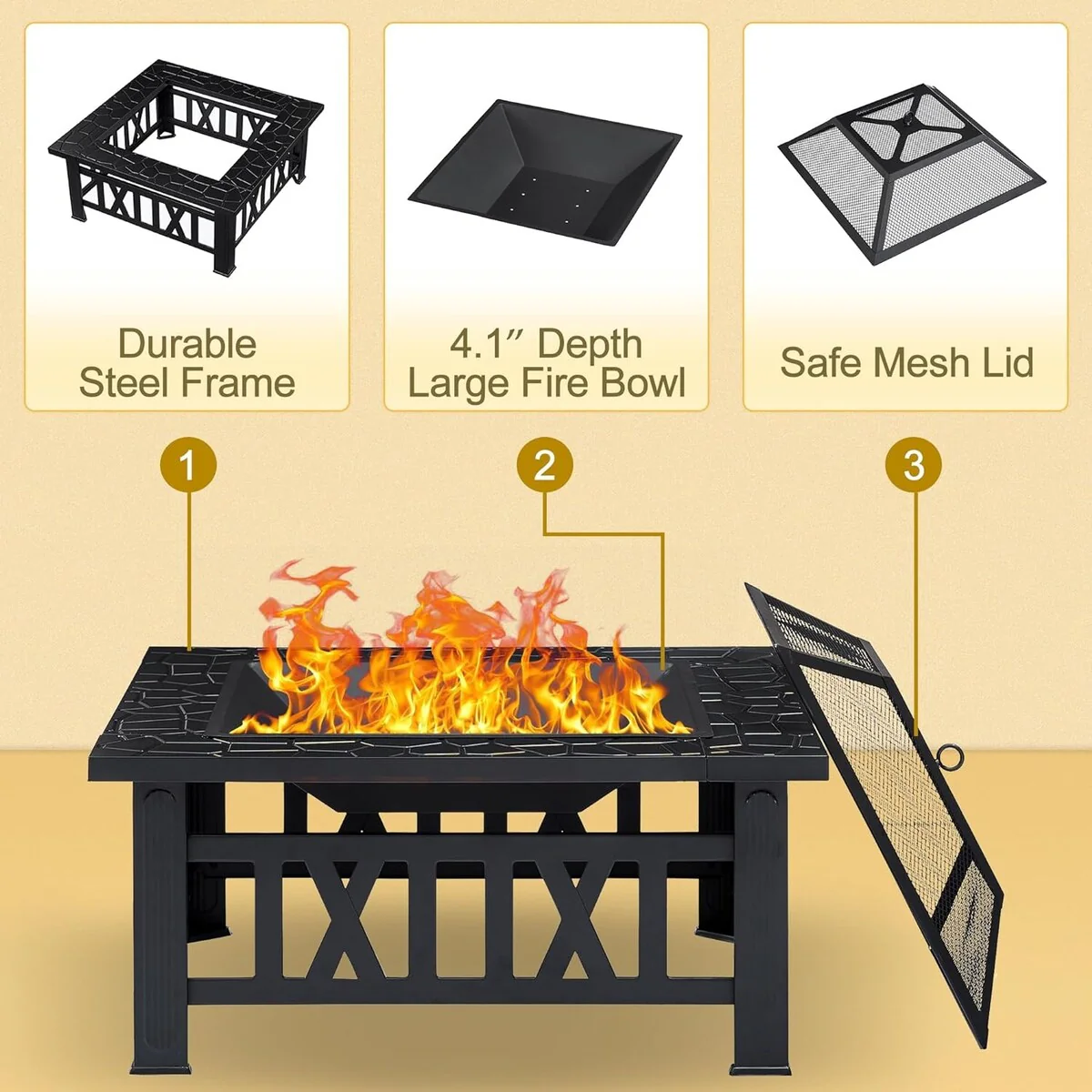 - Crafted with a heavy-duty steel frame, this fire pit is built to withstand the test of time. The high-temperature coating not only adds a sleek finish but also ensures rust resistance for long-term outdoor use. The set includes a waterproof outer cover, keeping it clean when not in use.