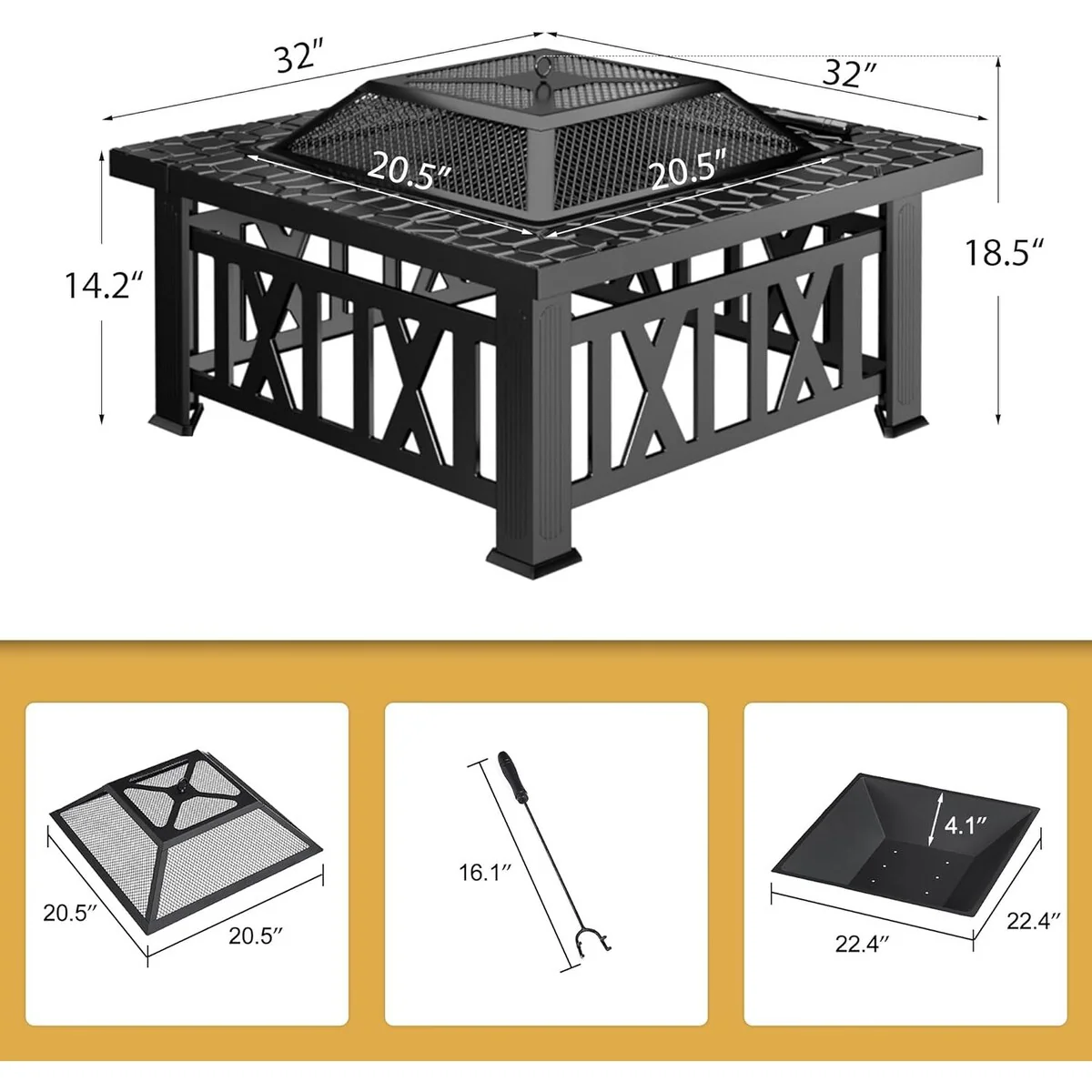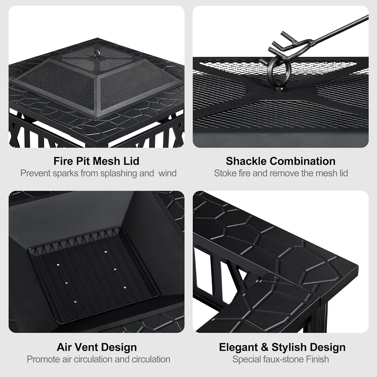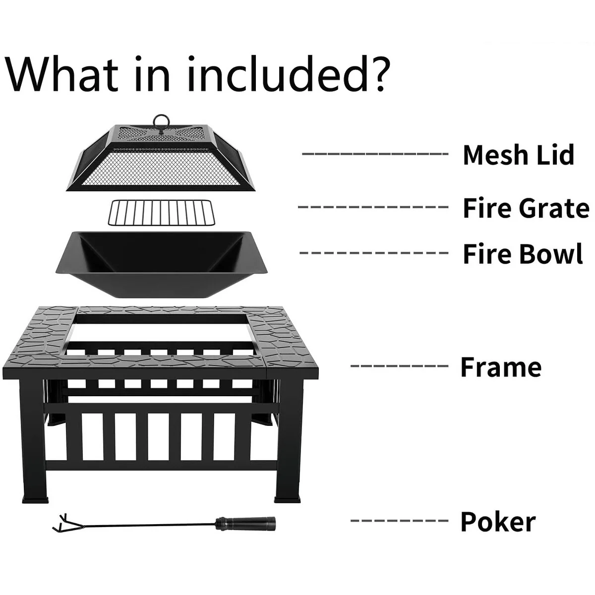 - Stability is a priority with the square design and four firm legs, providing a solid base even on uneven ground. The mesh spark lid prevents sparks and ashes from flying around, ensuring a safe environment. The included poker allows you to move the grill and burning wood without risk.