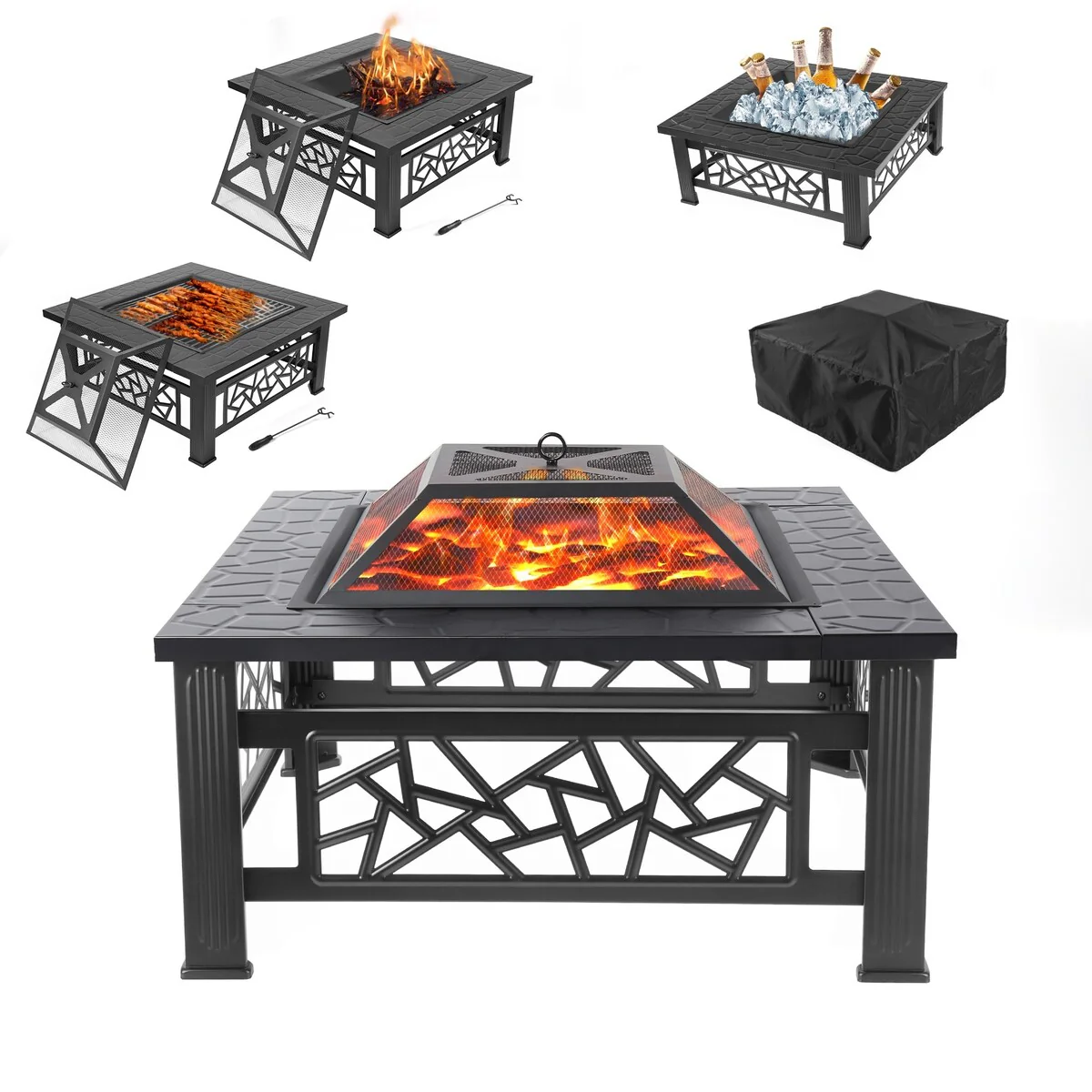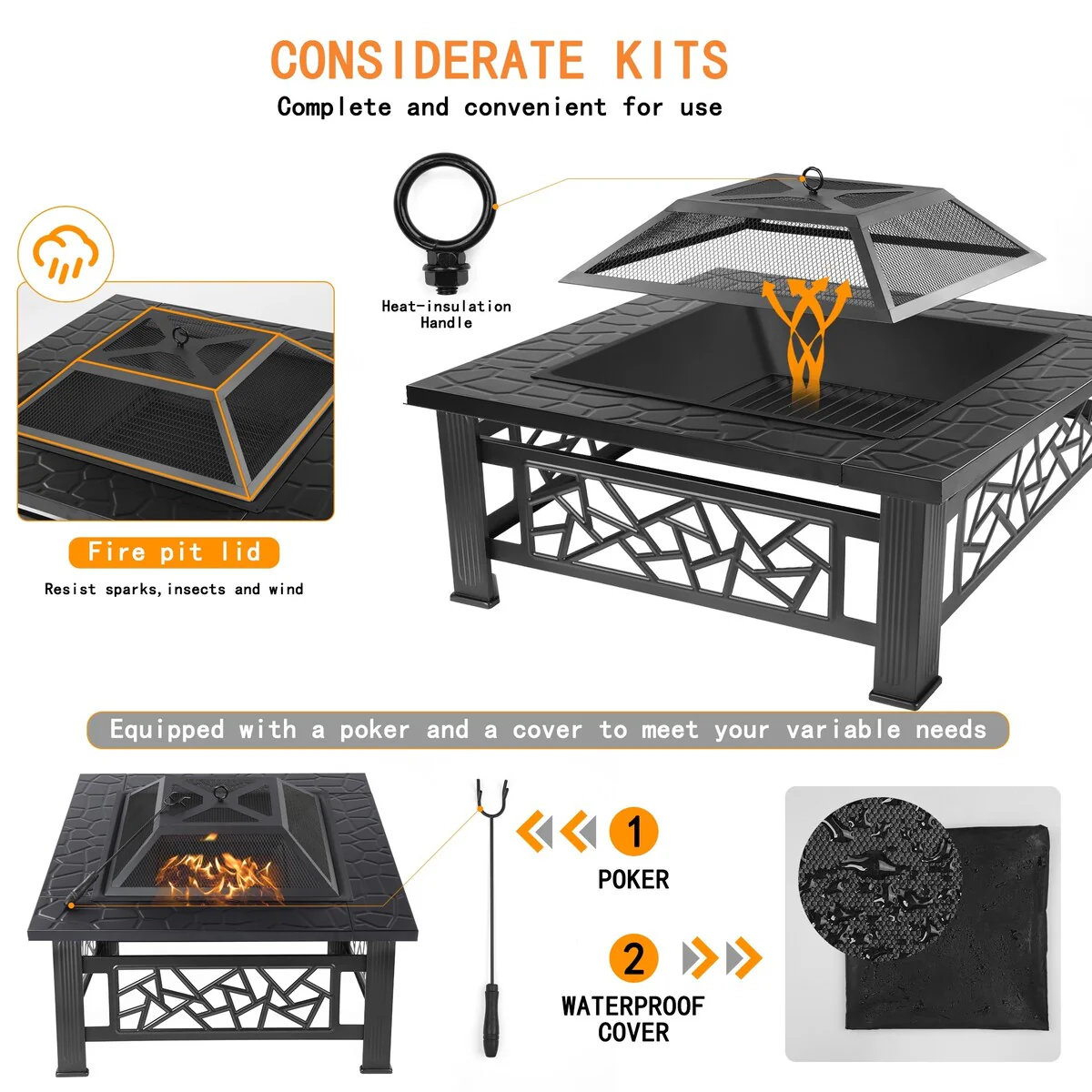 Elevate your outdoor gatherings with our 32' Square Fire Pit, a must-have for any backyard or patio. This versatile wood-burning fire pit comes equipped with everything needed for heating, BBQing, and more. Its geometric fence style in a sleek black finish adds a modern touch while ensuring durability and safety. The package includes a screen lid to contain embers, a poker for adjusting wood, a BBQ net for grilling delights, a food clip for easy handling, and a protective cover to shield against the elements. Whether you're hosting a cozy evening or a lively BBQ party, this fire pit is designed to provide warmth and ambiance, making every outdoor moment memorable.