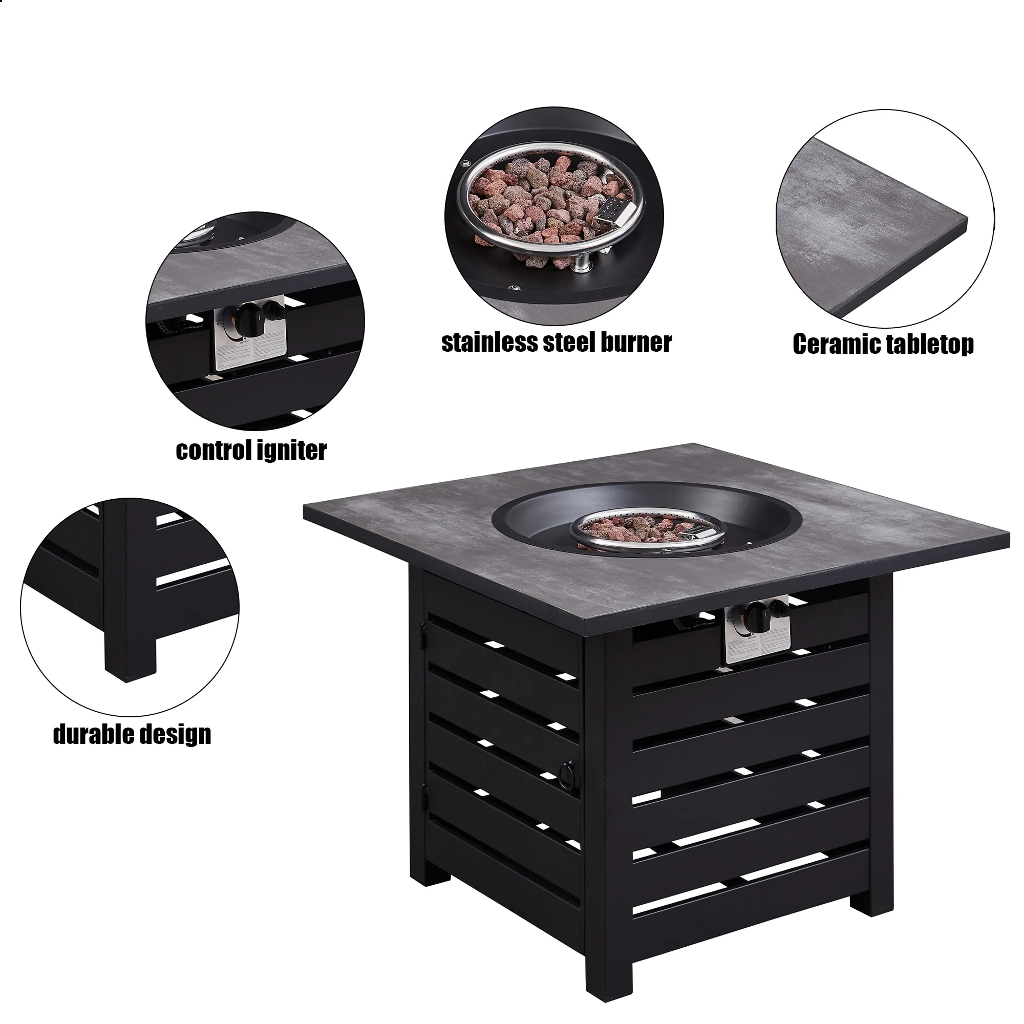 - This product is made of a sturdy metal frame that is built to last, as well as prevent the surface from becoming easily damaged. The desktop is tile, which is easy to clean, and the ignition device is combined with an anti-rust stainless steel basin bottom.