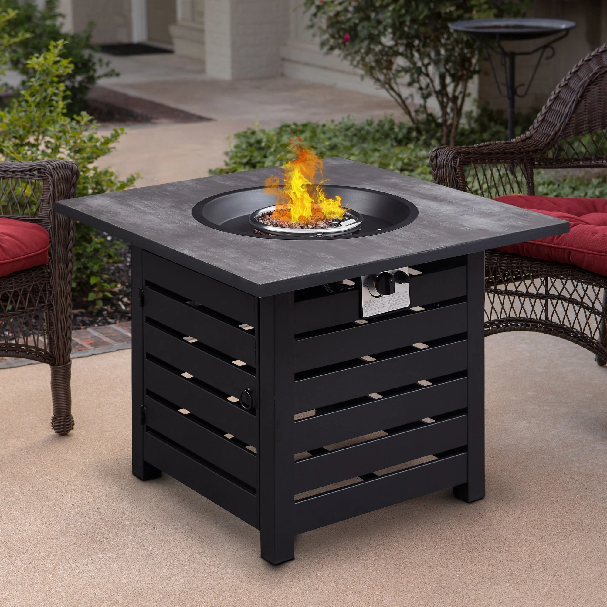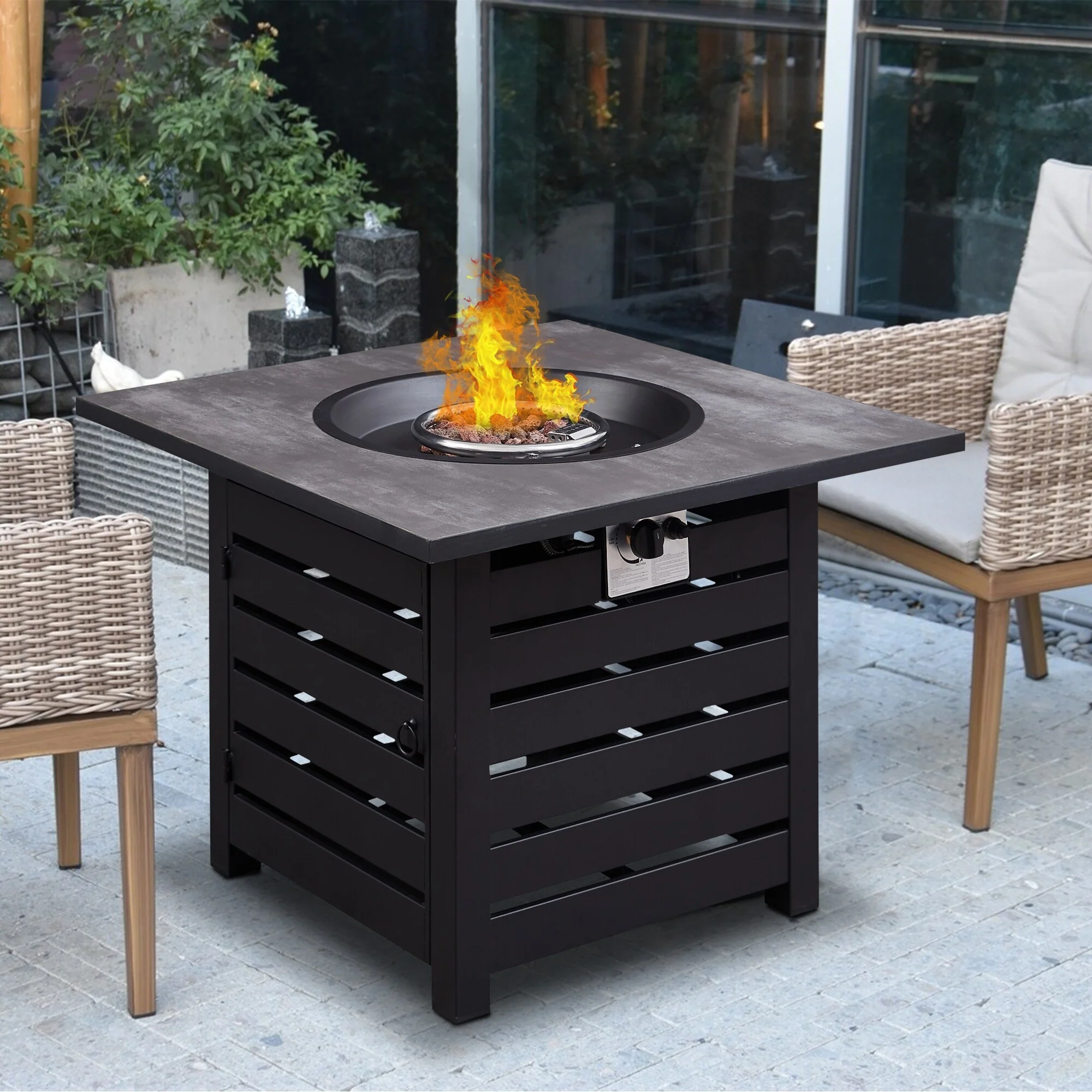 This outdoor propane fire pit table with 50,000 BTU and Pulse ignitor creates a warm and calming atmosphere for entertaining in any season. It has a steel-slatted powder-coated table top and panel cover that are very stable over time. The fire pit comes with complementary blue fireproof glass that will highlight its flames at night and add elegance and style to your backyard, making it the perfect outdoor centerpiece for your family and friends.