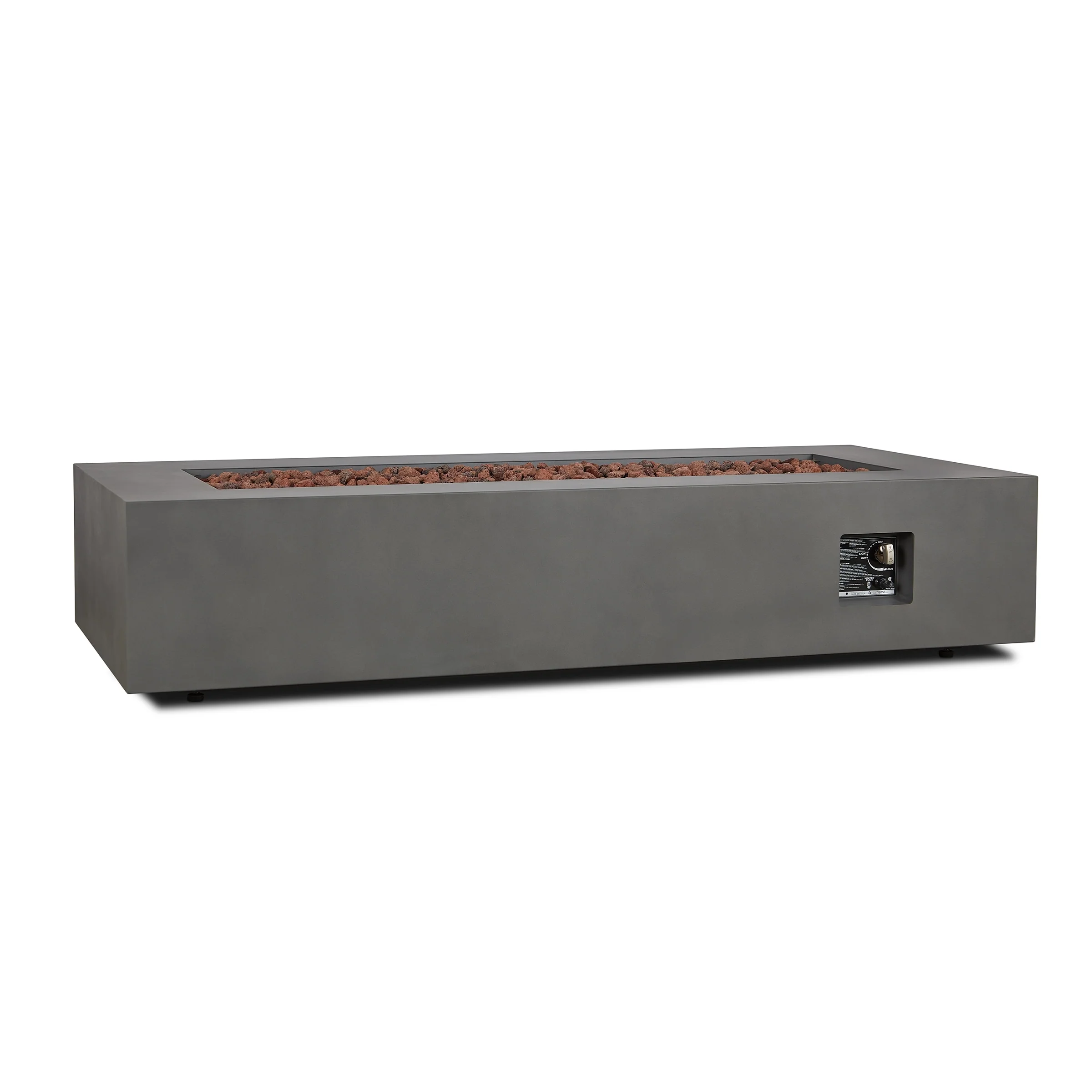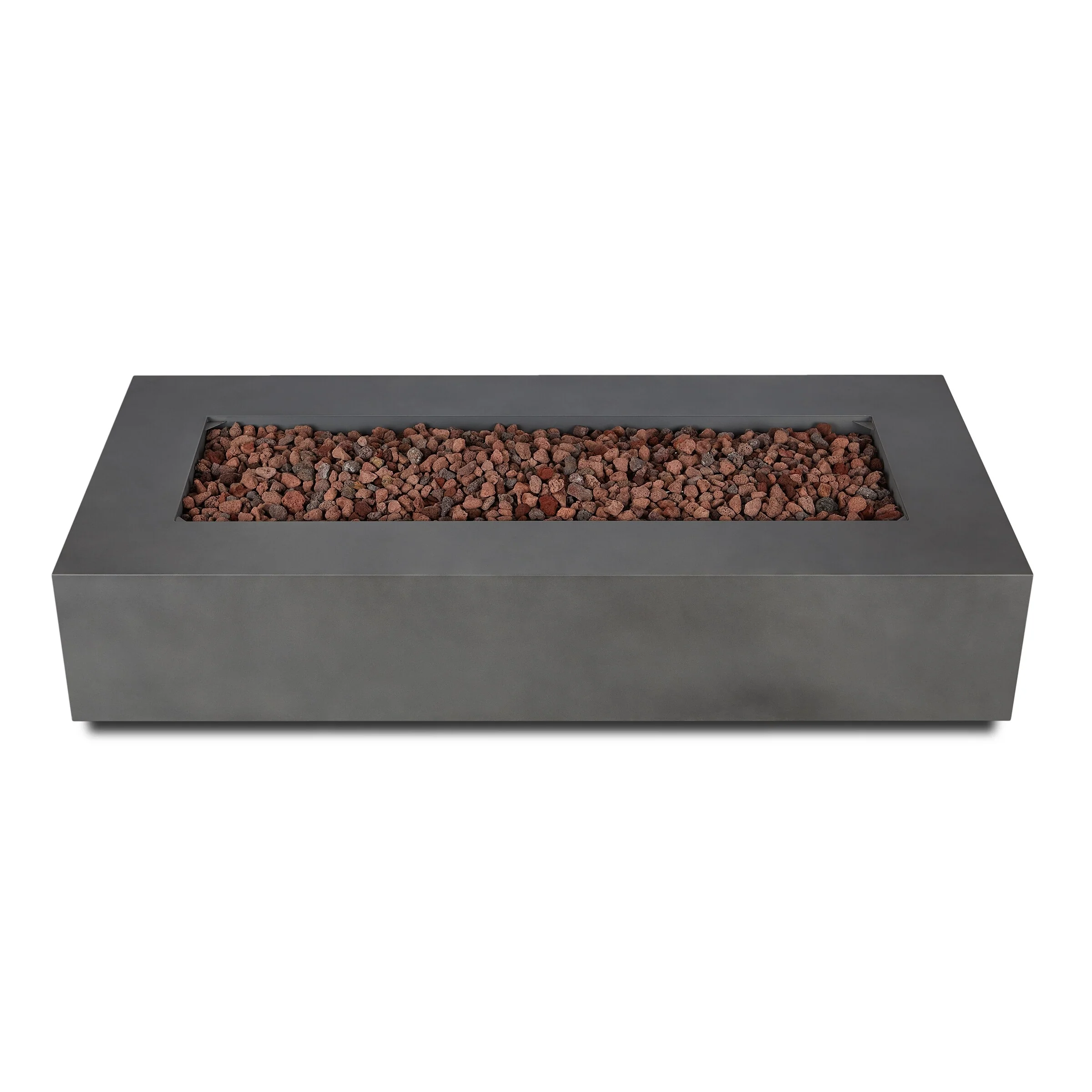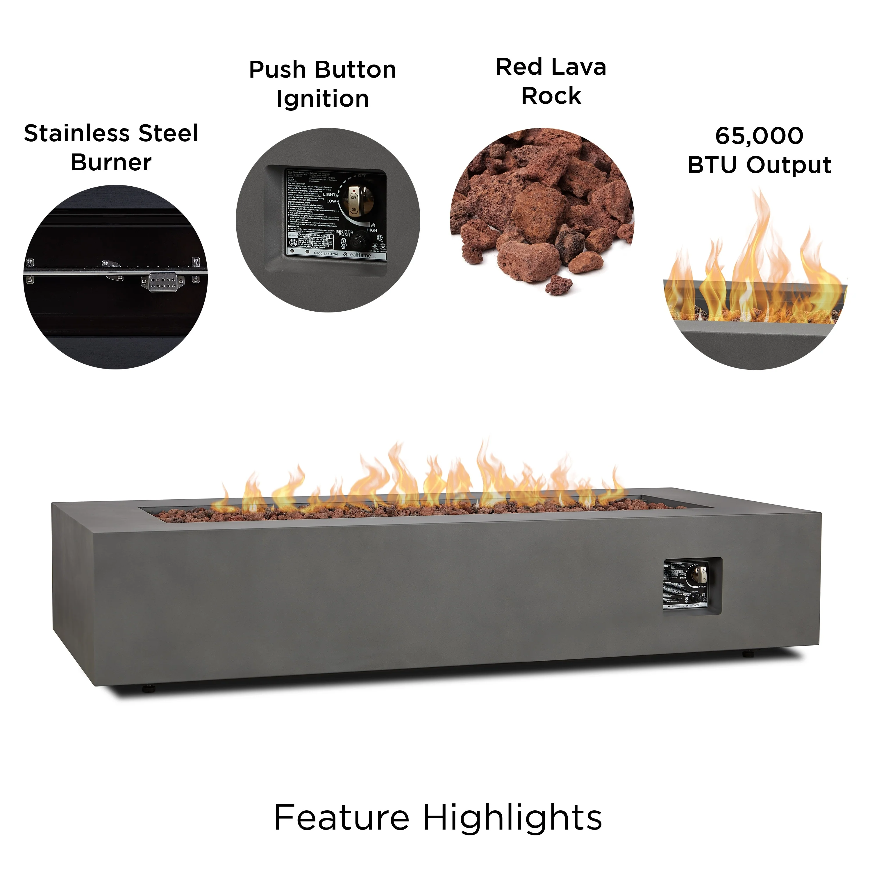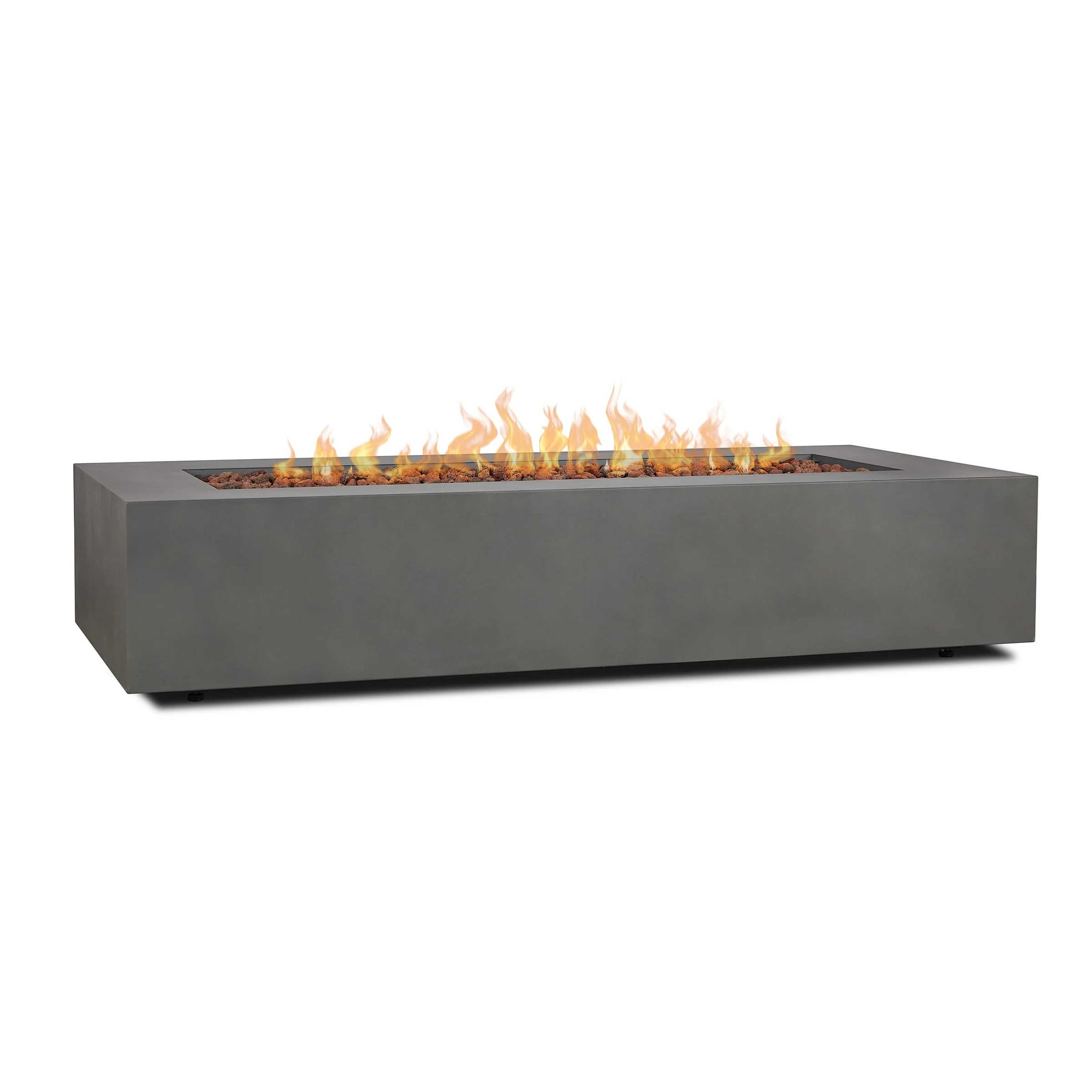 Make a stunning addition to your outdoor space with the clean, contemporary design of the Aegean 70' Rectangle Propane Fire Table. Low and linear, this large steel fire pit has a light textured finish and features a reliable push button ignition. When not in use, transform this fire feature into a useful coffee table with the included matching lid. Rated at 65,000 BTUs of heat, this extra large rectangle outdoor fire pit burns propane, but can be converted to natural gas by a certified natural gas technician using the included NG conversion kit. Create a beautiful outdoor entertainment space or upgrade your backyard with the low-profile and minimal style of this rustic, gray fireplace. Includes fire table with leveling feet, stainless steel burner, burner lid, rust brown lava rock, tank seat, 10' LP hose and regulator, and vinyl storage cover. Weathered Slate finish. At Real Flame, we are committed to providing safe, high-quality, beautifully designed and affordable fire pits, fire tables and outdoor fireplaces. Product Details: Aegean 70' Rectangle Propane Fire Table by Real Flame, 69.75'L x 31.75'W x 14.5'H; 154 lbs.