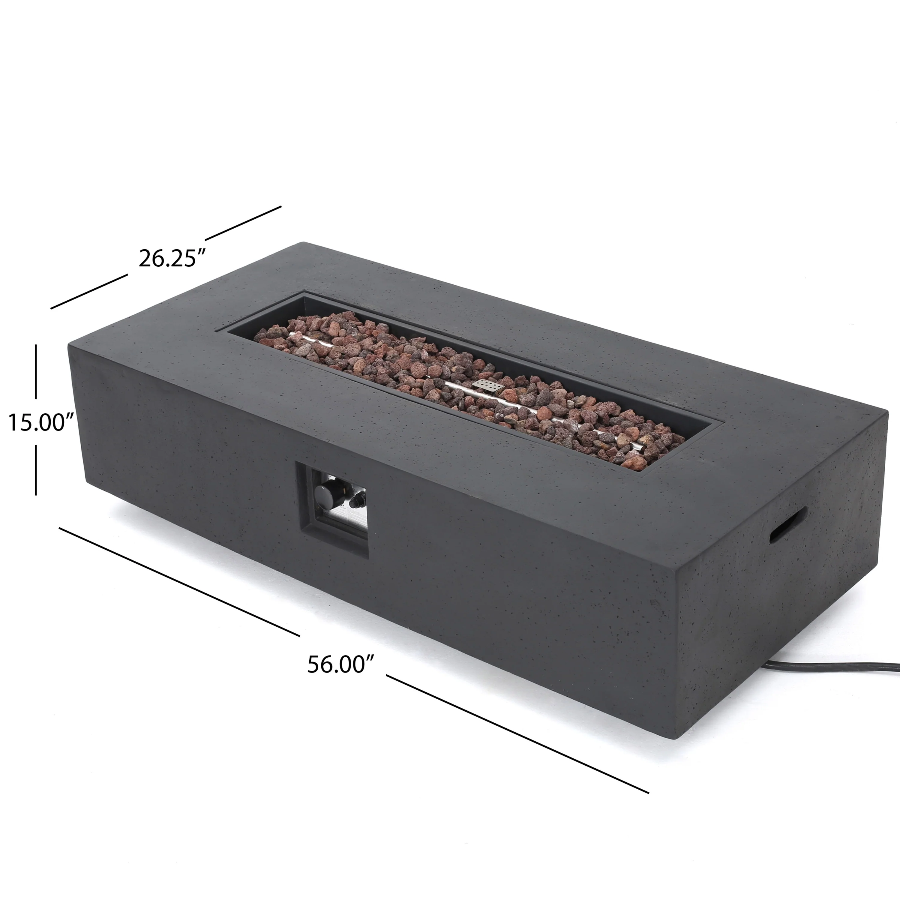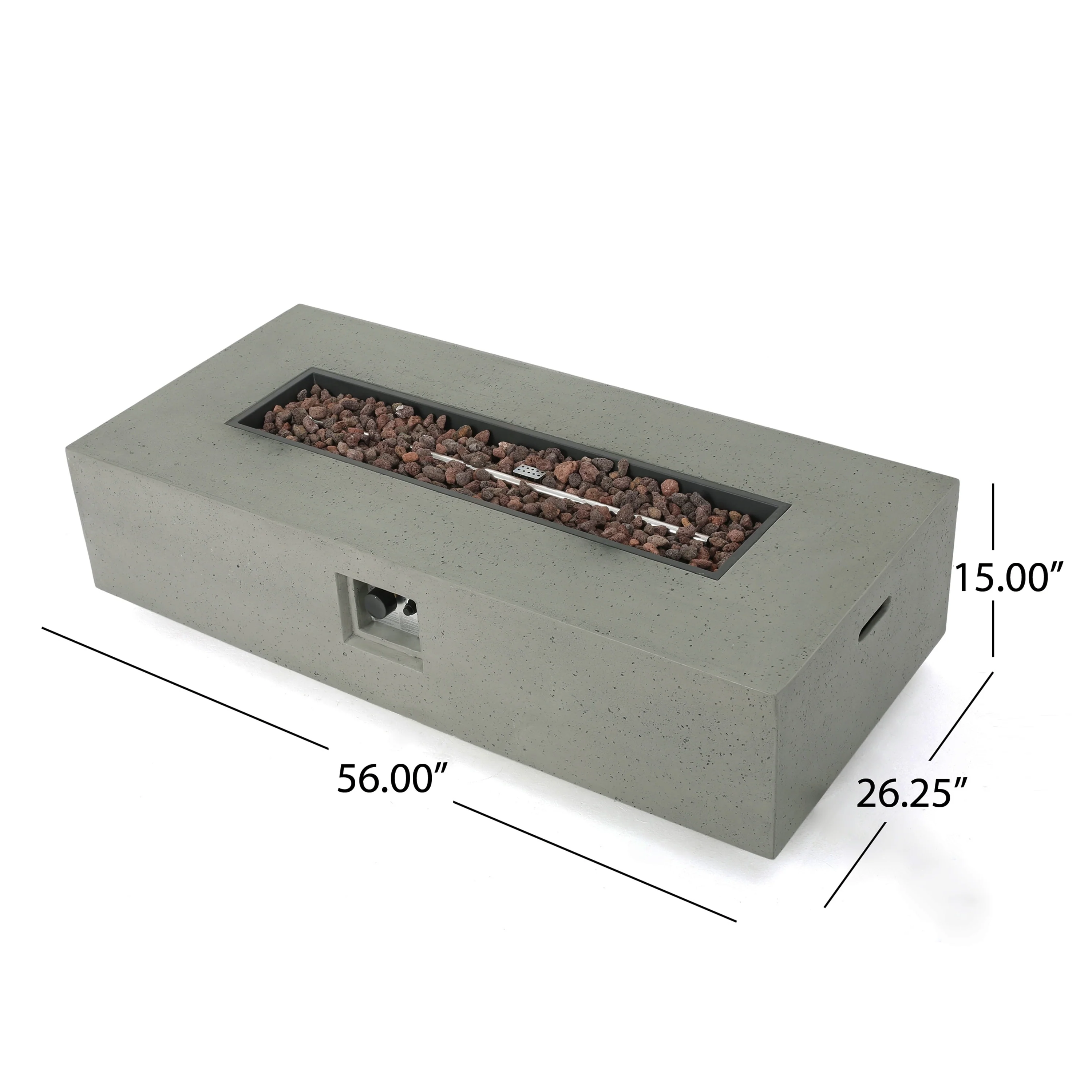 - Fire Pit Table Dimensions: 26.25 inches deep x 56.00 inches wide x 15.00 inches high