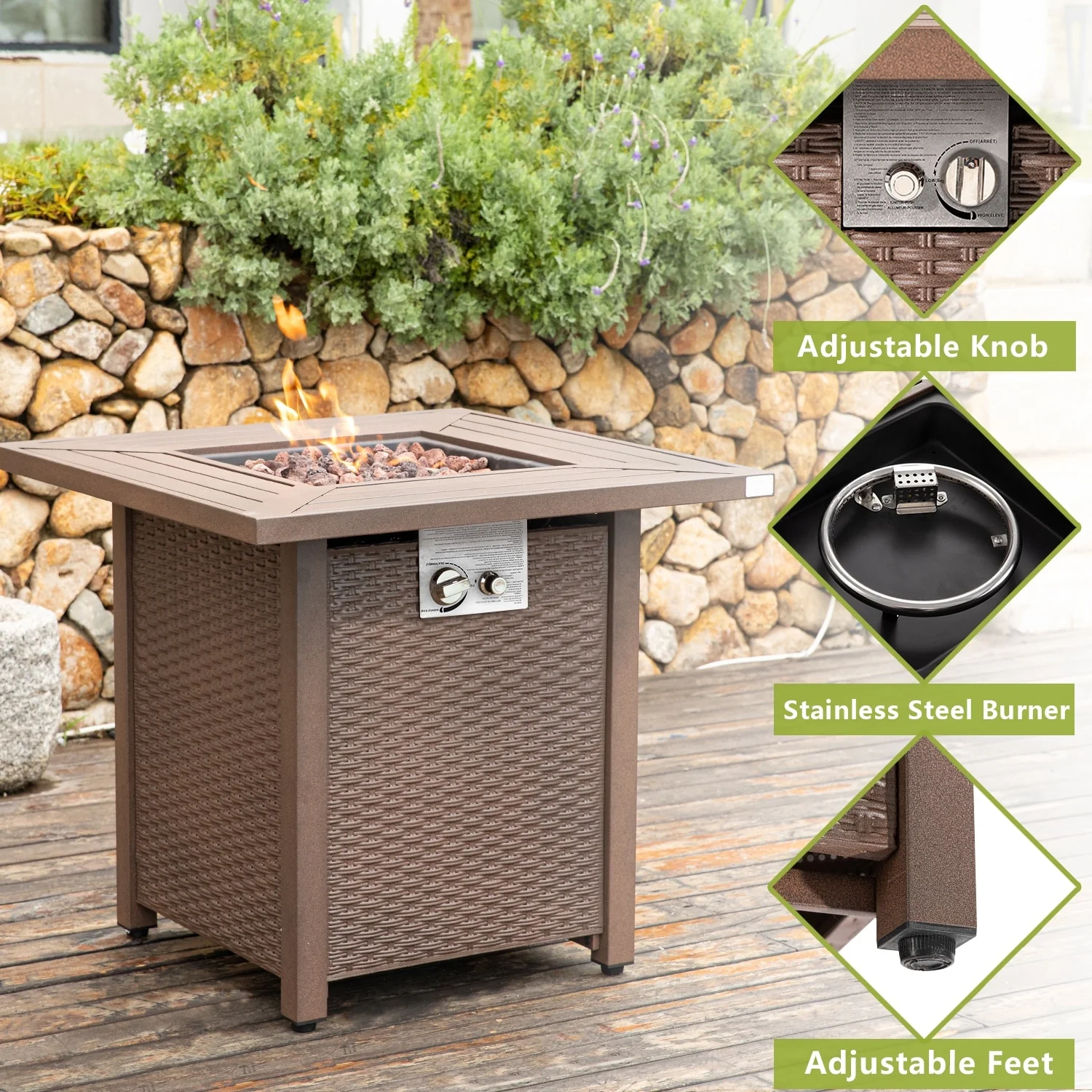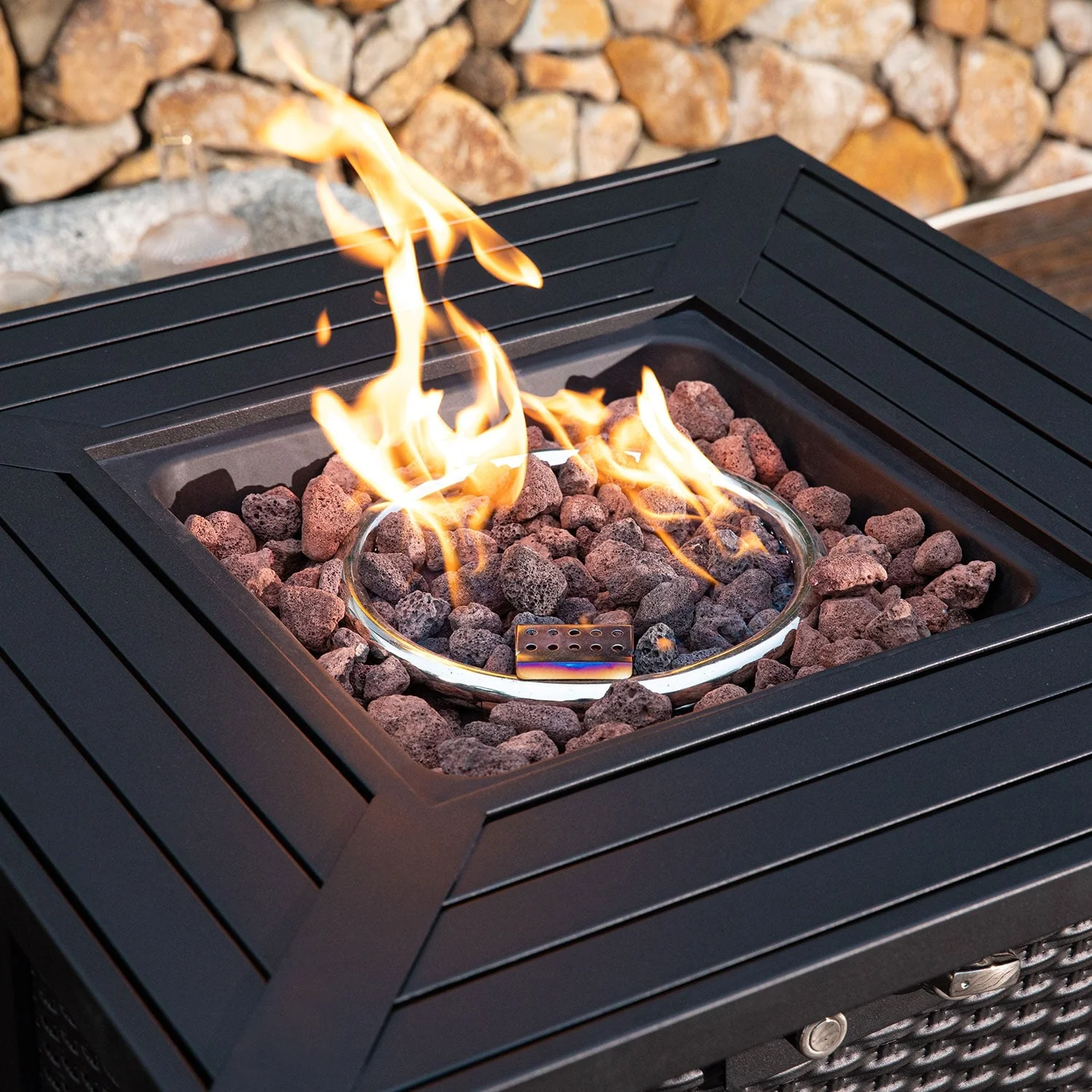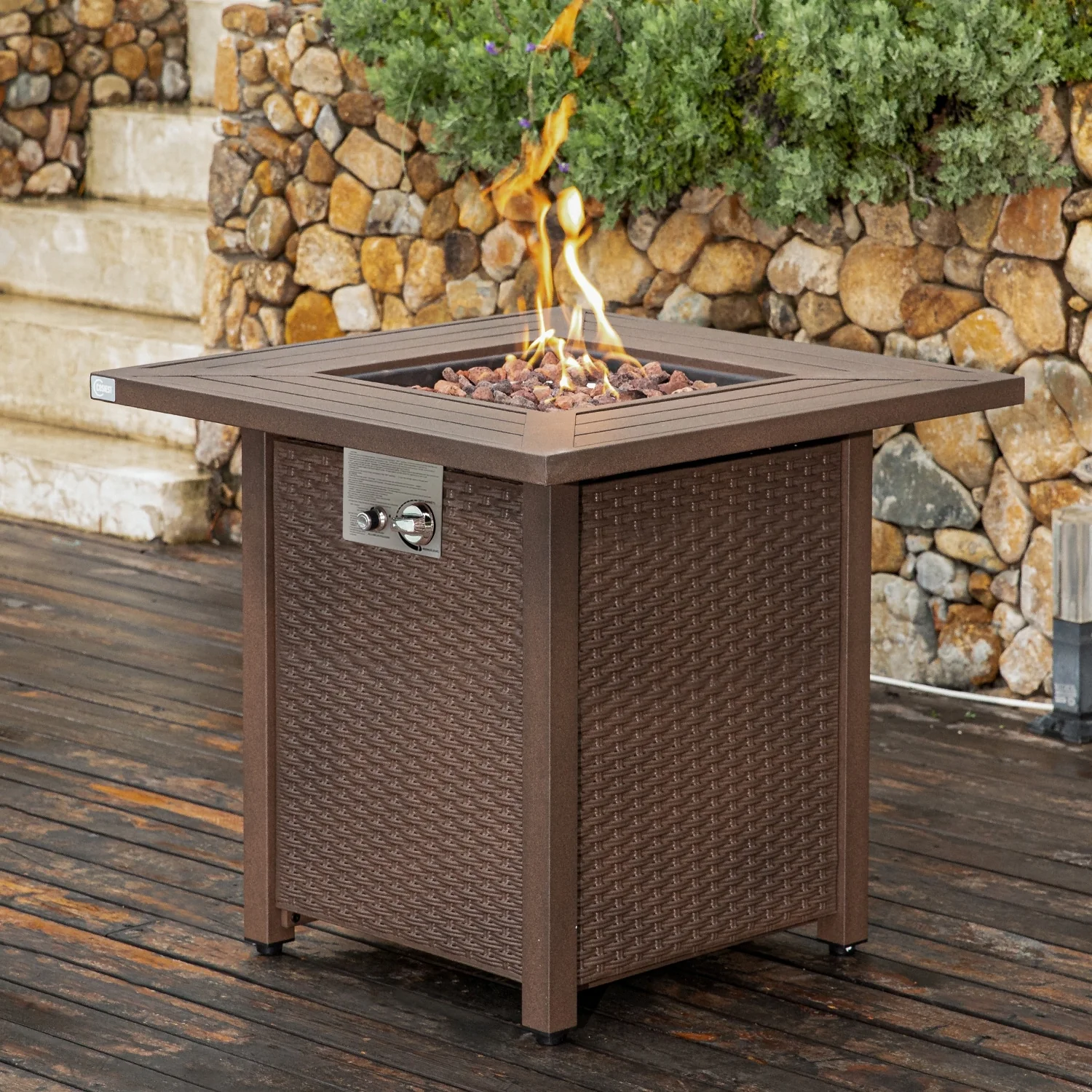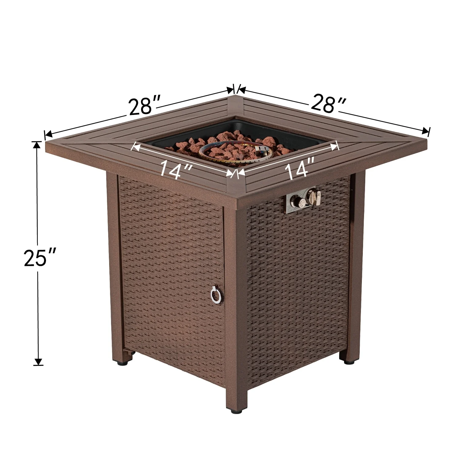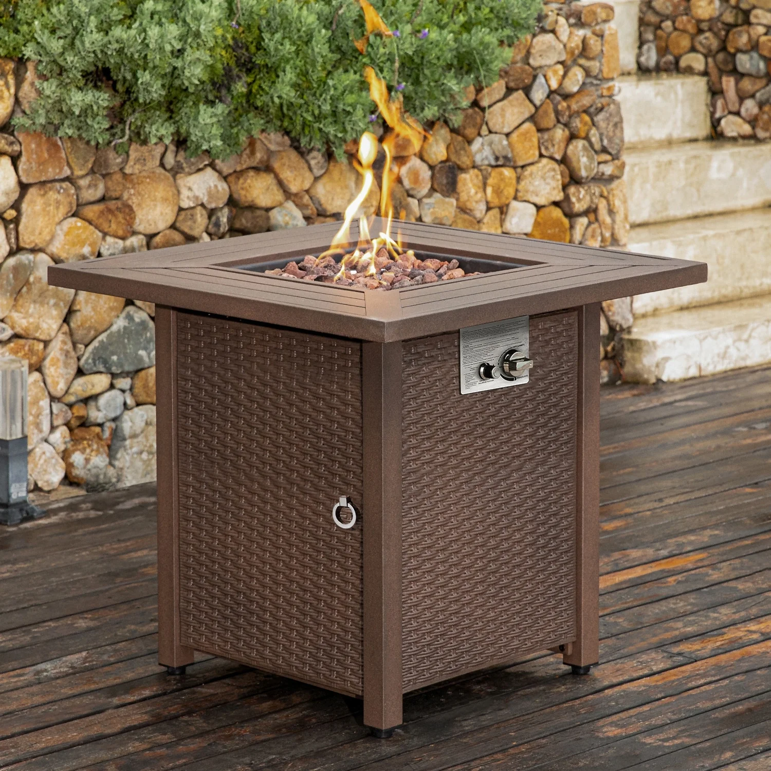 Extend the enjoyment of your outdoor space throughout the year with the COSIEST 40,000 BTU Outdoor 28-inch Square Metal Fire Table. Built with weather-resistant iron and a simulated wicker finish, this fire table can brave the elements while providing warmth on cool nights. This fire table comes in brown or black and includes an assembly kit, lava rocks, a metal cover, and a water-resistant cover. The fire pit contains a sunken fire bowl that can accommodate an optional glass wind guard (sold separately) and is safe for use on wooden decks. Assembly is required.
