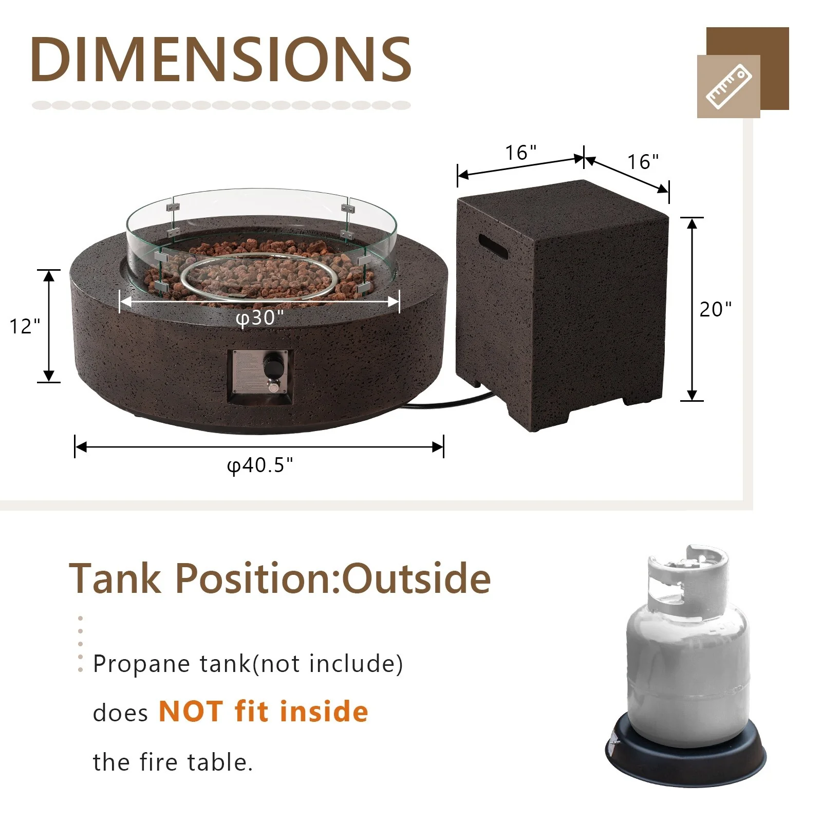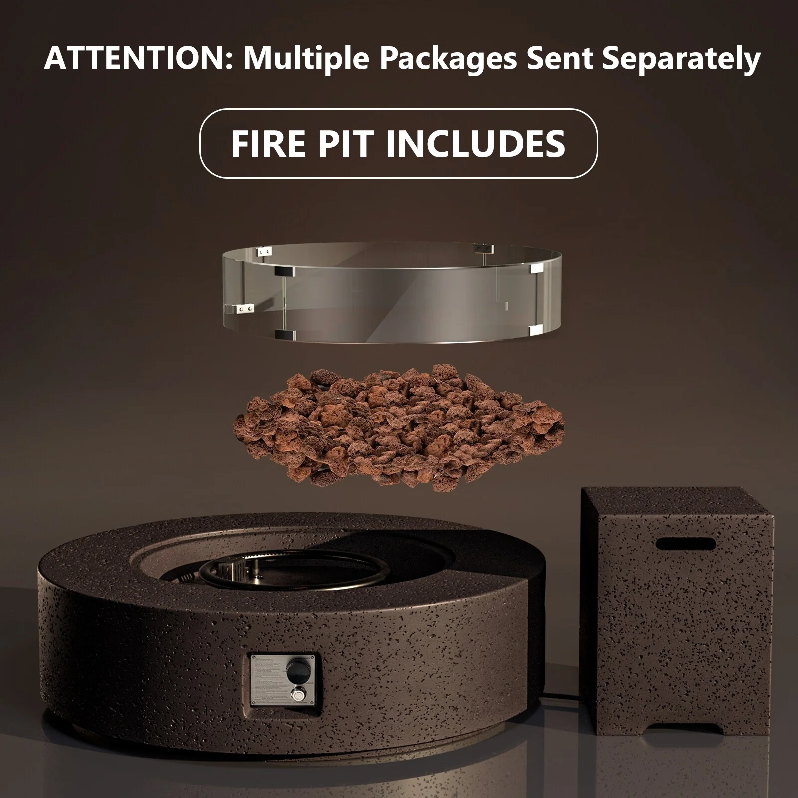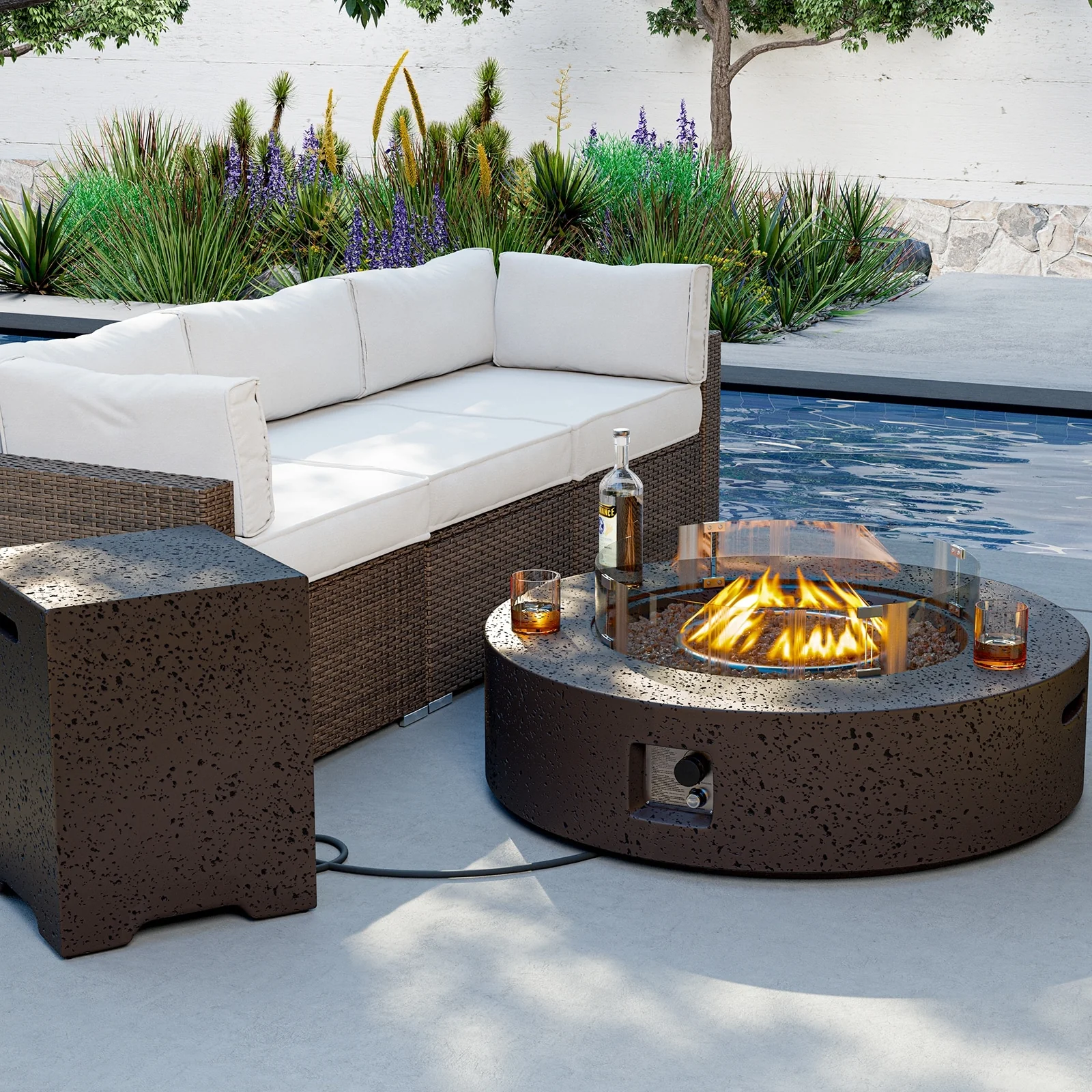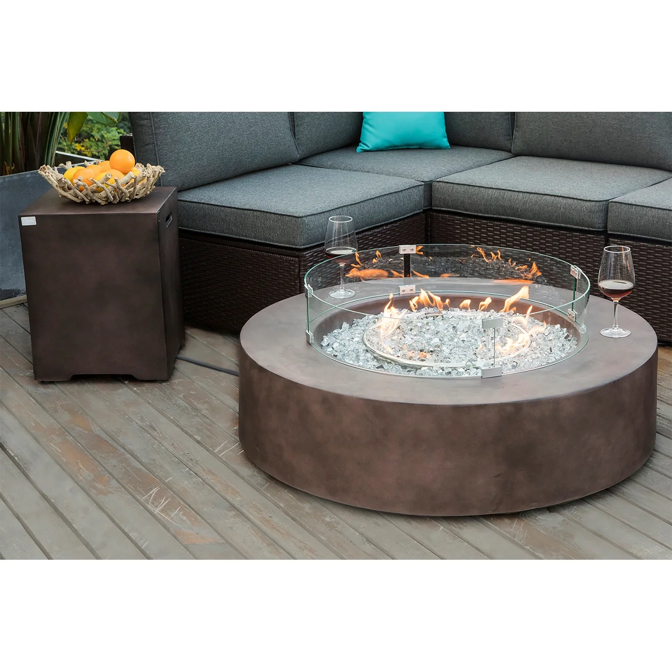 Gather with friends and family around the COSIEST Round Dark Brown Outdoor Patio Fire Pit Table with Wind Guard and Tank Table for a warm and memorable outdoor experience. This fire pit table features a 360-degree fireplace-in-the-round design that offers gentle lighting and soothing warmth without the mess and smoke of traditional wood-burning fire pits. Constructed from sturdy, fire-retardant magnesium oxide and stainless steel, this ultramodern dark bronze finished fire pit is built to last. The natural red lava pieces in the burner bowl retain heat longer, making it perfect for chilly evenings. The tank table keeps the propane tank hidden and doubles as a convenient side table.