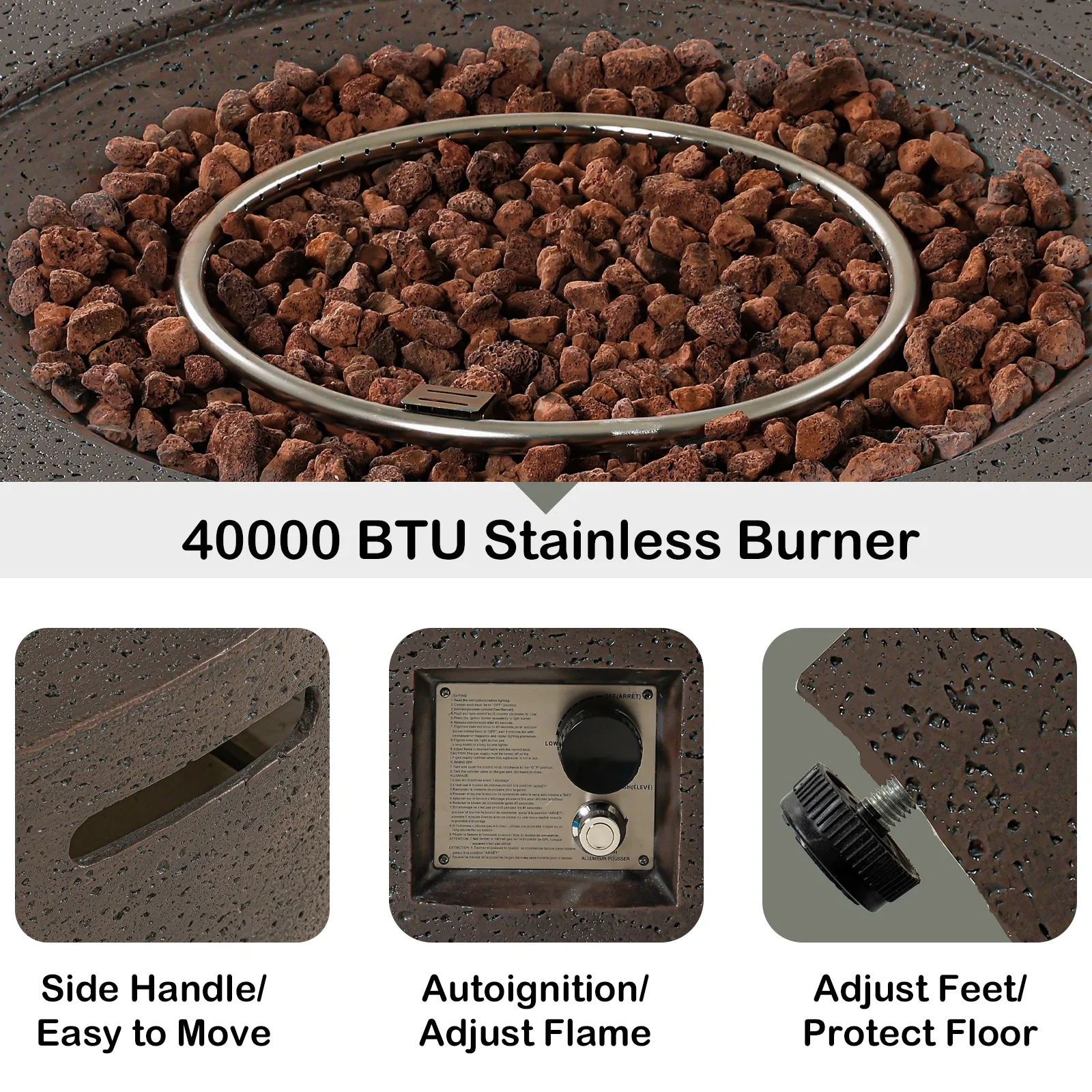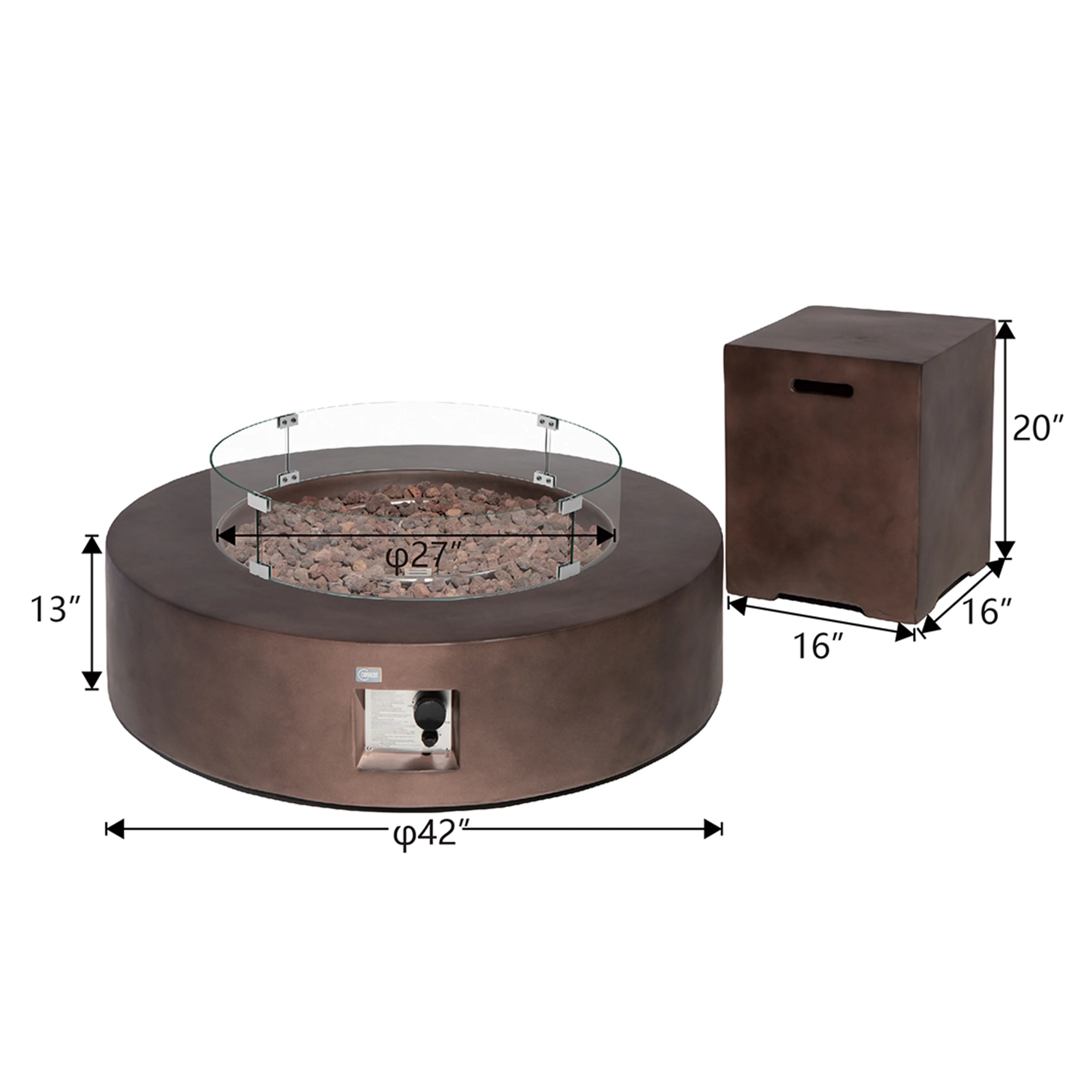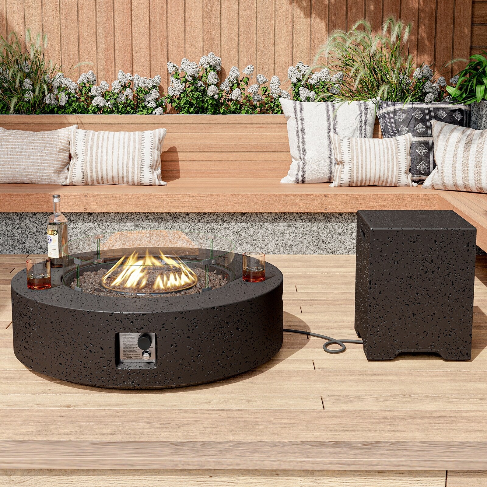 Gather with friends and family around the COSIEST Round Dark Brown Outdoor Patio Fire Pit Table with Wind Guard and Tank Table for a warm and memorable outdoor experience. This fire pit table features a 360-degree fireplace-in-the-round design that offers gentle lighting and soothing warmth without the mess and smoke of traditional wood-burning fire pits. Constructed from sturdy, fire-retardant magnesium oxide and stainless steel, this ultramodern dark bronze finished fire pit is built to last. The natural red lava pieces in the burner bowl retain heat longer, making it perfect for chilly evenings. The tank table keeps the propane tank hidden and doubles as a convenient side table.