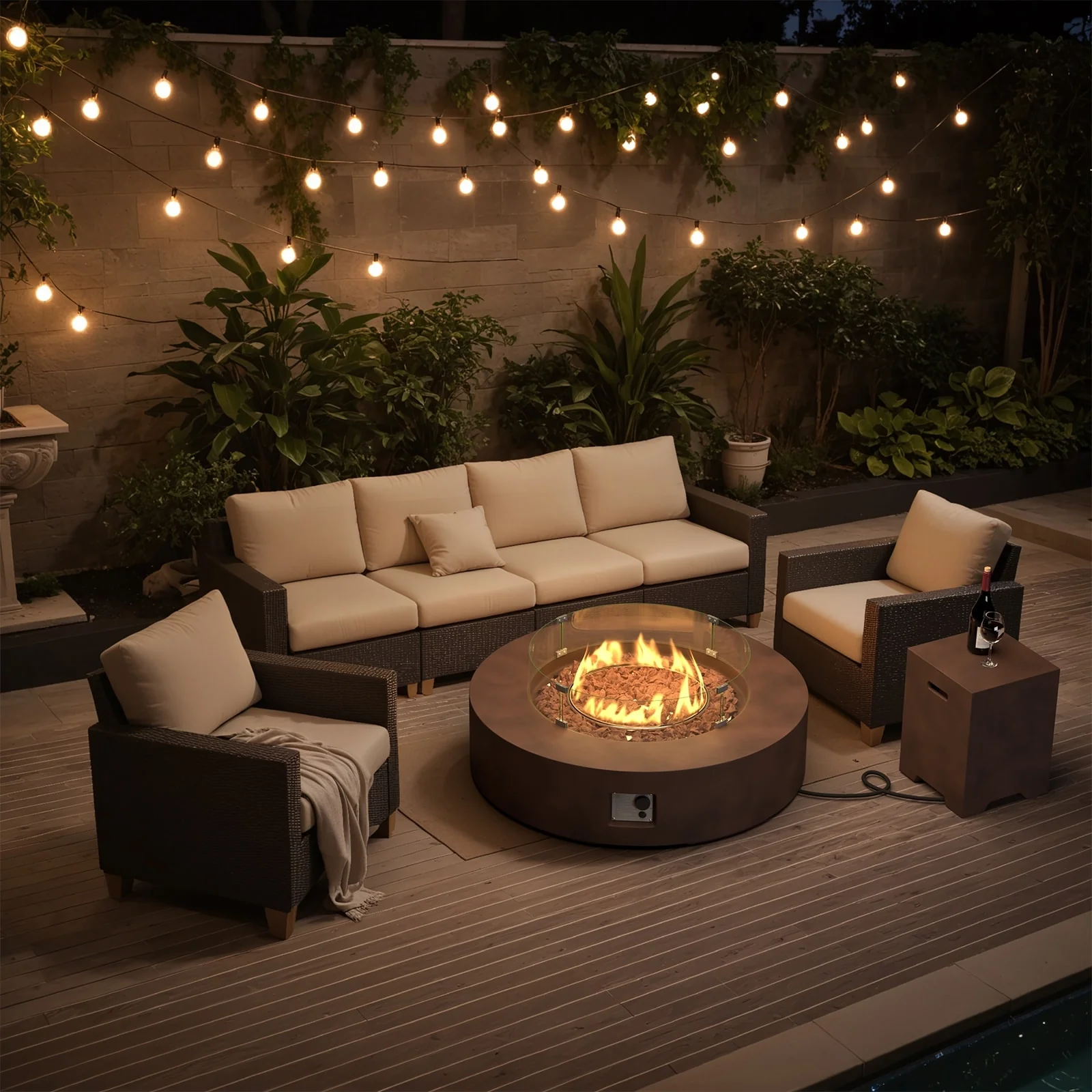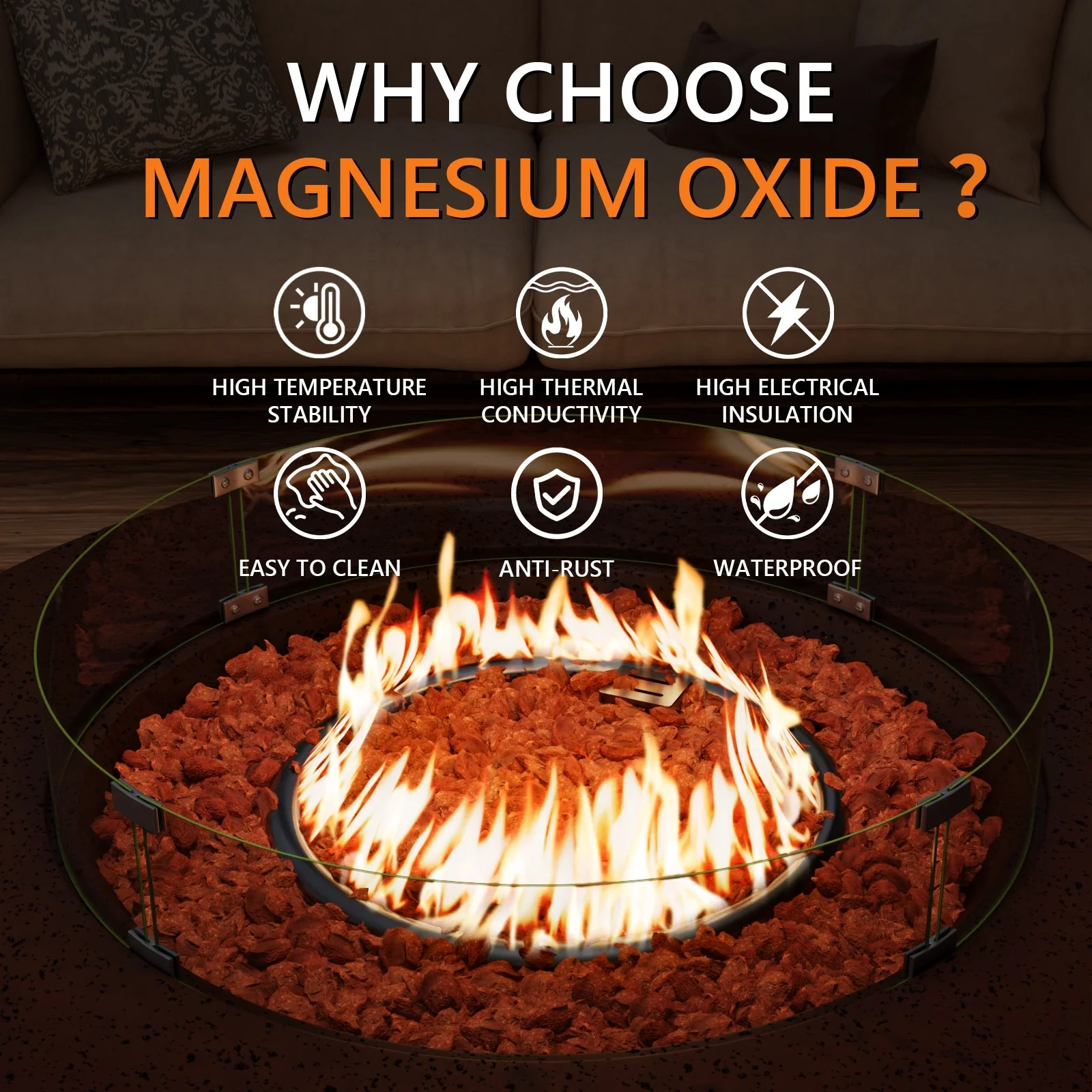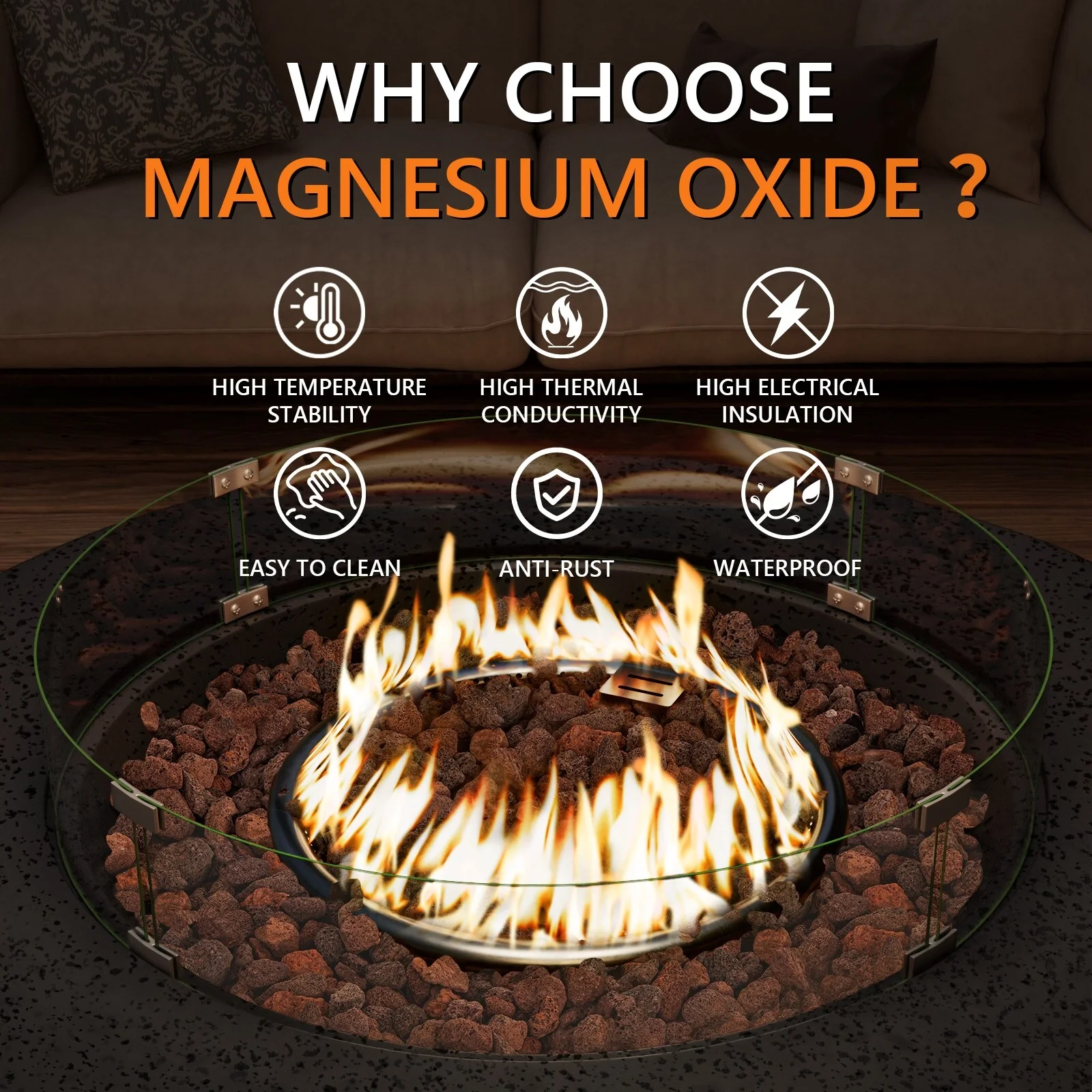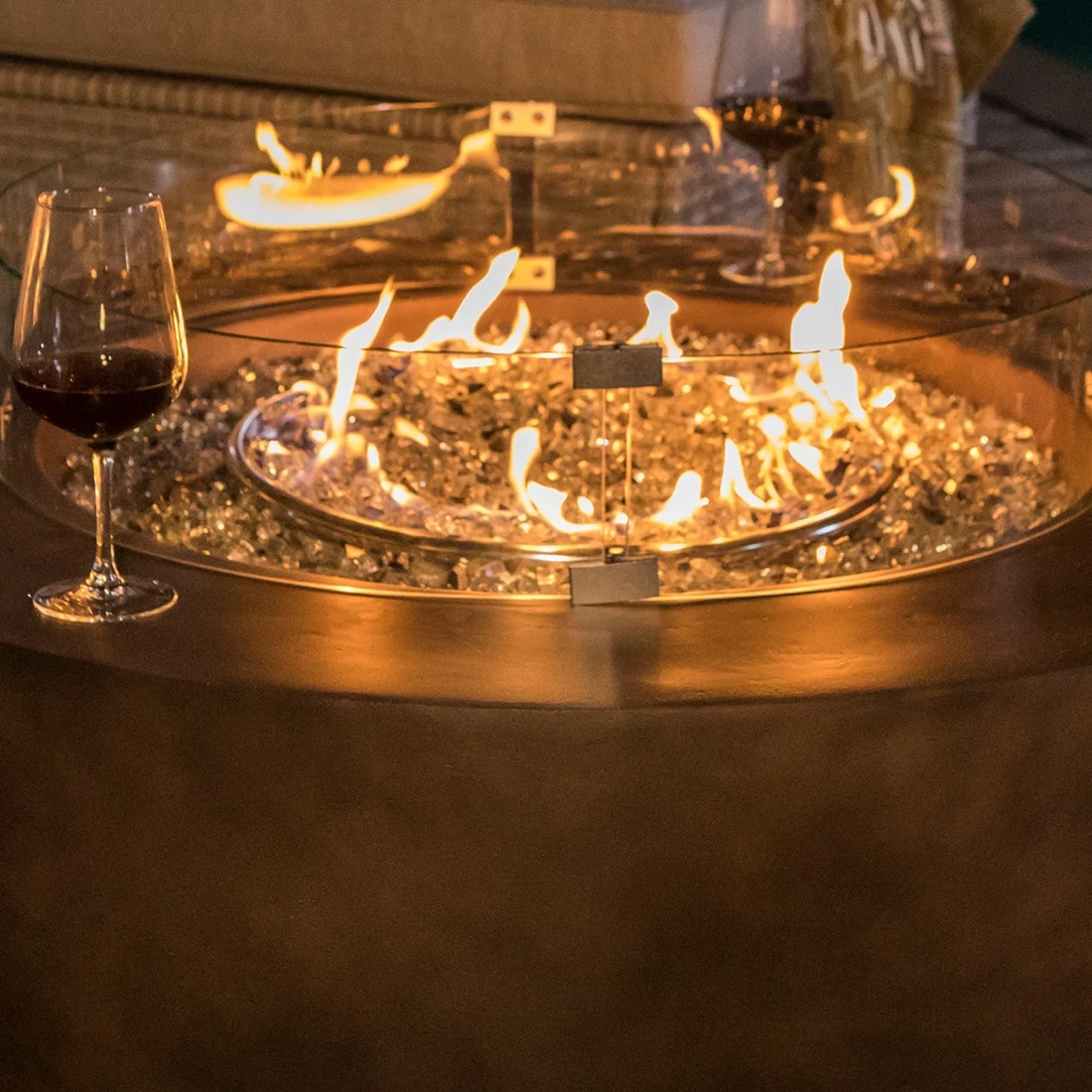 Gather with friends and family around the COSIEST Round Dark Brown Outdoor Patio Fire Pit Table with Wind Guard and Tank Table for a warm and memorable outdoor experience. This fire pit table features a 360-degree fireplace-in-the-round design that offers gentle lighting and soothing warmth without the mess and smoke of traditional wood-burning fire pits. Constructed from sturdy, fire-retardant magnesium oxide and stainless steel, this ultramodern dark bronze finished fire pit is built to last. The natural red lava pieces in the burner bowl retain heat longer, making it perfect for chilly evenings. The tank table keeps the propane tank hidden and doubles as a convenient side table.