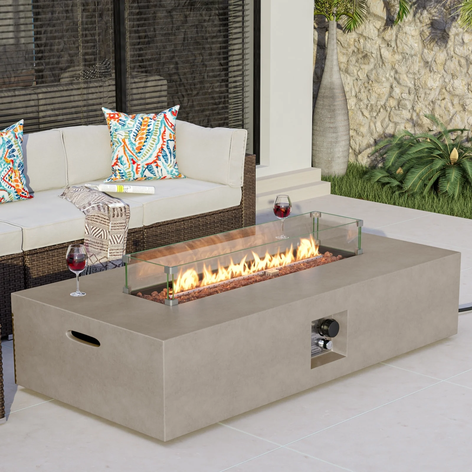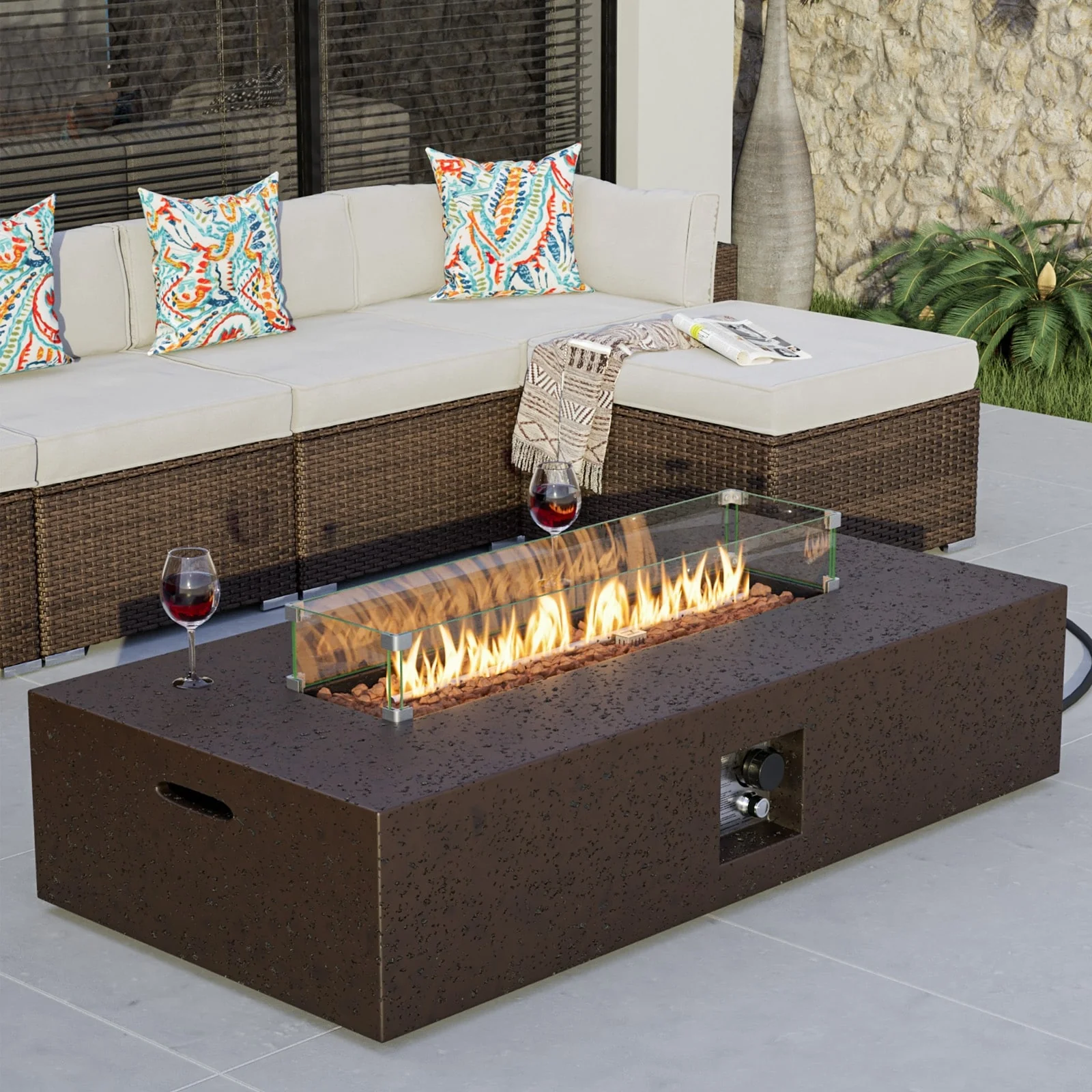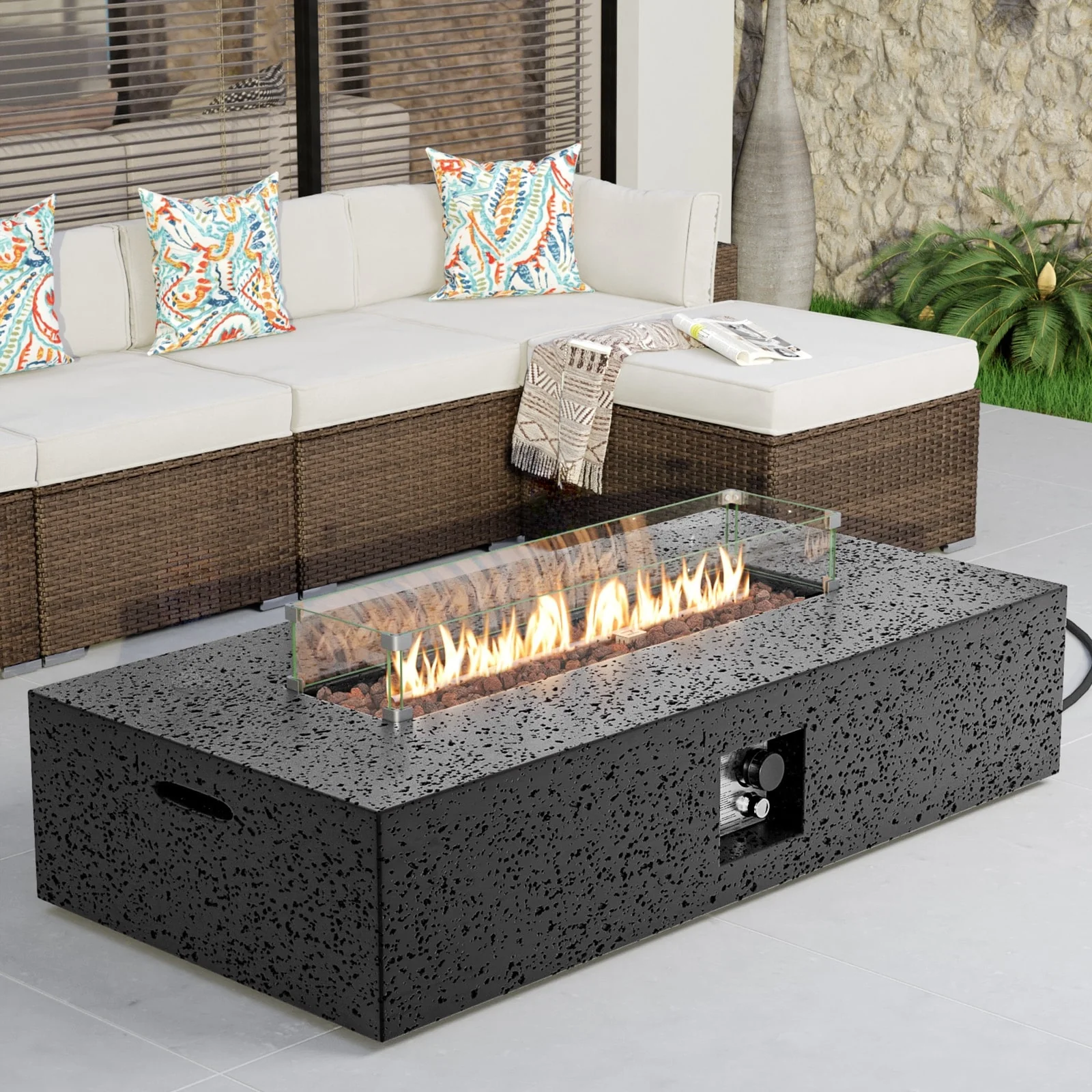 Stay warm and cozy in your outdoor space with the COSIEST Outdoor Patio Propane Rectangular Fire Pit Table. The elegant stacked concrete-like mantle appearance adds a sophisticated touch, while the 50000 BTUs of heat provide ample warmth. The natural red lava pieces in the burner bowl ensure even heat distribution, and the wind guard keeps the flame burning bright even in windy conditions. Move it conveniently with the built-in side handles and store it easily with the included waterproof cover.