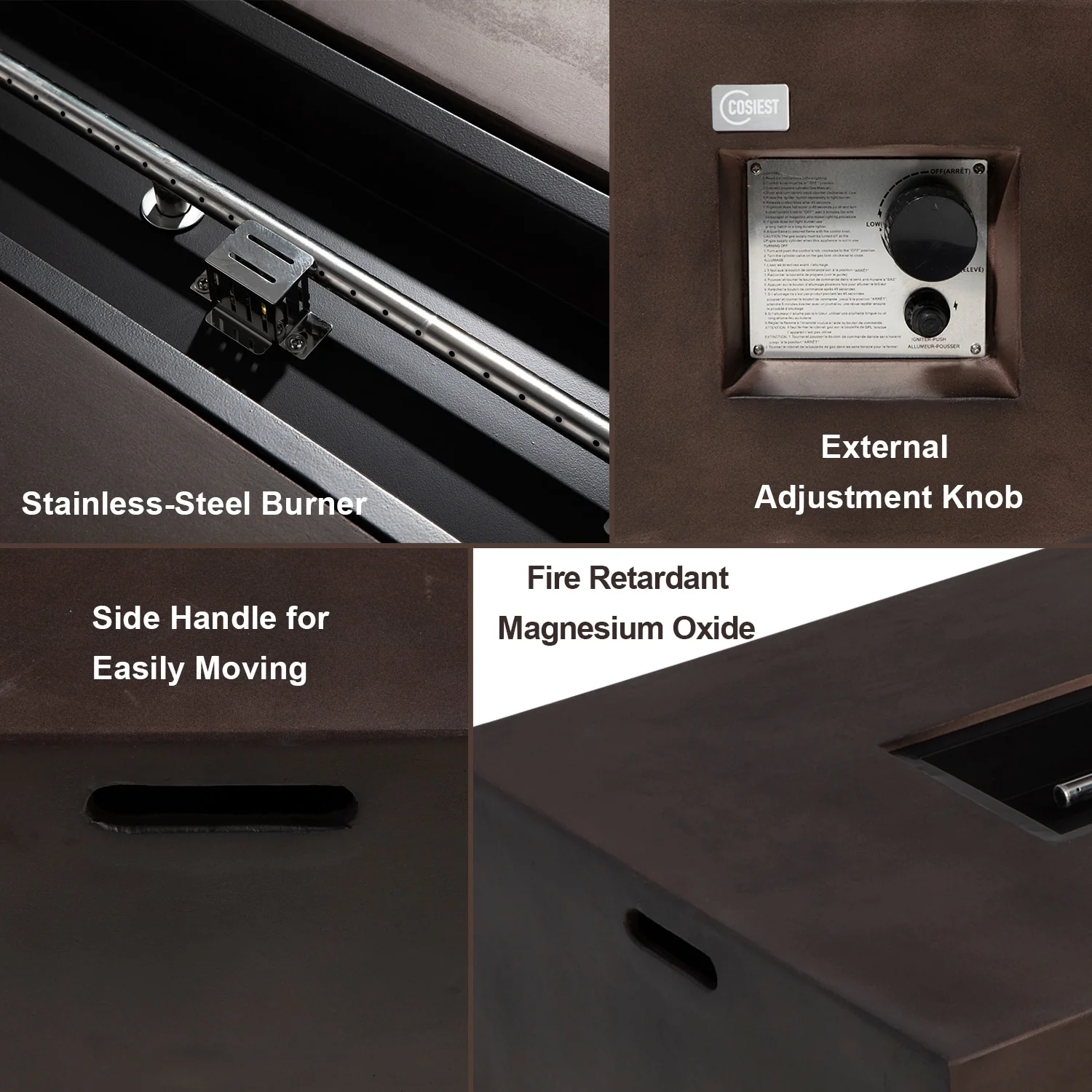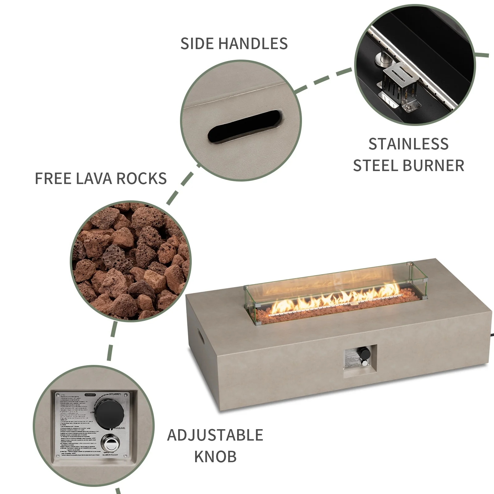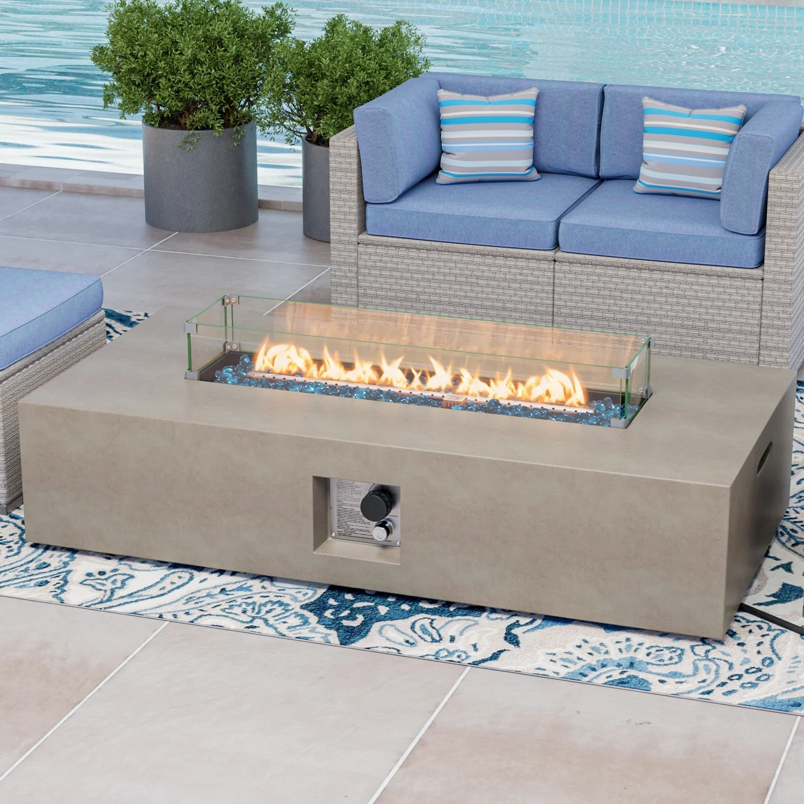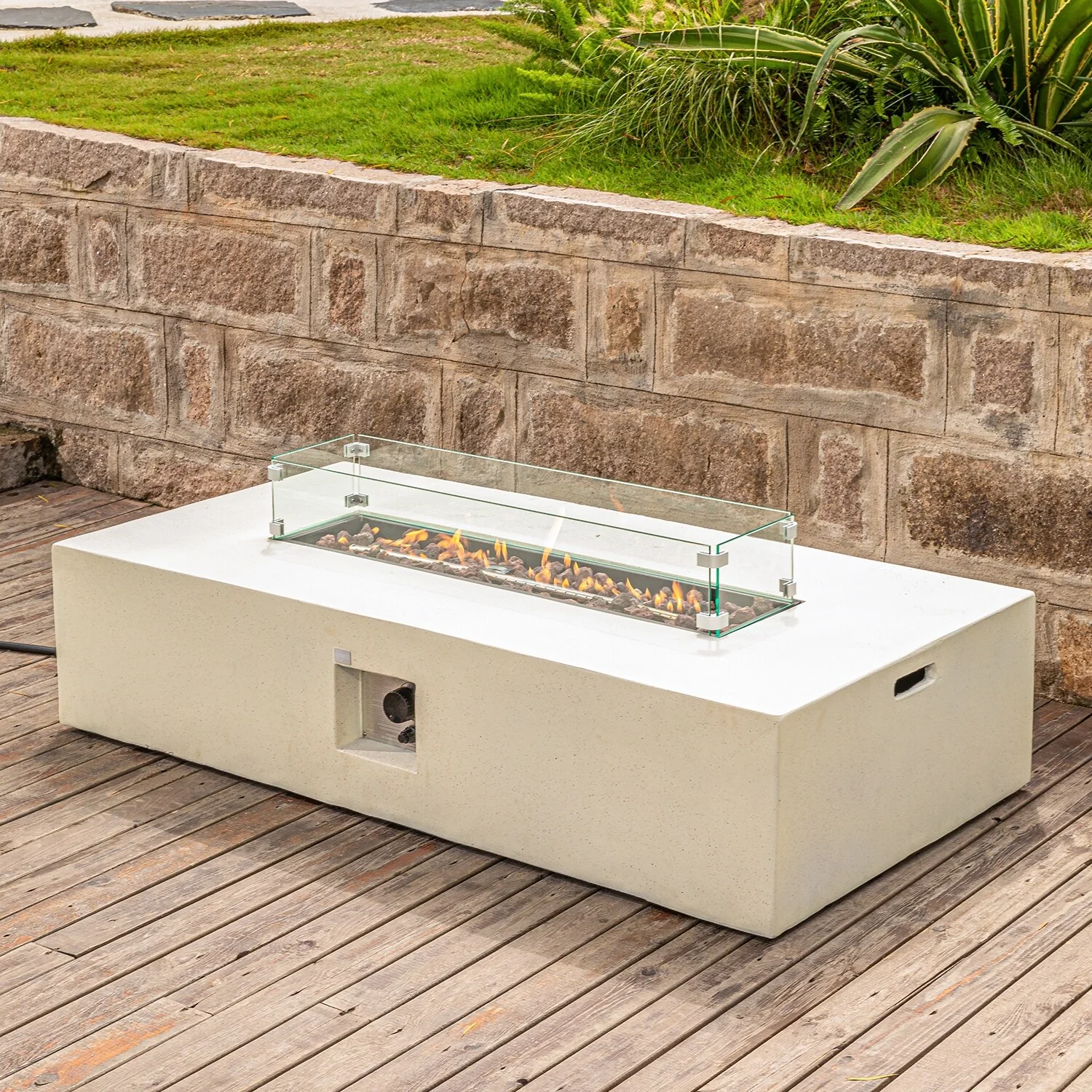 Stay warm and cozy in your outdoor space with the COSIEST Outdoor Patio Propane Rectangular Fire Pit Table. The elegant stacked concrete-like mantle appearance adds a sophisticated touch, while the 50000 BTUs of heat provide ample warmth. The natural red lava pieces in the burner bowl ensure even heat distribution, and the wind guard keeps the flame burning bright even in windy conditions. Move it conveniently with the built-in side handles and store it easily with the included waterproof cover.