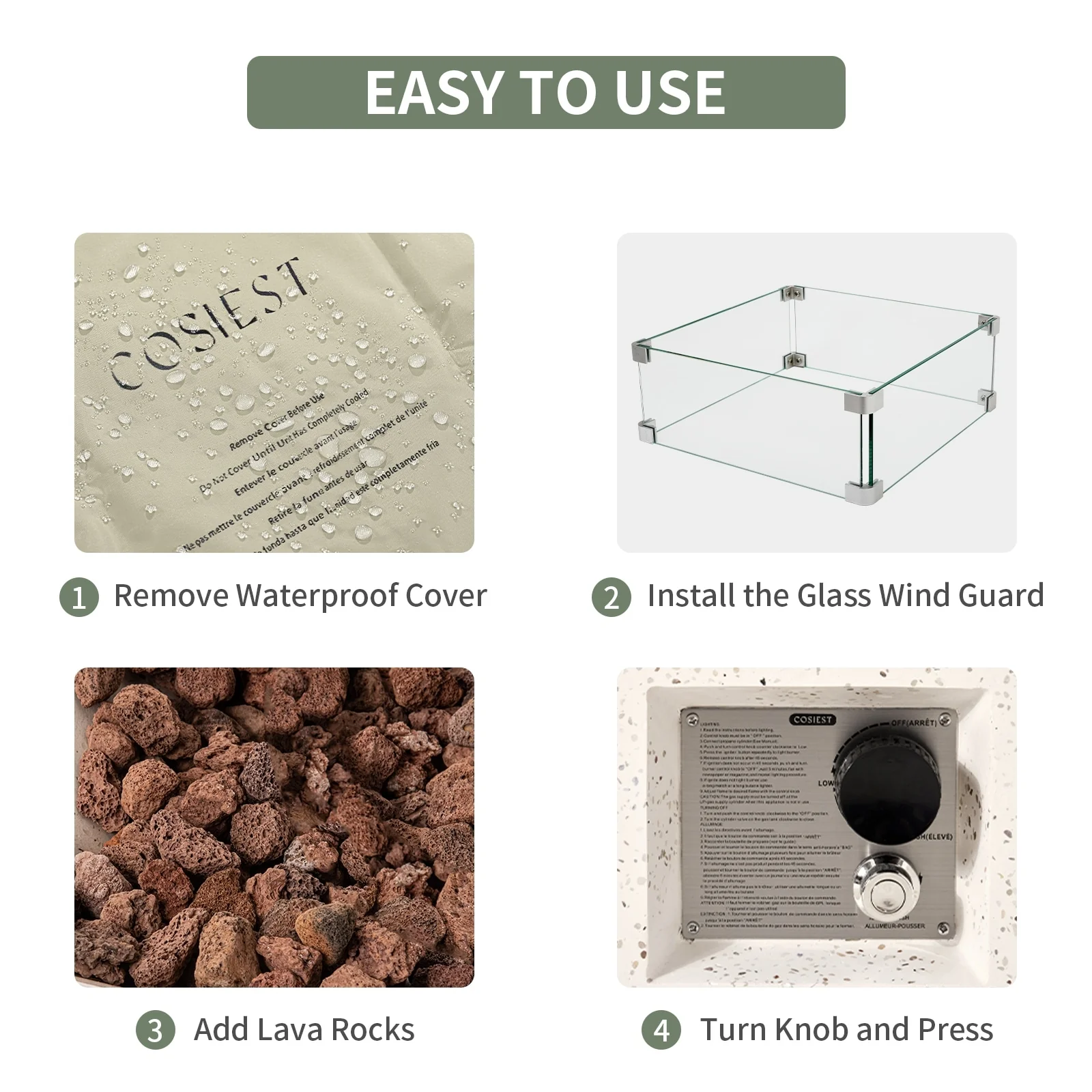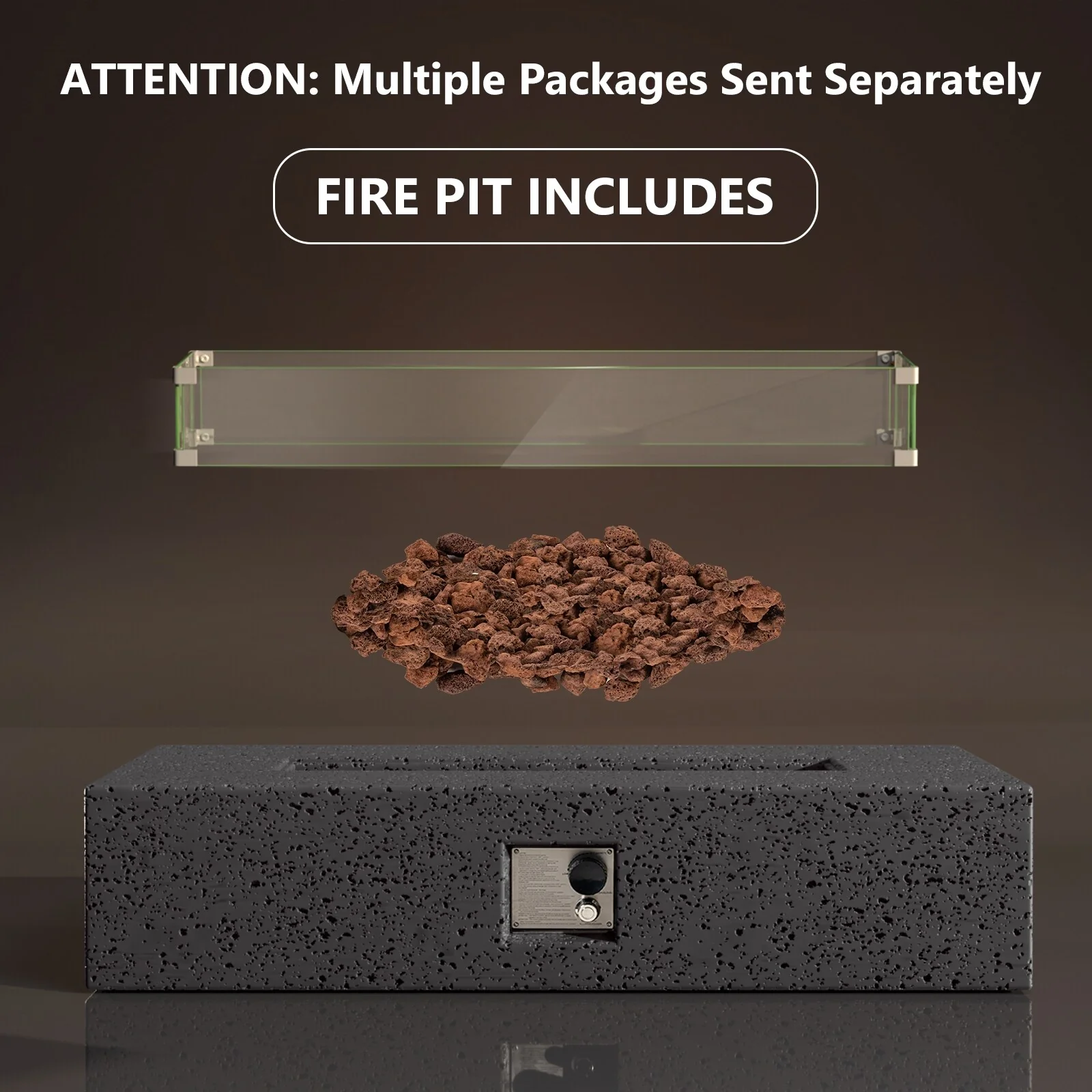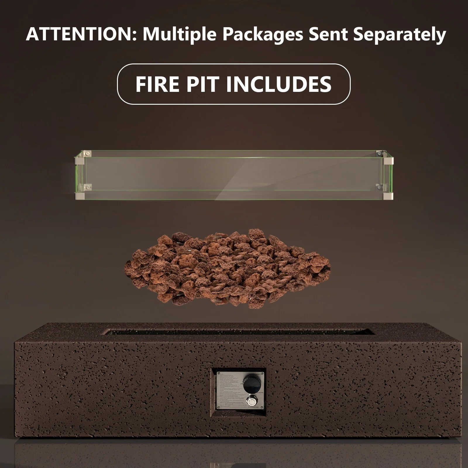 - Includes main frame of fire table, free lava rocks (13 lbs), rain cover, AA battery, metal fixator, and glass wind guard