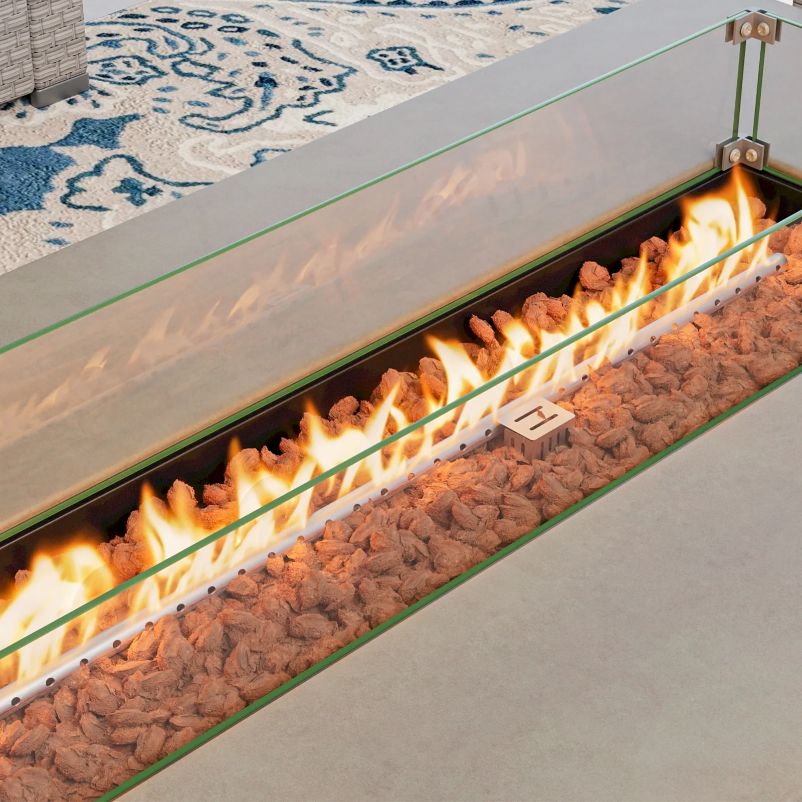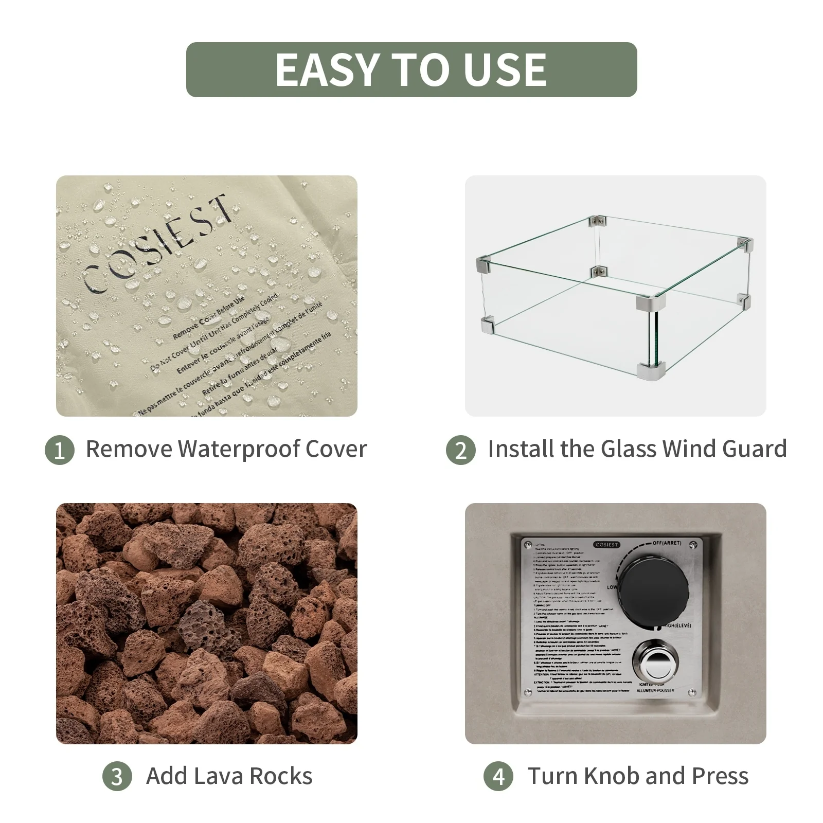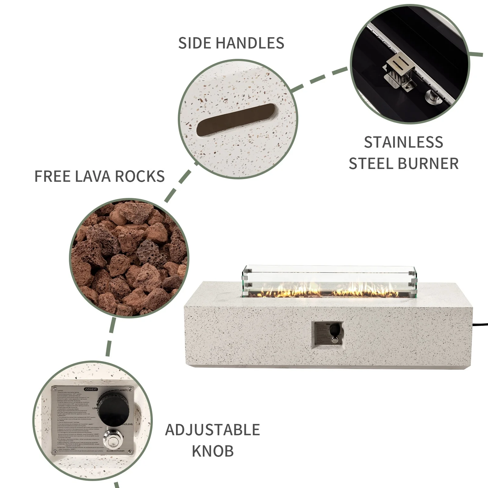 - Includes main frame of fire table, free lava rocks (13 lbs), rain cover, AA battery, metal fixator, and glass wind guard