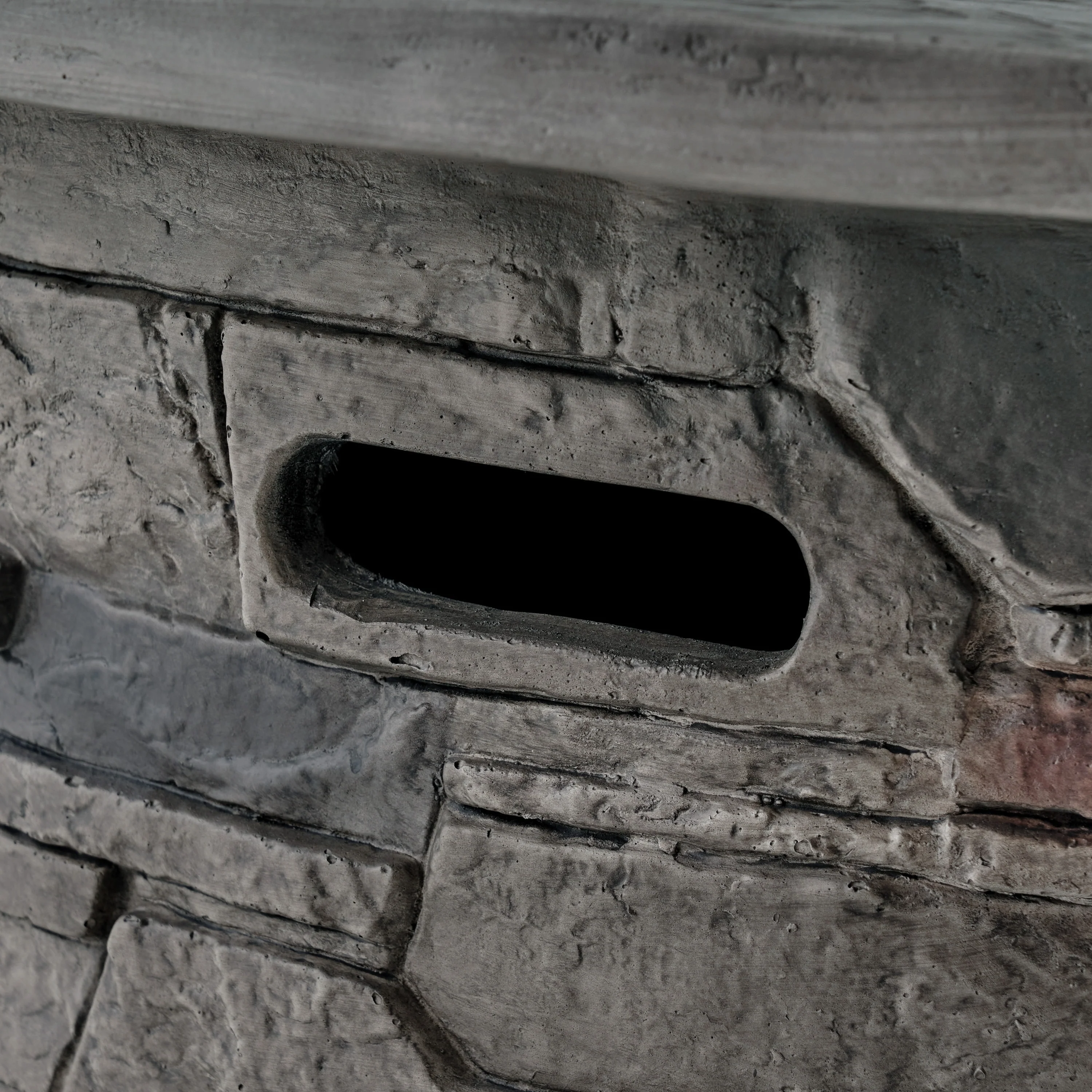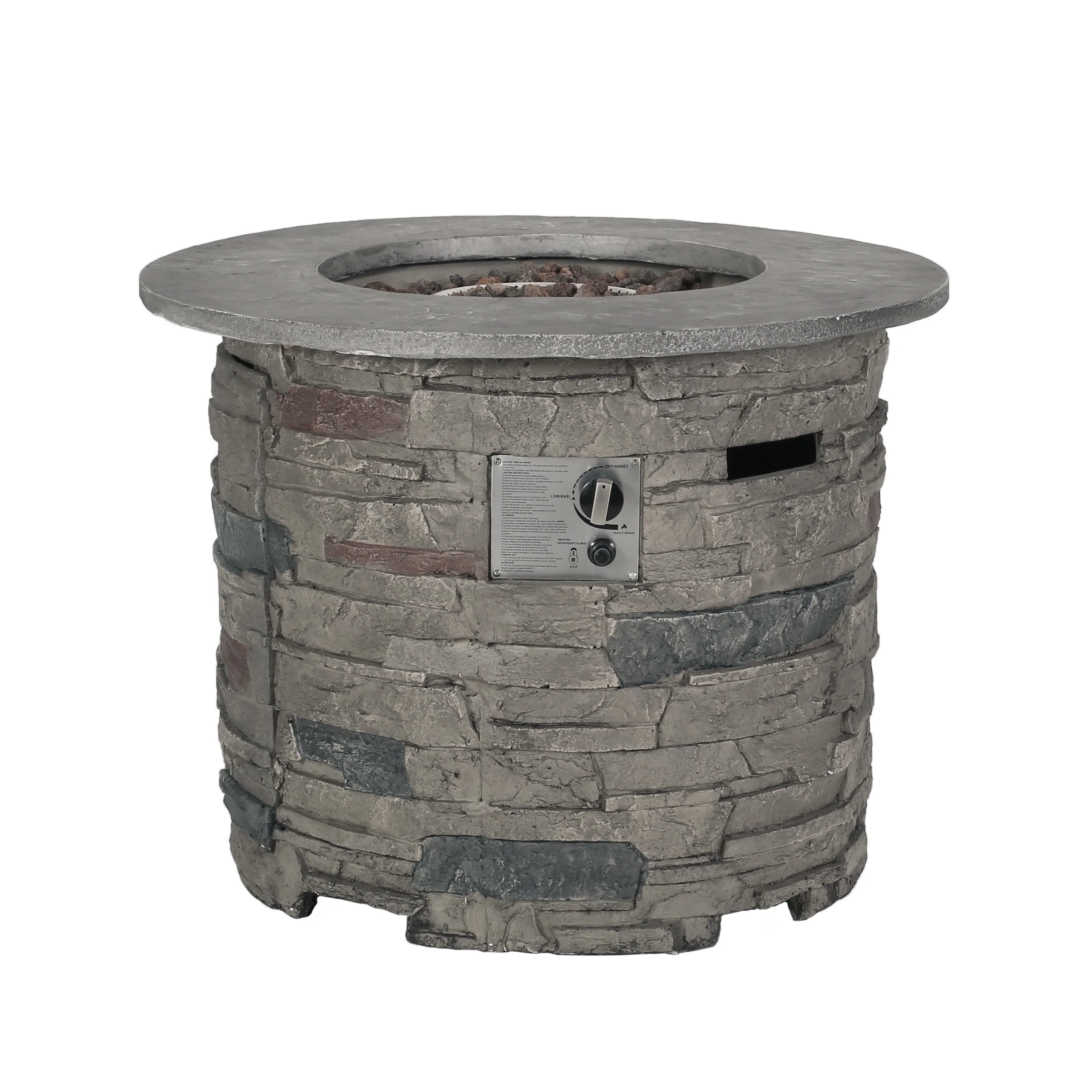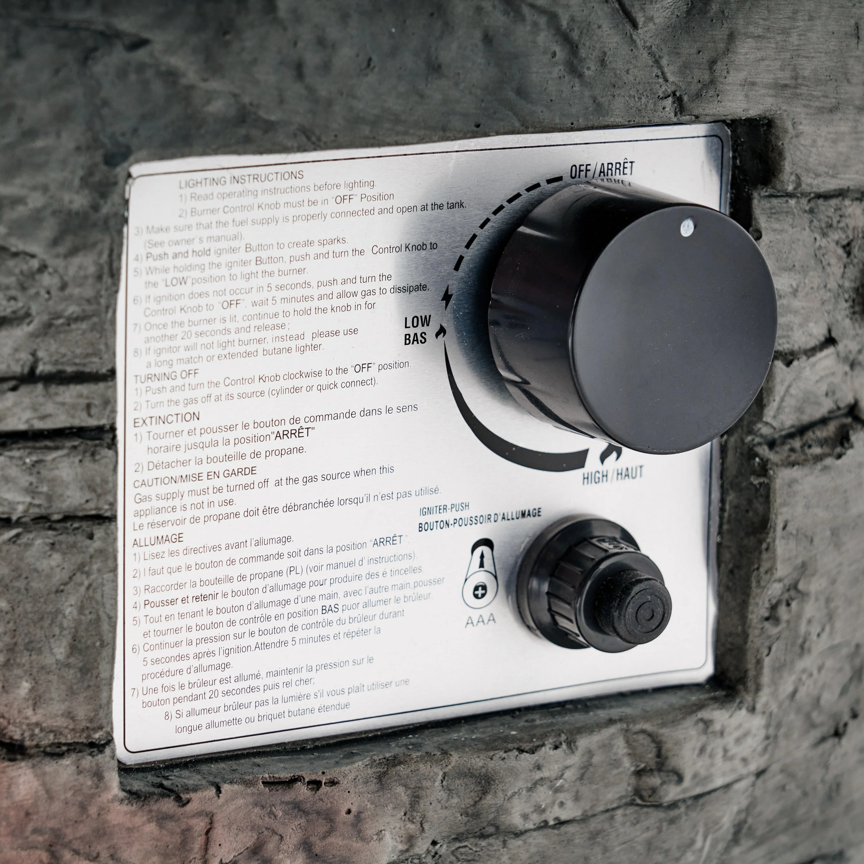 Enjoy your own mini camping experience with your family in your own back yard, complete with our stunning fire pit. Highlight your patio or backyard space with this luxurious fire pit with a conveniently included tank space while keeping your company snug with its all-inclusive seating possibilities. Its simply shaped structure, classic stone finish, and black top bring you and your guests together for intimate conversations and endless fond memories. Complete with brilliant lava rocks, this centerpiece is an excellent addition to any outdoor set.