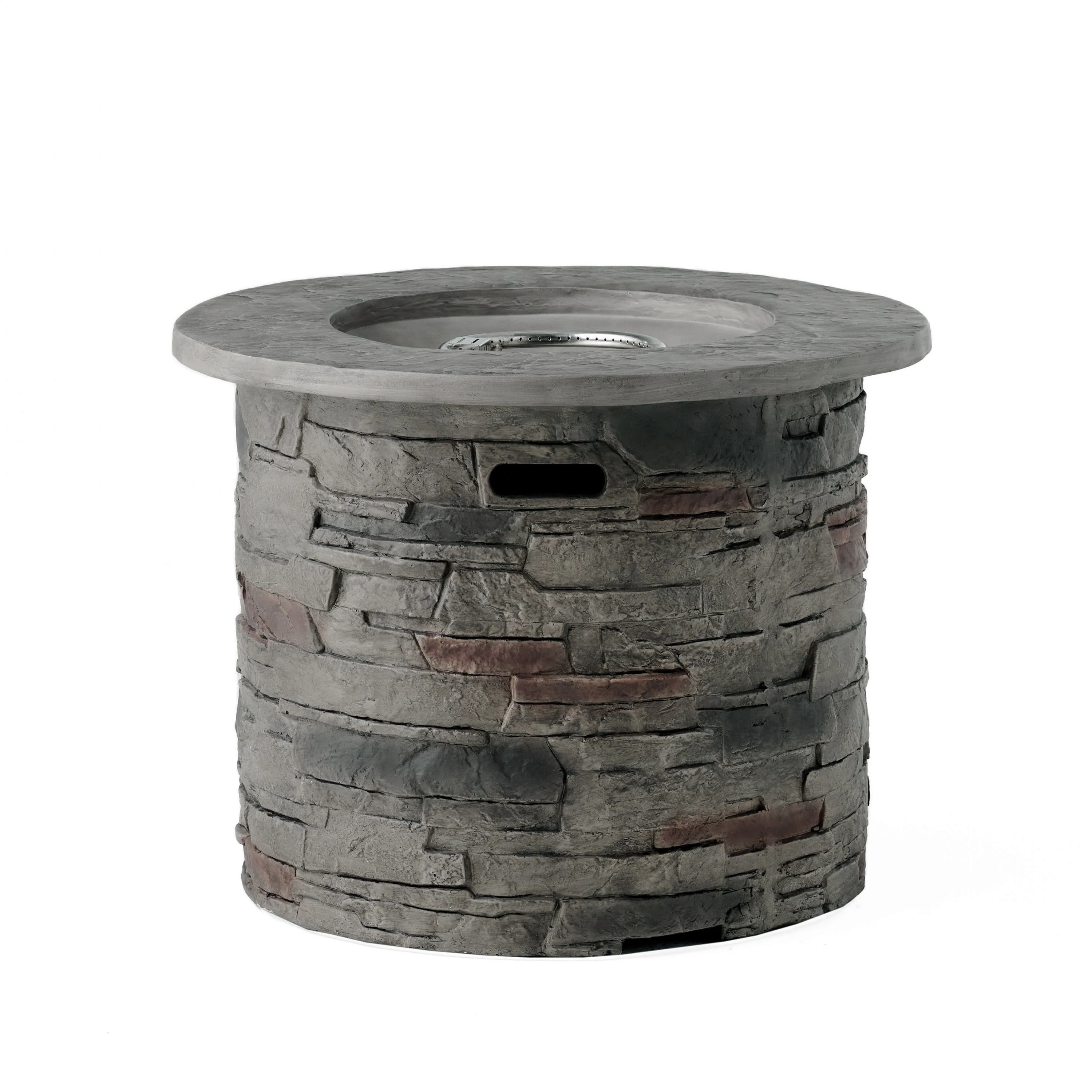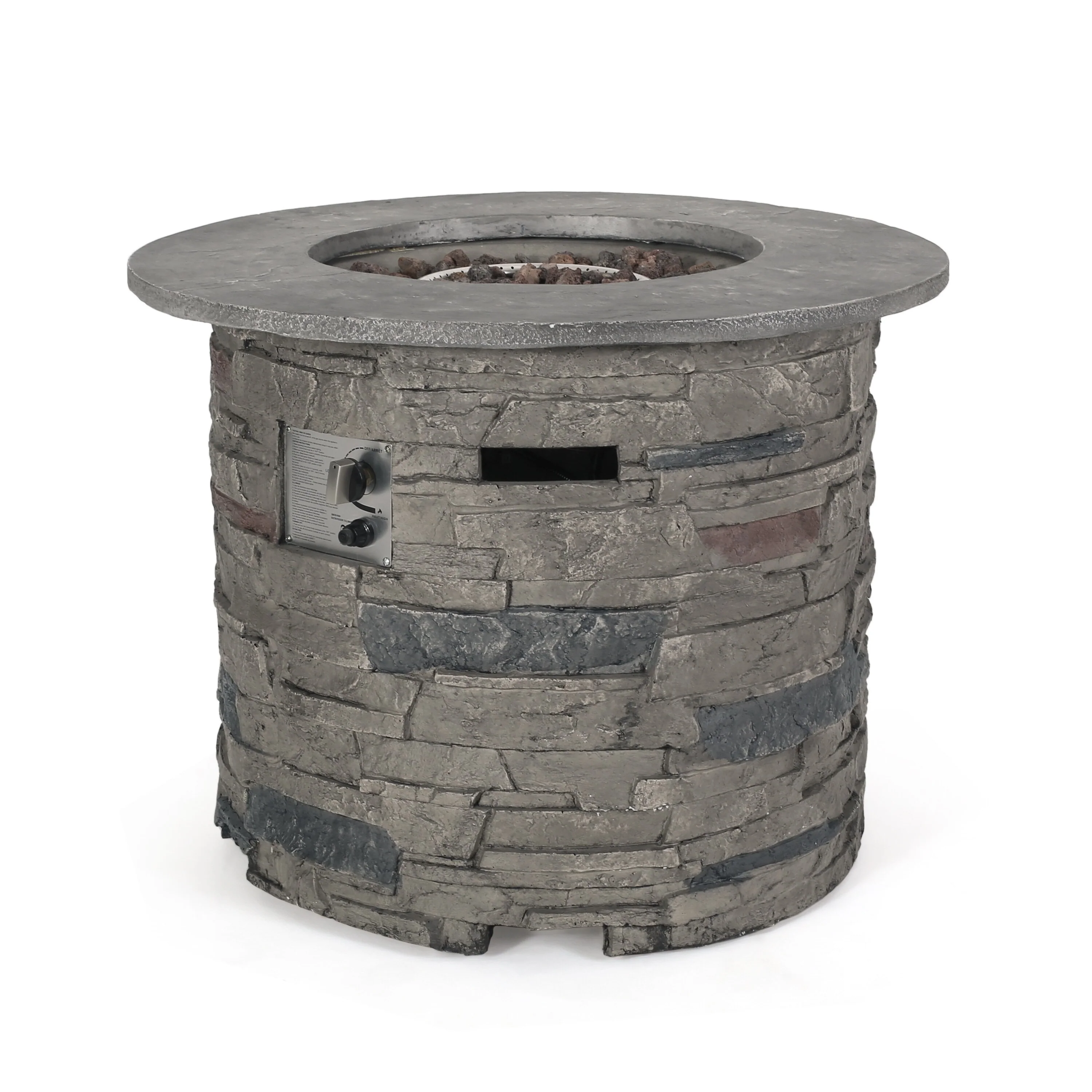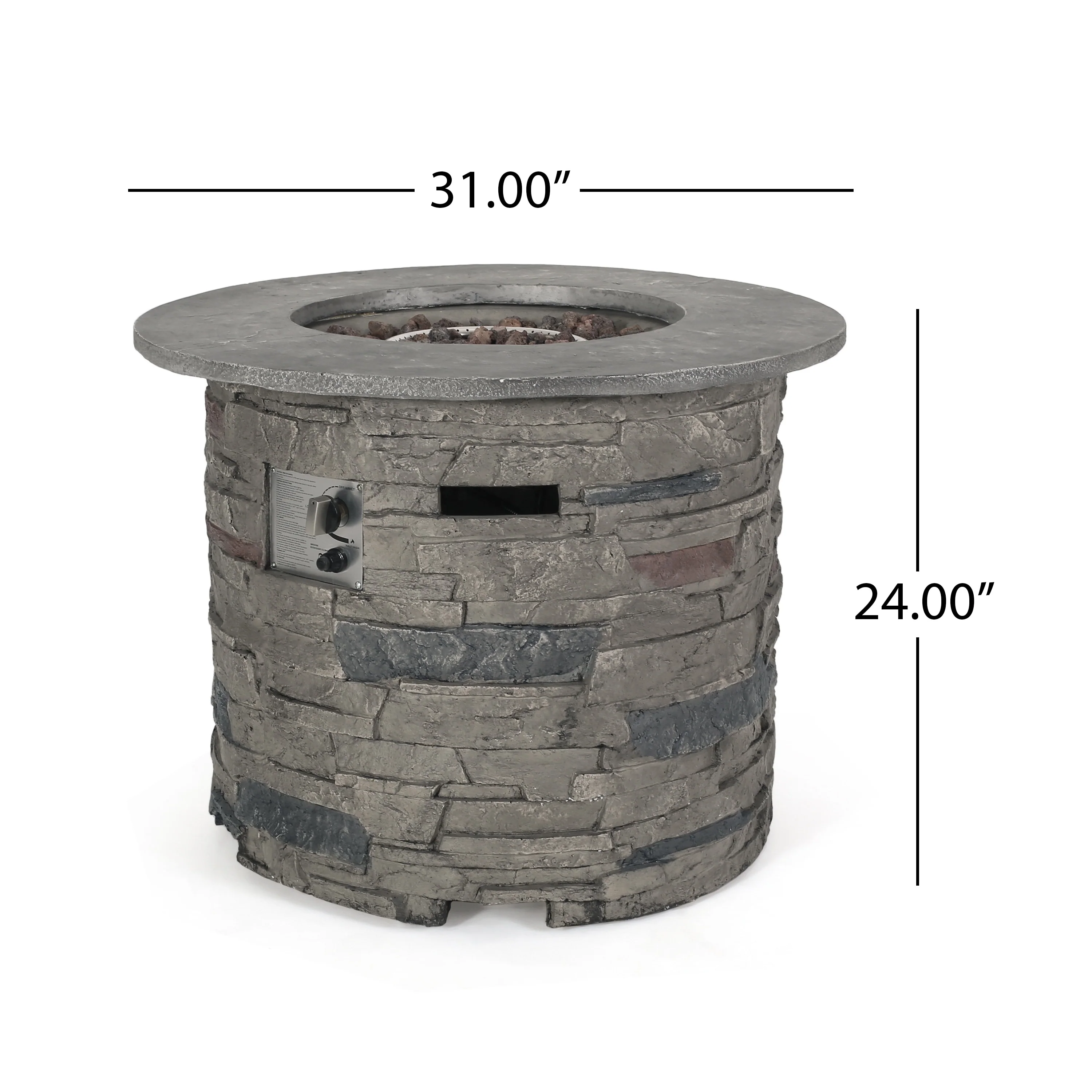 Enjoy your own mini camping experience with your family in your own back yard, complete with our stunning fire pit. Highlight your patio or backyard space with this luxurious fire pit with a conveniently included tank space while keeping your company snug with its all-inclusive seating possibilities. Its simply shaped structure, classic stone finish, and black top bring you and your guests together for intimate conversations and endless fond memories. Complete with brilliant lava rocks, this centerpiece is an excellent addition to any outdoor set.