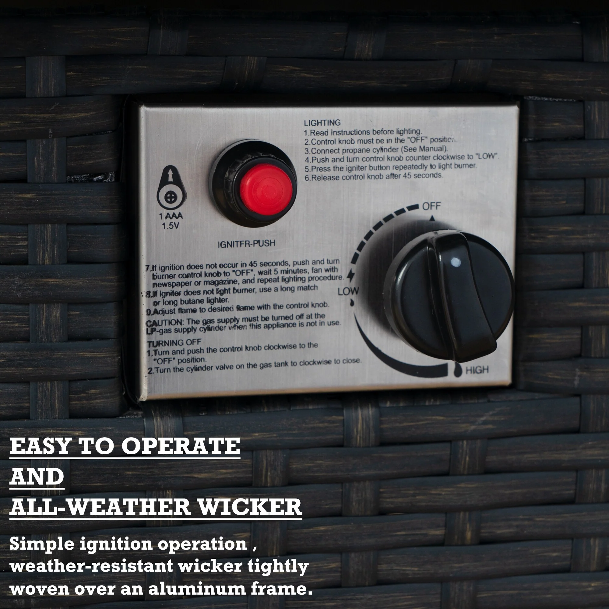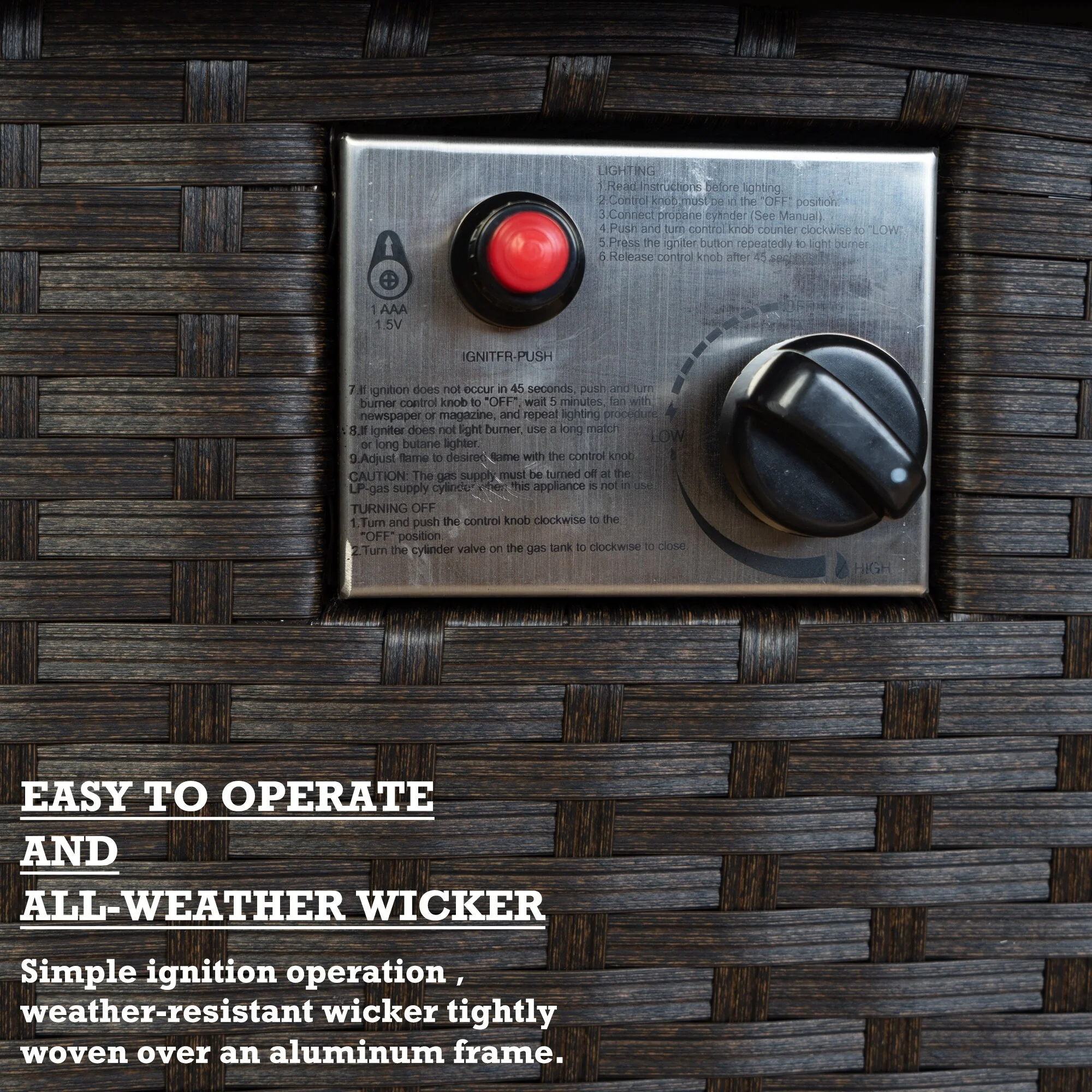Add some excitement and sophistication to your outdoor space with Kozyard's 50,000 BTU Outdoor Wicker Patio Propane Gas Fire Pit Table. Designed with both elegance and fun in mind, this multi-functional fire pit table is perfect for family nights or entertaining guests. It features a sleek and classic design that is sure to impress, while the high-quality materials used in its construction ensure durability and longevity. The frame is rust-proof, and the weather-resistant, hand-made Polyethylene (PE) wicker adds triple protection. The glass stones provide a stunning and attractive effect that adds a unique look to your fire pit. You can also use this fire pit table as an outdoor dining table, coffee table, or casual bar by simply covering it with the lid. With a turn of a button, you can easily light and control the flames for a cozy and warm ambiance. The ETL certified gas fire pit unit burns efficiently at 50,000 BTU and is ensured to be qualified and safe to use. Assembly is easy, and maintenance is a breeze with the included instructions and hardware.