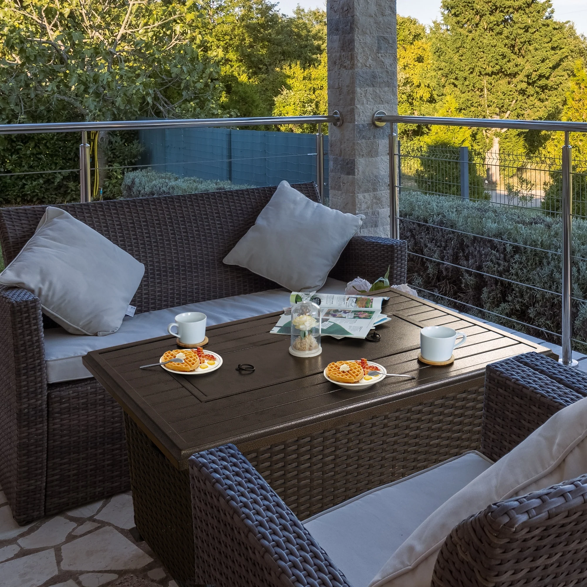 - Multifunctional Gas Fire Pit Table: Includes glass cover for conversation in cold weather, use as an ordinary table for summer days, and a free cover for storage.