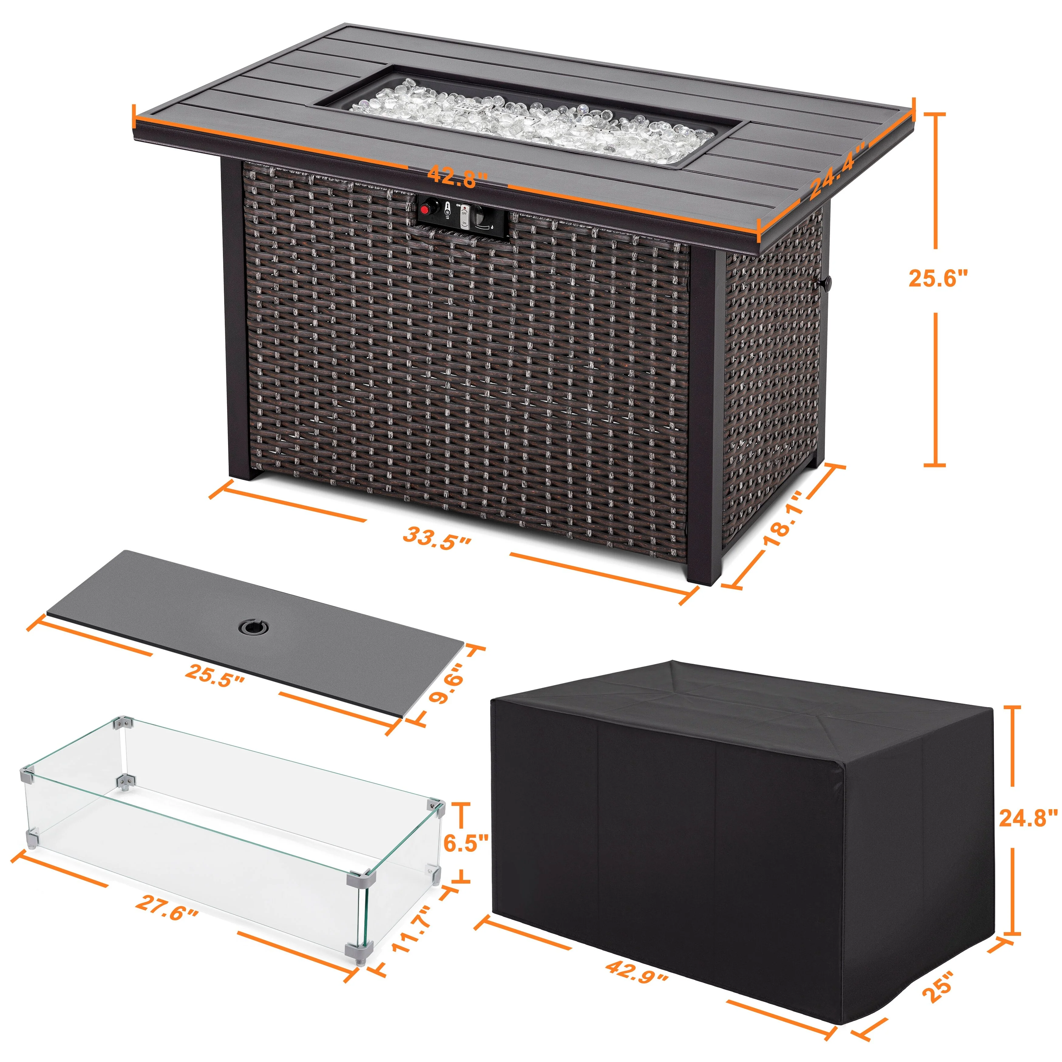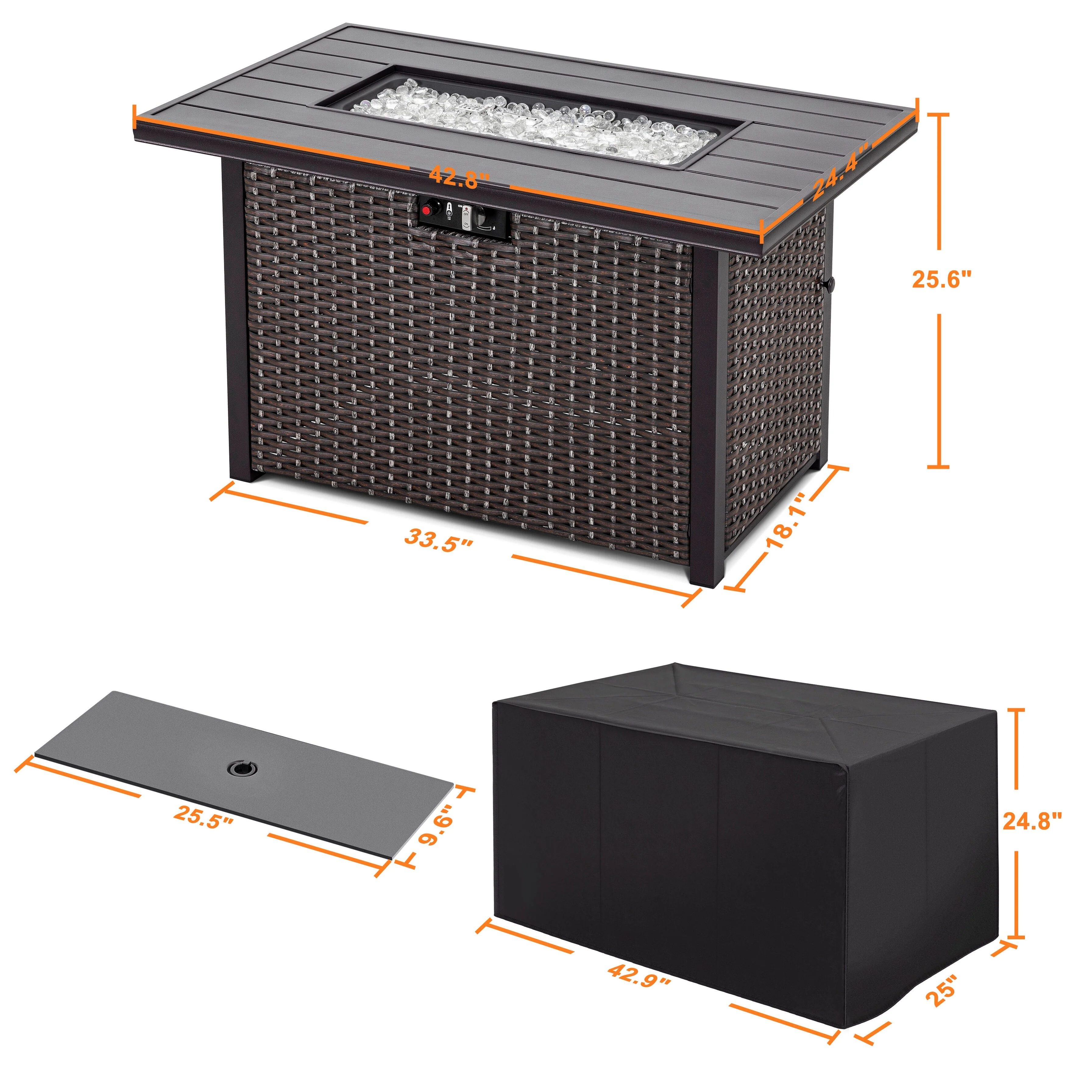 - 2-in-1 Fire Table: This 43*24*25 inch fire pit table provides the perfect practicability and is ideal for decorating yard, poolside, balcony, garden, and porch. The distance between the table side and the fire pit is 8.6 inches, giving enough space to place plates, wine glasses, etc. It can also be used as an outdoor dining or coffee table all year round by simply covering the burner with the included lid when the flames are off.