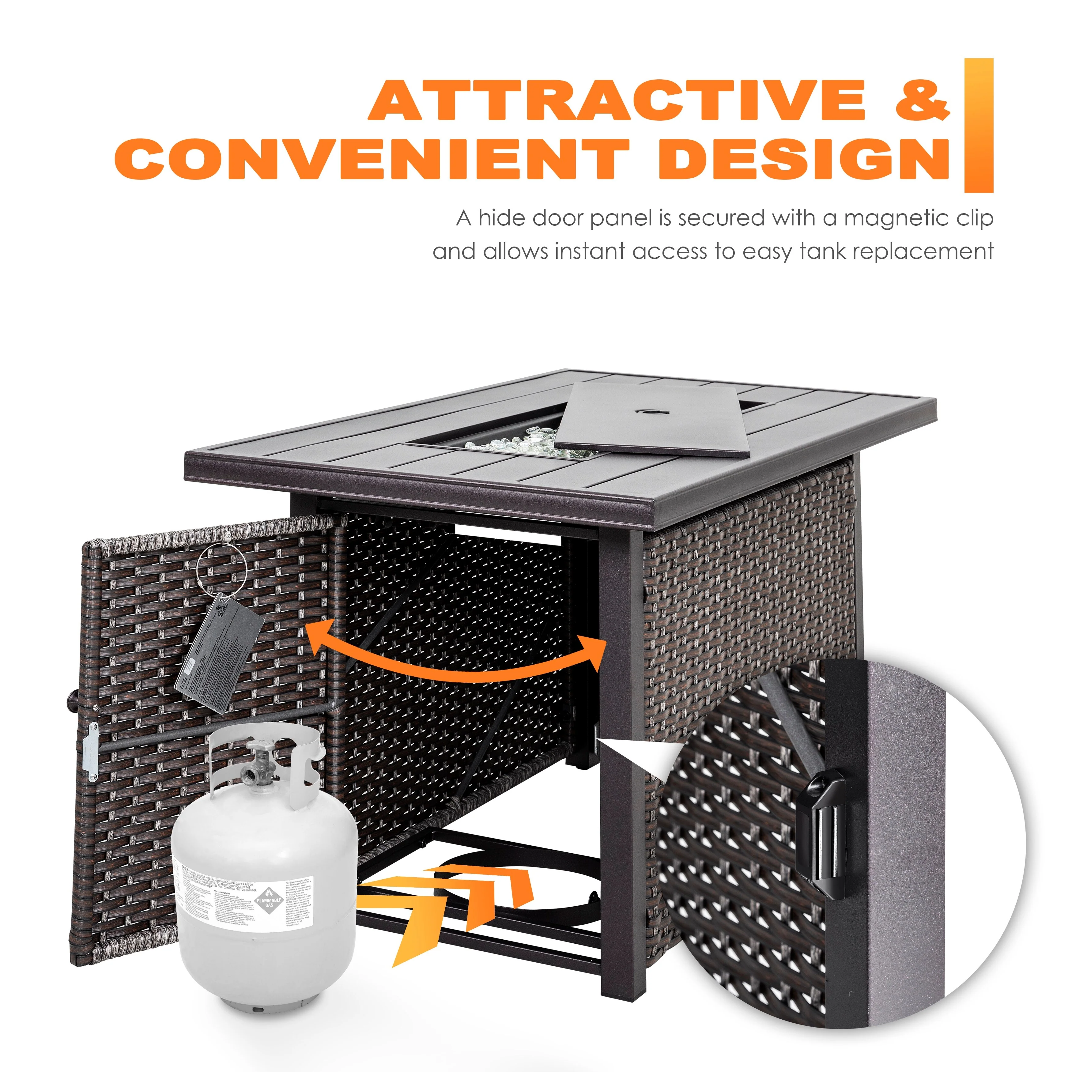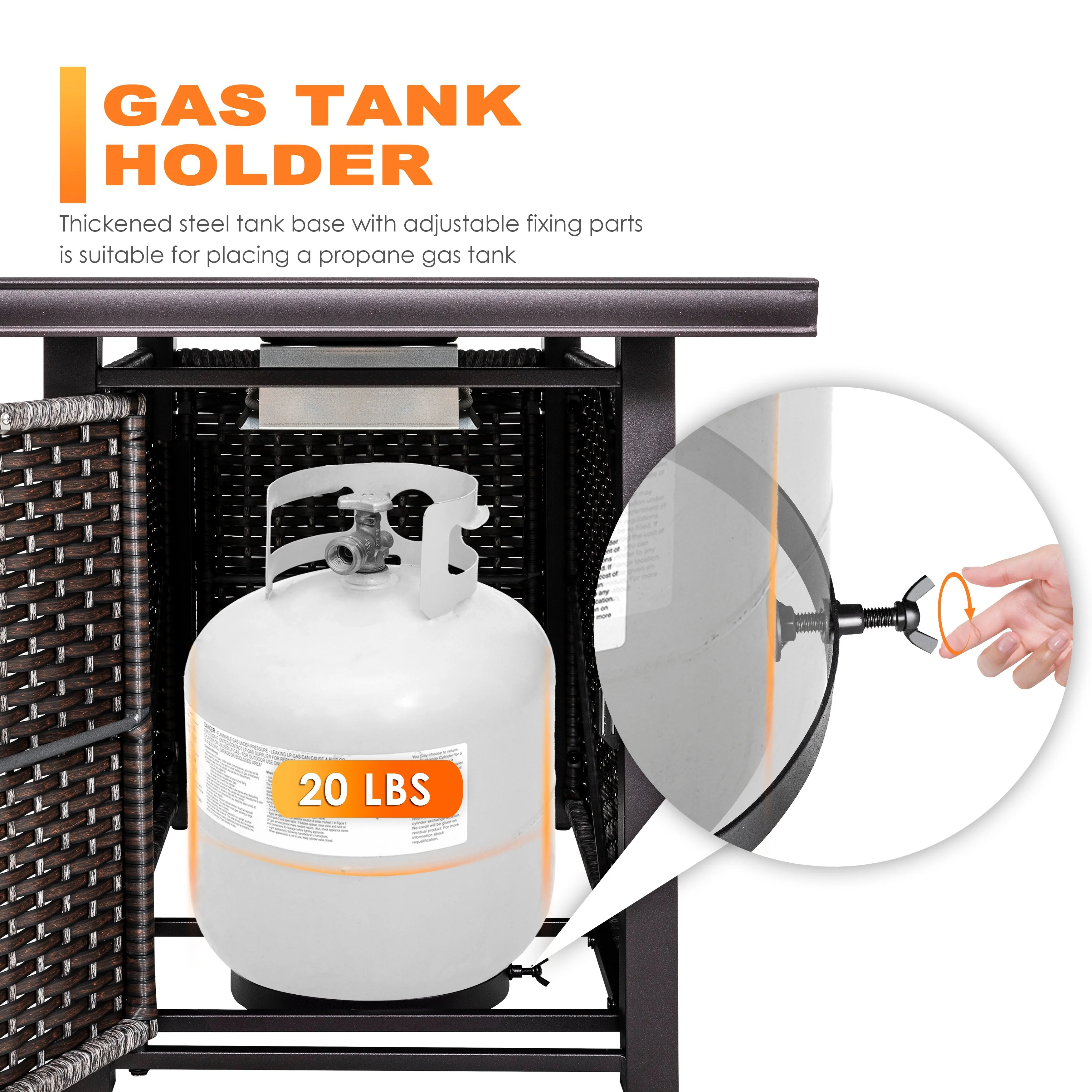 - Durable Metal Material: Heavy-duty rust- and weather-resistant aluminum panels with a matching iron frame protect a powerful heating element and ensure years of outdoor heating. Hide door panel with a magnetic clip allows instant access for easy tank replacement. Thickened steel tank base can hold a standard 20-pound propane tank. The insulating metal plate under the fire bowl prevents the gas hose from melting due to high heat.
