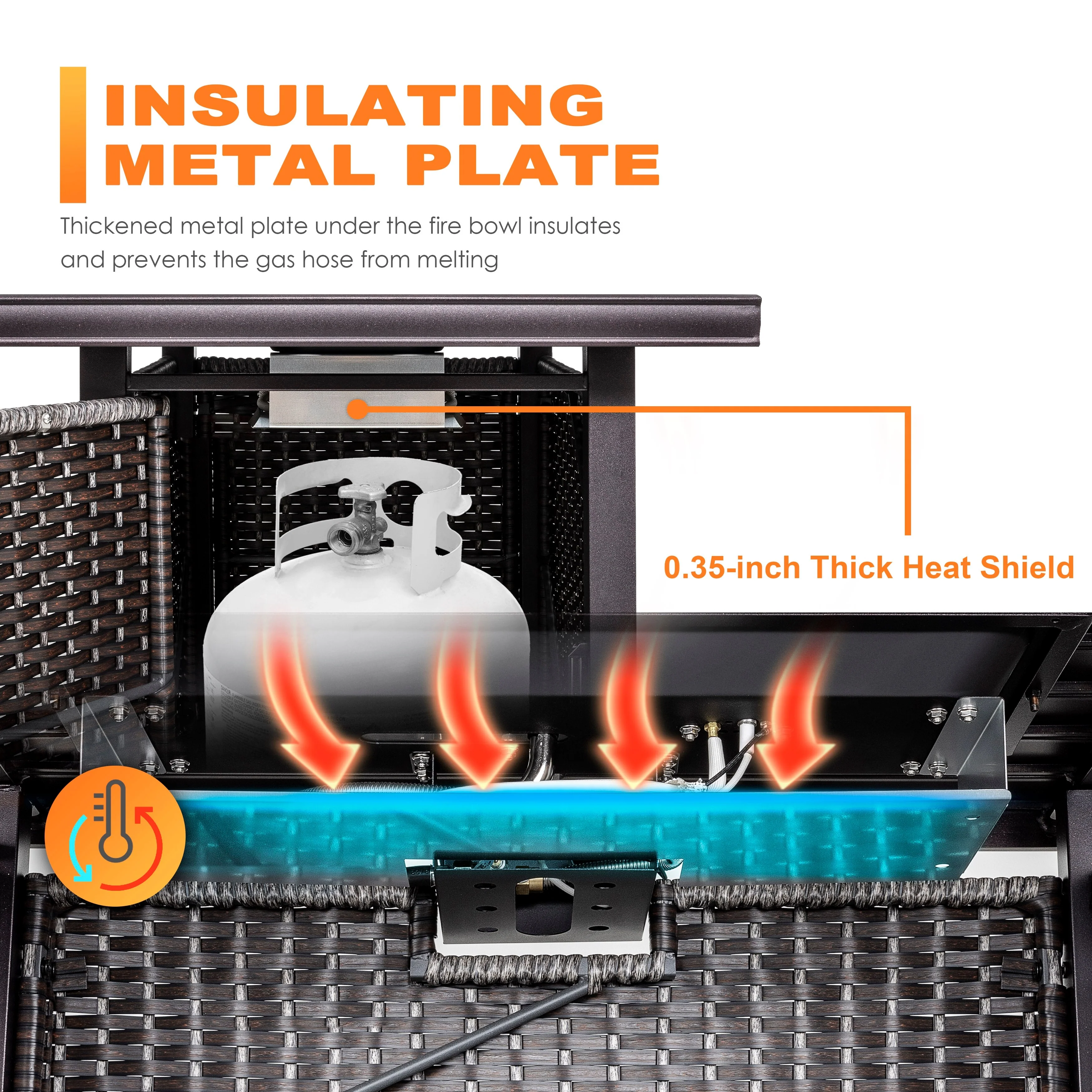 - Durable Metal Material: Heavy-duty rust- and weather-resistant aluminum panels with a matching iron frame protect a powerful heating element and ensure years of outdoor heating. Hidden door panel with a magnetic clip allows instant access for easy cylinder replacement. Thickened iron tank base can hold a standard 20-pound propane gas tank (not included). The insulating metal plate under the fire bowl prevents the gas hose from melting due to high heat.