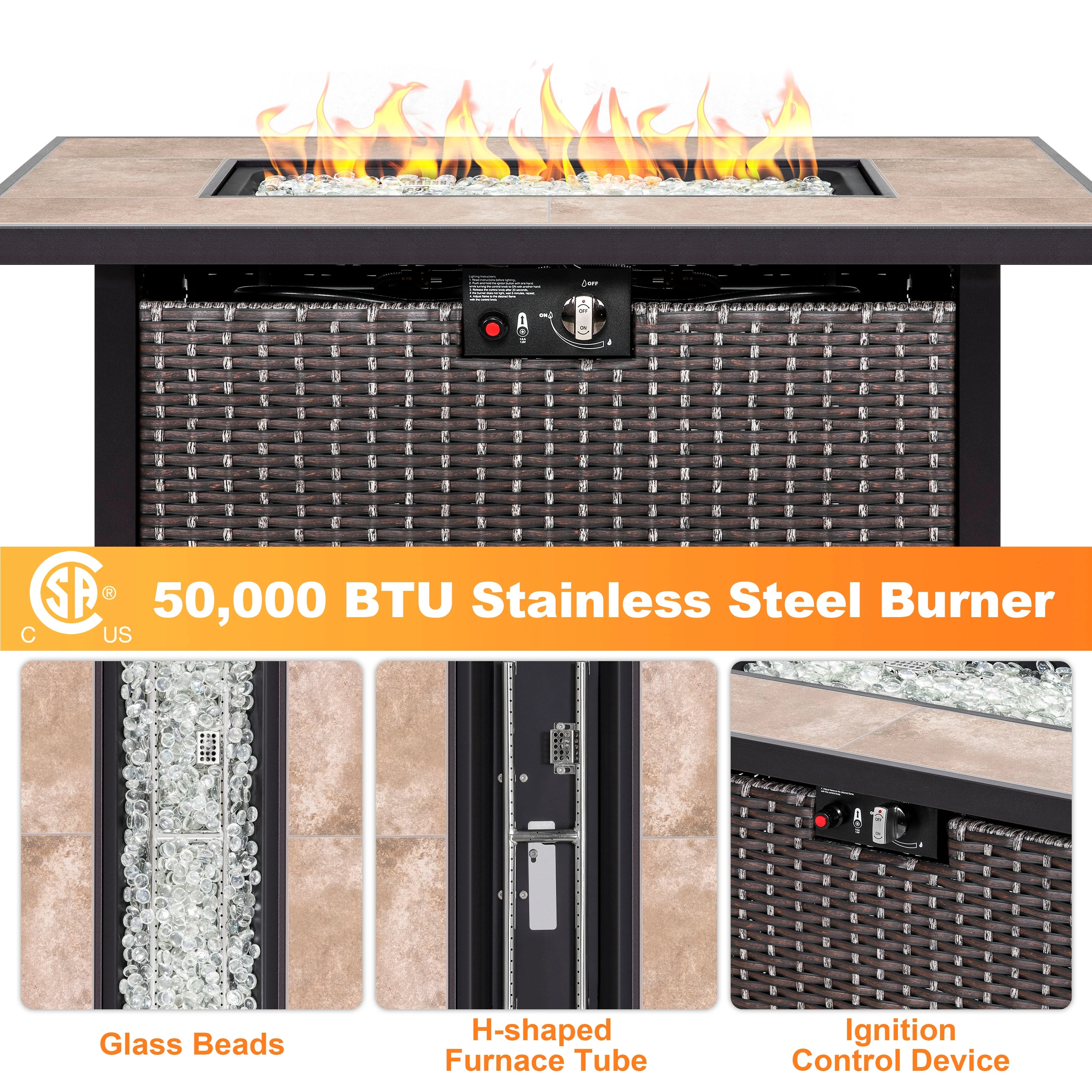 - Made to Last: H-shape 304 stainless steel pipe provides broader scope and better distribution of fire flame. The complimentary glass beads add extra beauty and fun to the fire burning. Strengthened Iron bars behind each side panel offer stronger supporting capacity. The fire table's control knob is made of zinc alloy for a longer life span. And the thickened steel tank base can hold a standard 20-pound propane tank.