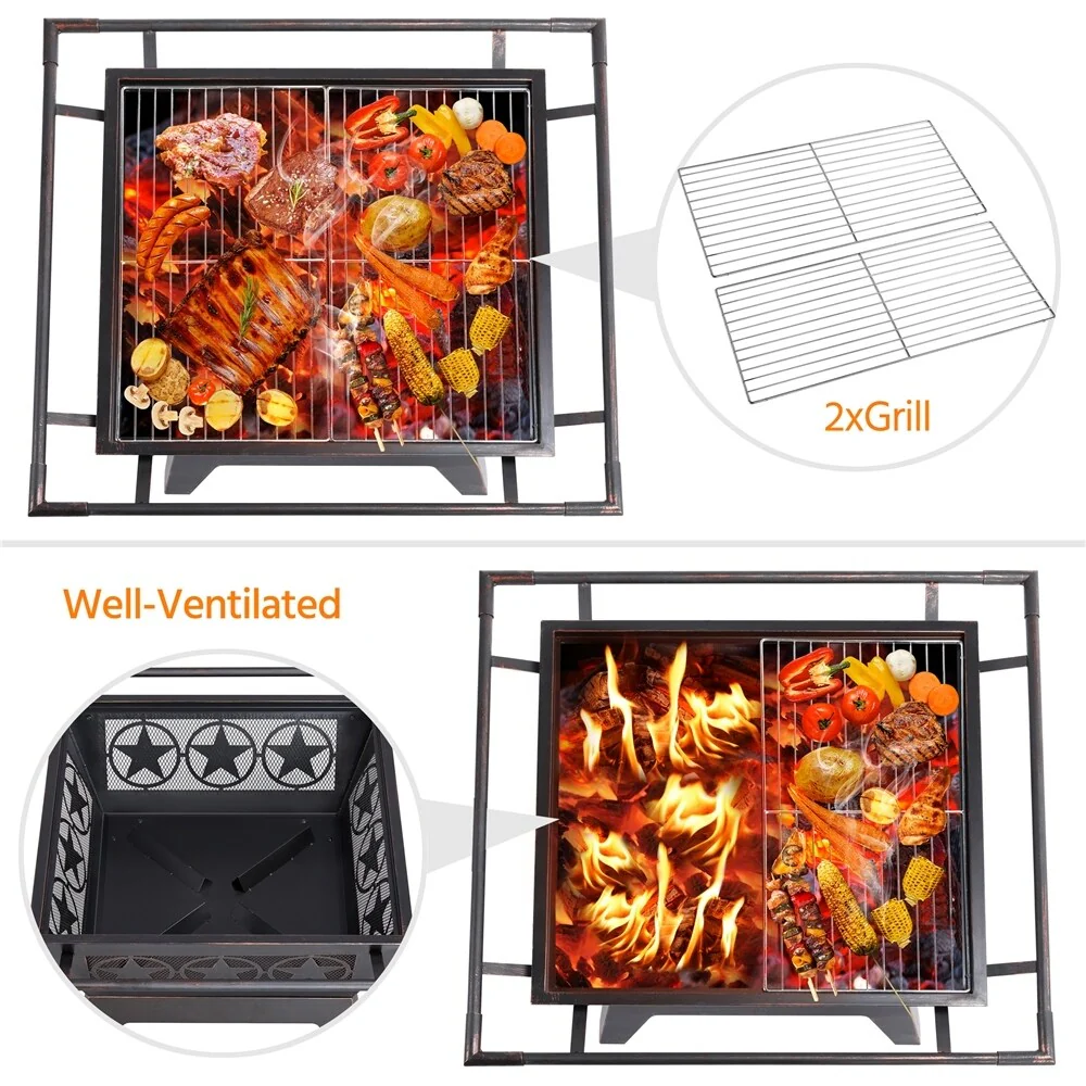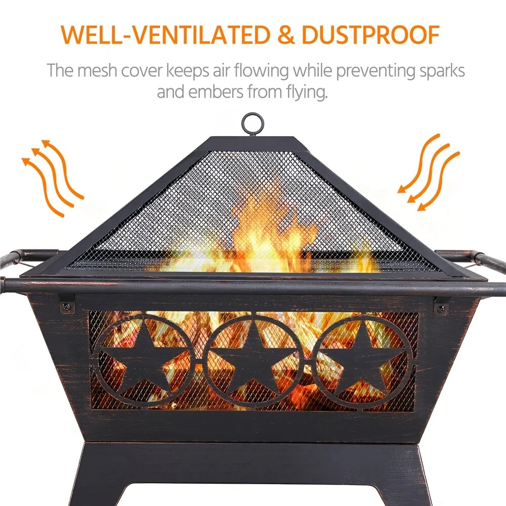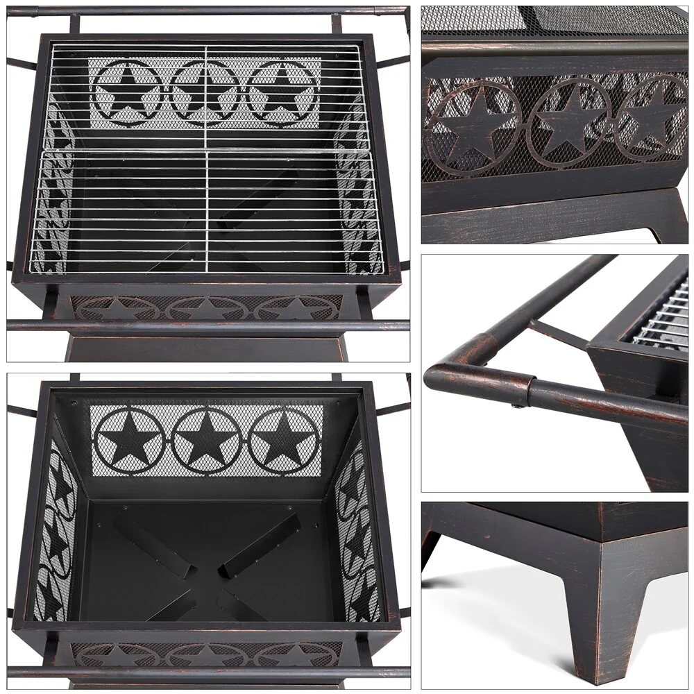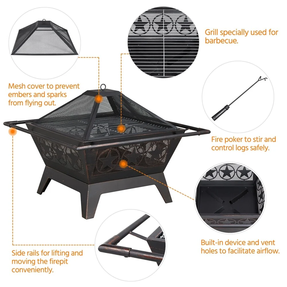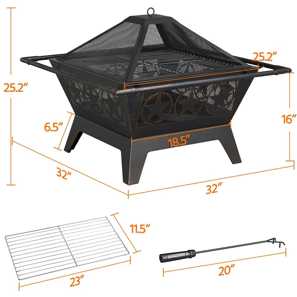 This Yaheetech 32' Iron Fire Pit is the perfect addition to your garden or backyard. Made of durable metal with a wear-resistant coating, it comes with a mesh cover, 2 grills, 4 side frames, 1 base, and 1 fire poker, all with a beautiful star pattern design. Ideal for heating in winter, barbecues in summer, or any outdoor party, this fire pit is well-ventilated and easy to observe. Its thoughtful design includes a rubber handle on the fire poker to protect you from burns.