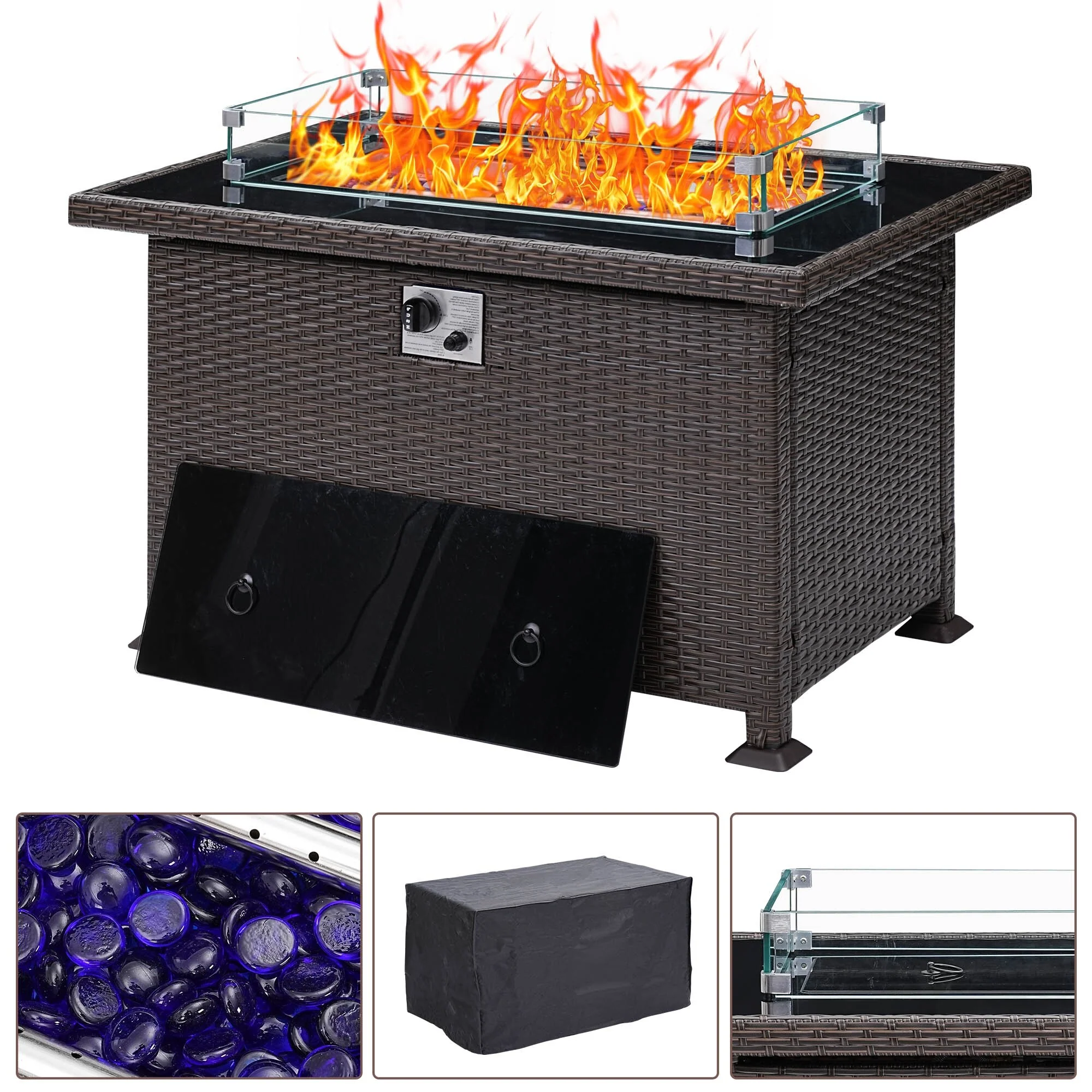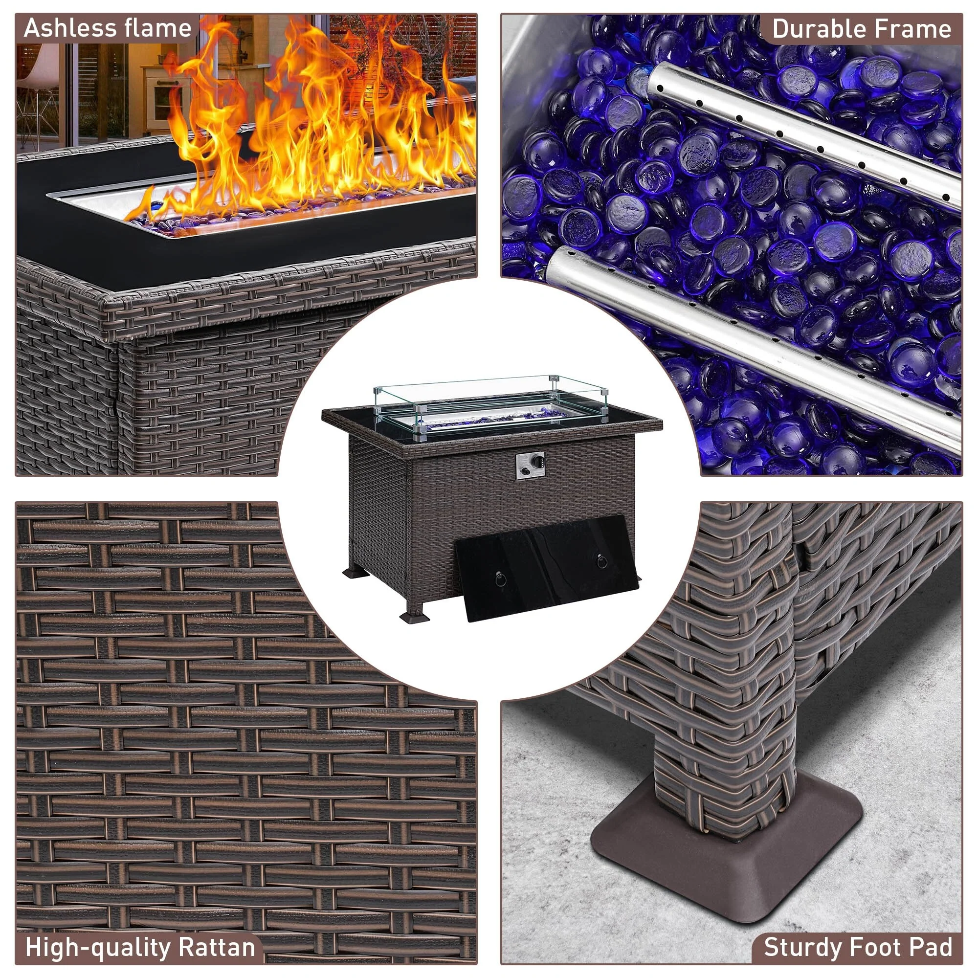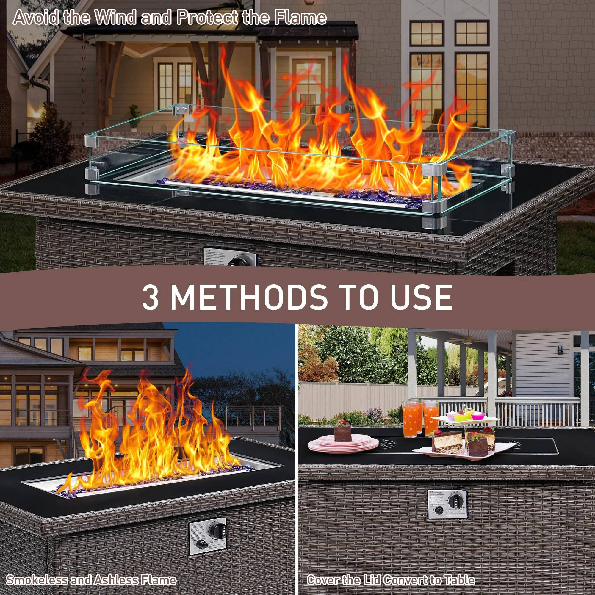 Enjoy your outdoor time with this powerful fire pit table. CSA certification ensures you use the fire pit table safely and securely while enjoying the party. The upgraded all-weather wicker is a perfect match for your patio decor, while glass beads accentuate an active fire. We also provide a durable fabric cover to protect your table from the elements, and a removable lid to transform your fire pit into an elegant dining table, coffee table or casual bar, beautify to your outside backyard or your garden