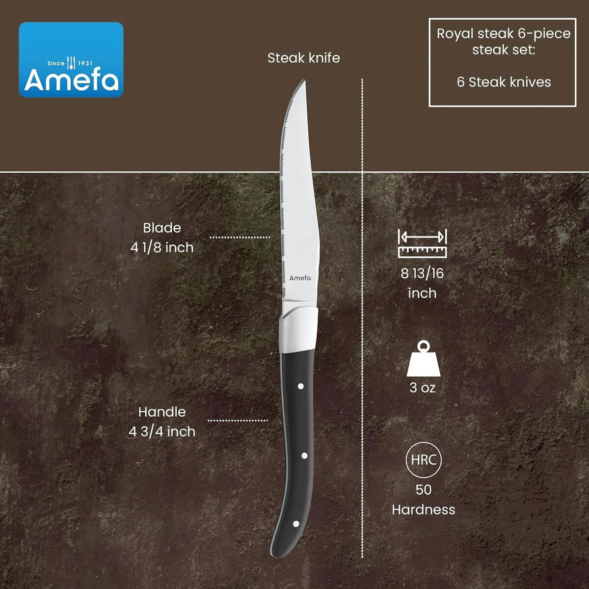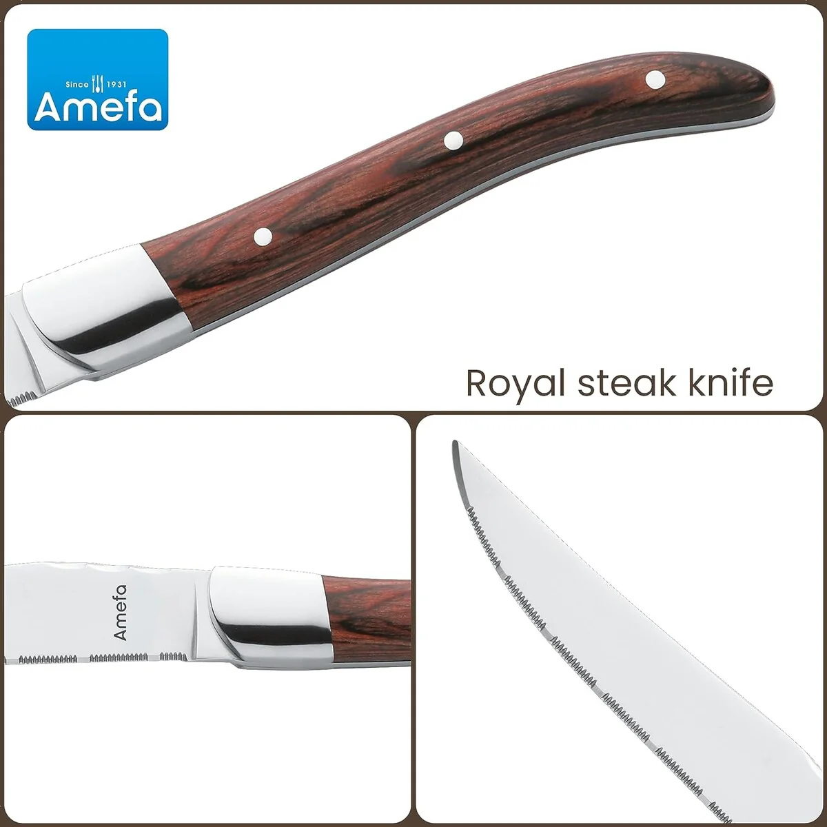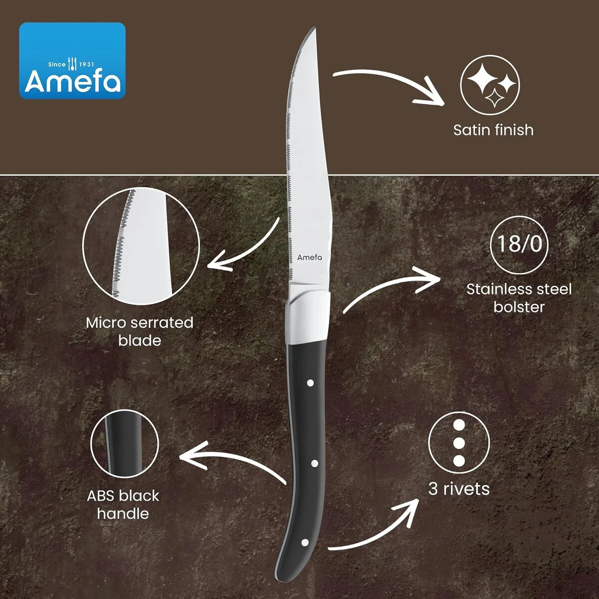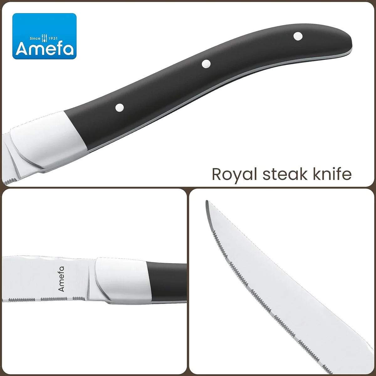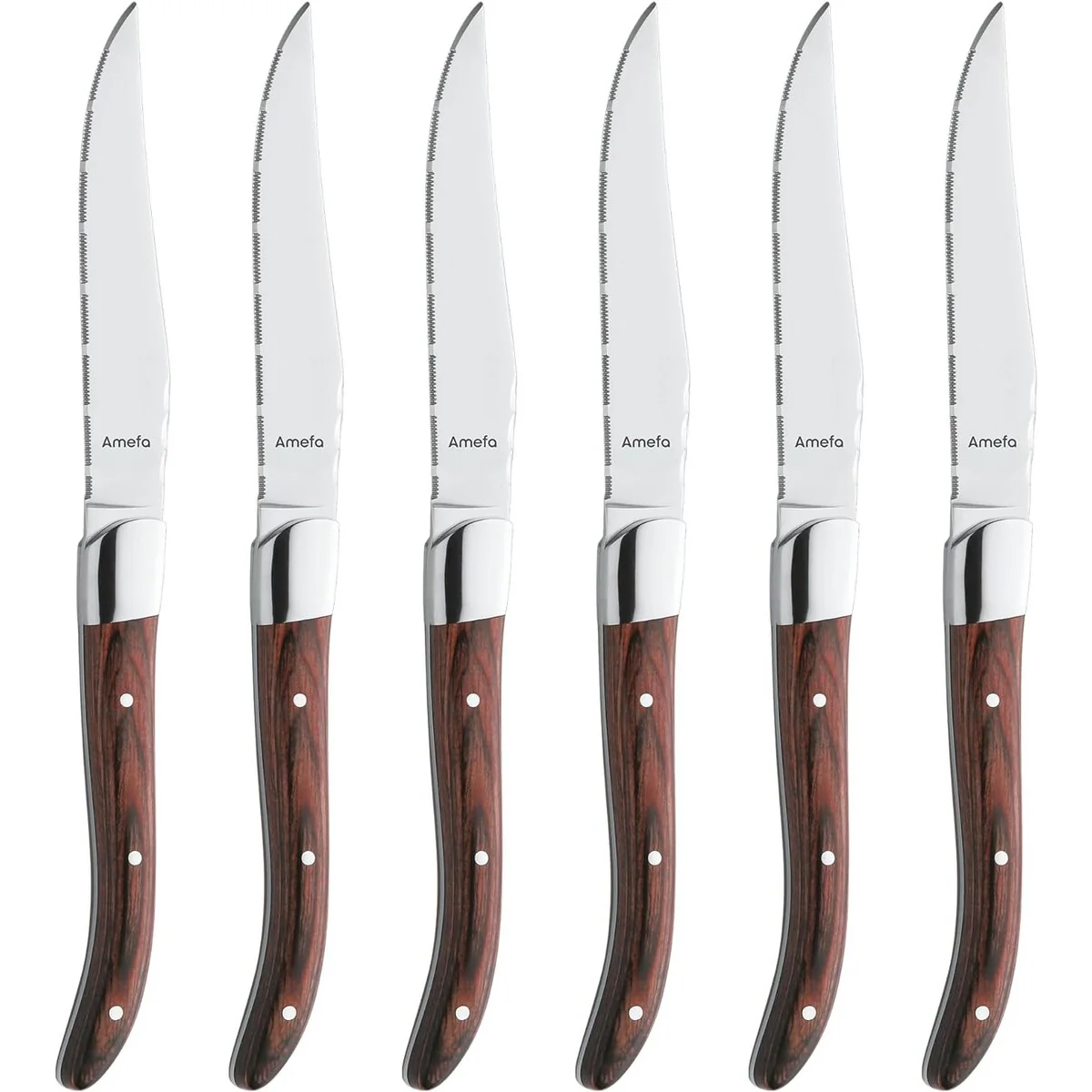 Amefa Royal Steak Knives, Set of 6, Premium Hardened Stainless Steel, Triple Rivet Ergonomic Handle Design, Serrated Edge 4 Inch Blade Steak Knife, Dishwasher Safe - New