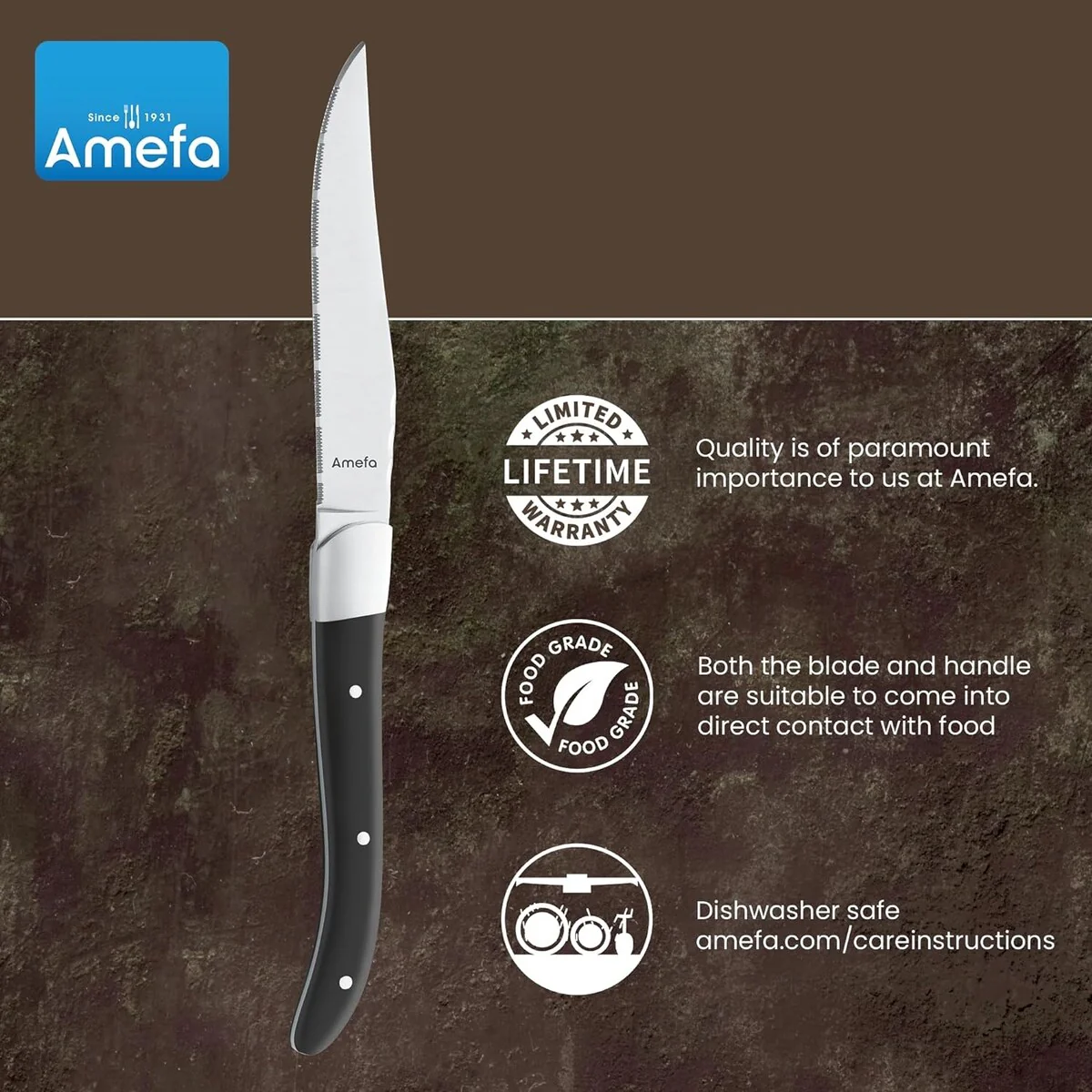 - Care Instructions: visit amefa.com/careinstructions , dishwasher safe, dry them before storing, avoid steel wire brush, hard sponge, or any other hard and rough material.