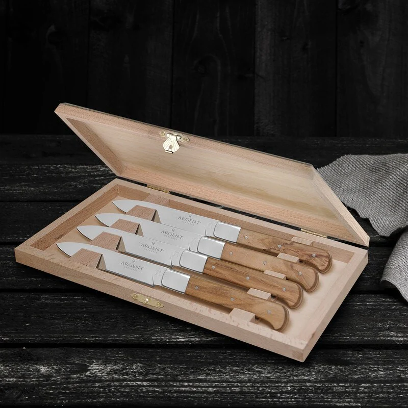 Every so often a cutlery set appears that leaves you speechless; meet the Lynden 4 Piece Steak Set by Argent Orfèvres™. Invite a taste the outdoors into your home and onto your tabletop with this striking and memorable steak set, crafted in premium 18/10 stainless steel. Striped down—Lynden's organic, Olive Wood handles together with its exquisitely sharp, polished blades will whisk you away to the land of luxury while igniting a sense of carefree sensibility. As an added bonus, our set comes with a wood storage box for safekeeping.