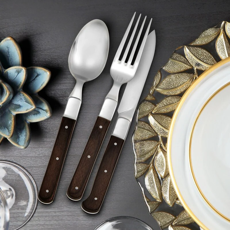 Bring a touch of mother nature into your homes and onto your tabletops with St. Michel. This striking 18/10 20 Piece Set has dark, organic wood handles atop polished head pieces that whisk us away to the land of luxury while igniting a sense of carefree sensibility within us all.