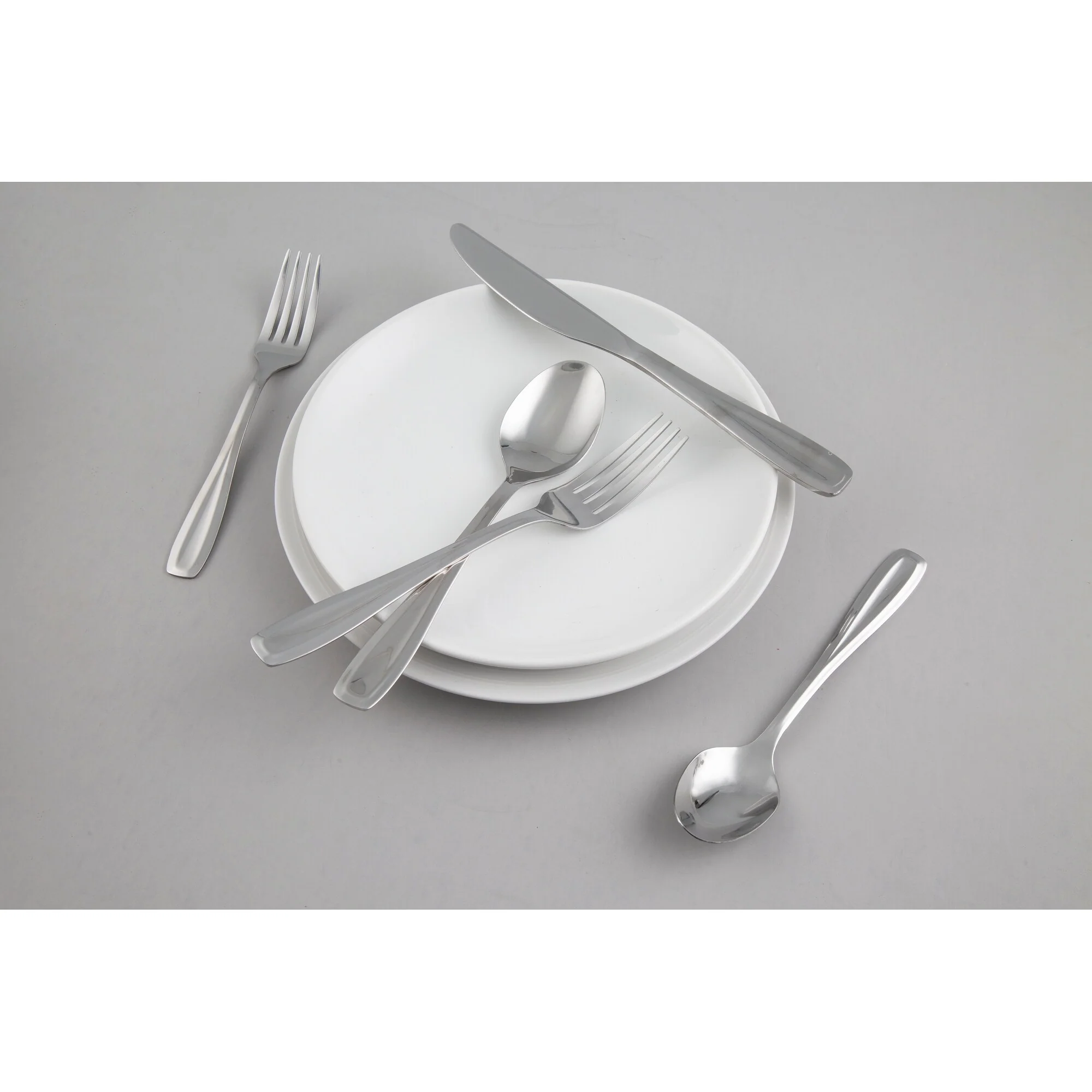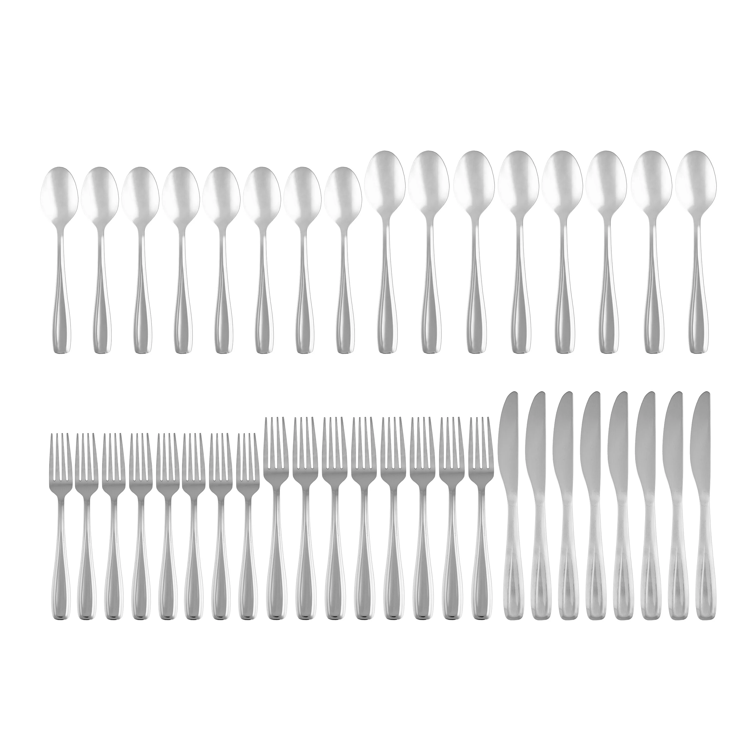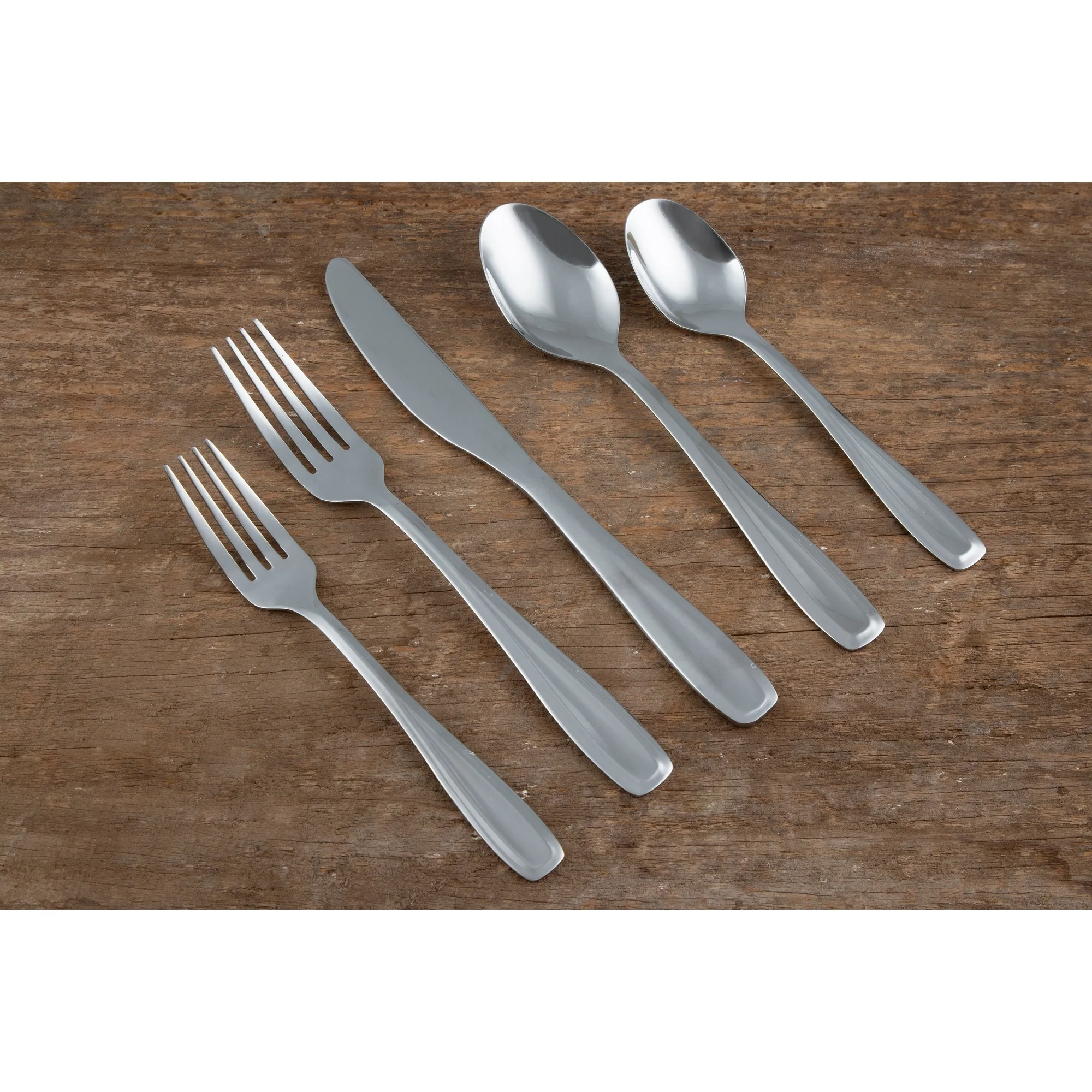 - Each place setting includes salad fork, dinner fork, dinner knife, dinner spoon, and teaspoon