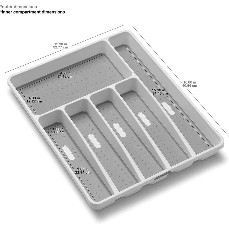 The madesmart Classic Large Silverware Tray is a 6-compartment tray that fits in any kitchen to help with silverware and utensil organization. The rounded corners and interior soft-grip lining makes this silverware tray highly functional, easy-to-clean, and aesthetically pleasing. It features non-slip rubber feet and a soft-grip lining to ensure items stay in their place. Made from high-quality, BPA-free plastic.