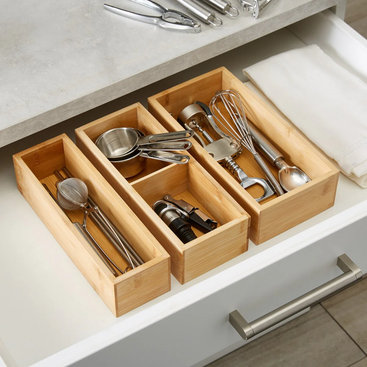 Introducing our Kitchen Details Bamboo 3 Piece Drawer Organizer Set, designed to bring order and efficiency to your kitchen drawers. This set includes one medium piece, one large piece, and one 2-compartment piece, offering versatile organization solutions for a variety of kitchen accessories.